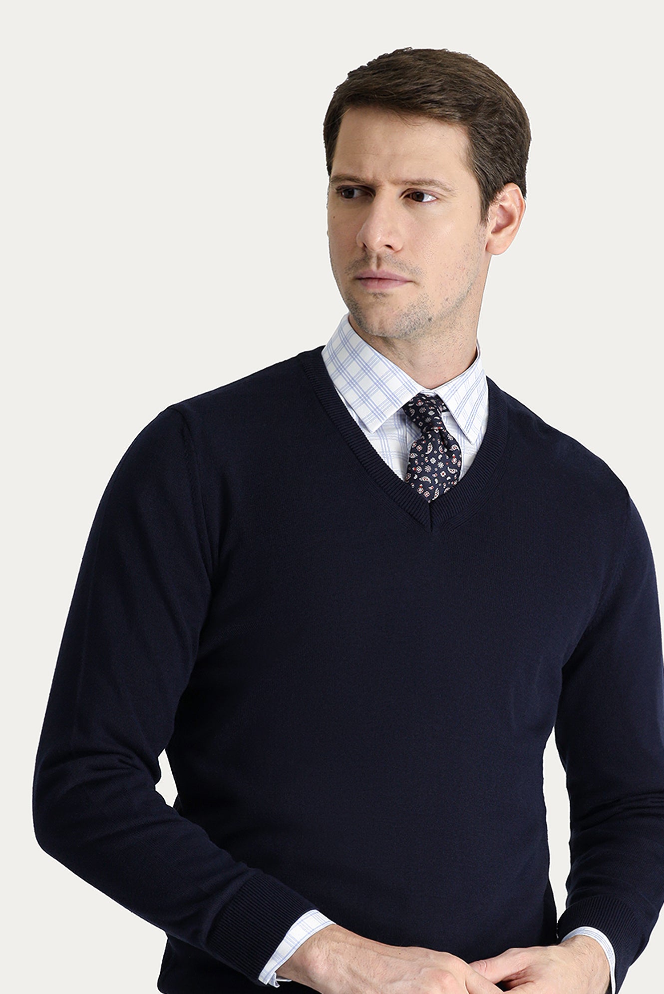 Koyu Lacivert V Yaka Regular Fit Pamuklu Triko Kazak