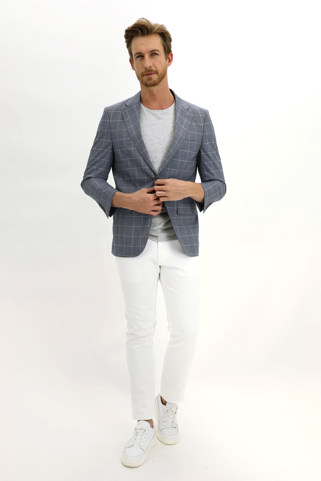 Koyu Mavi Relaxed Fit Rahat Kesim Kareli Ceket