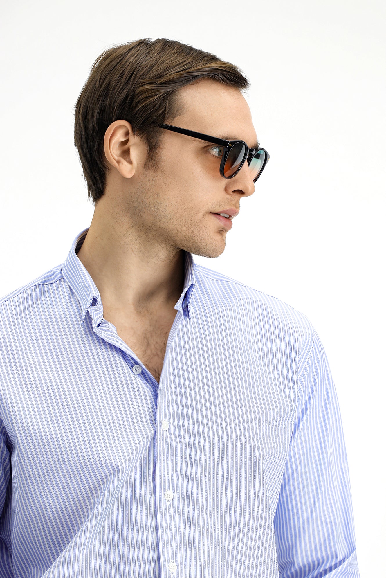 Koyu Mavi Uzun Kol Klasik Çizgili Pamuk Gömlek