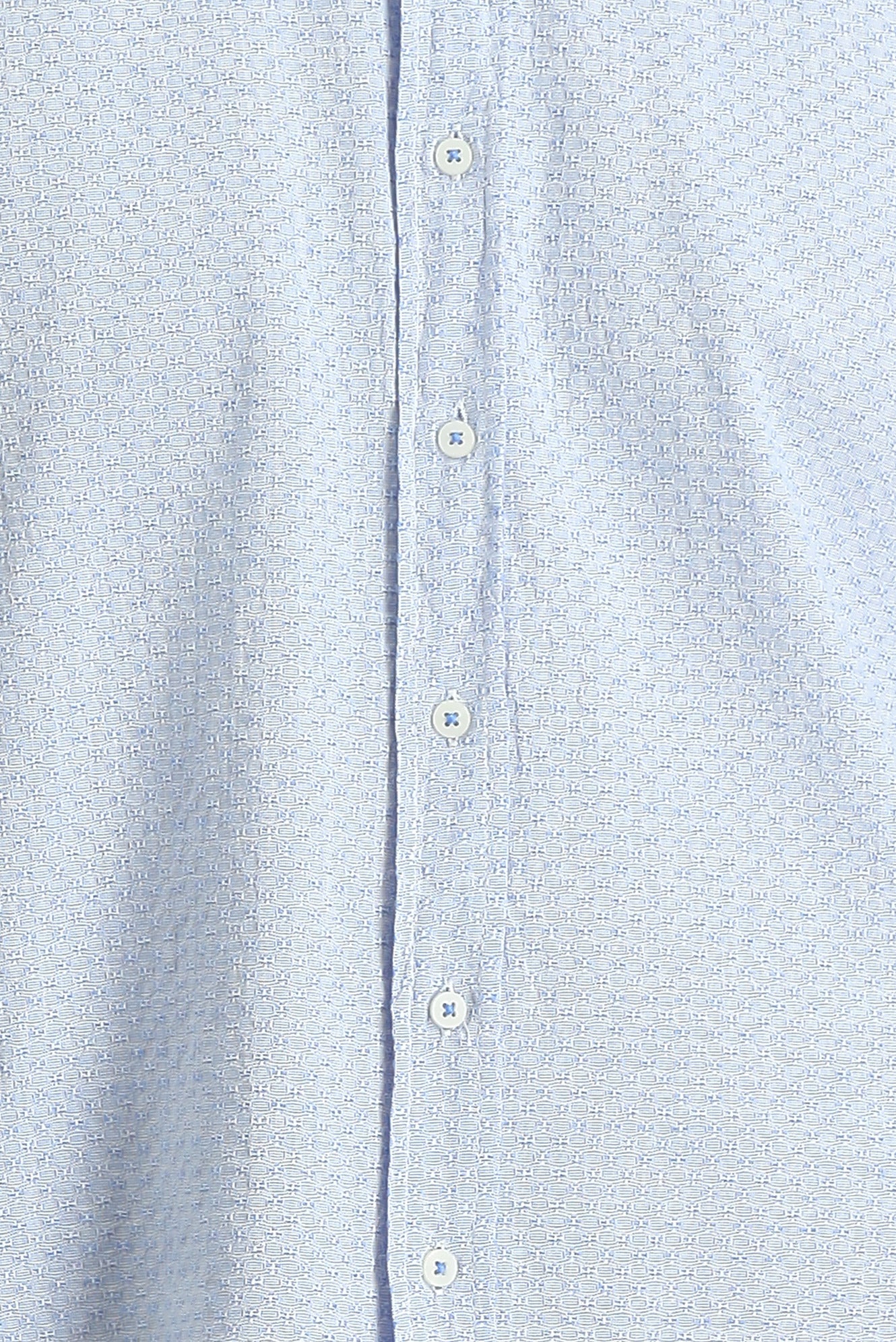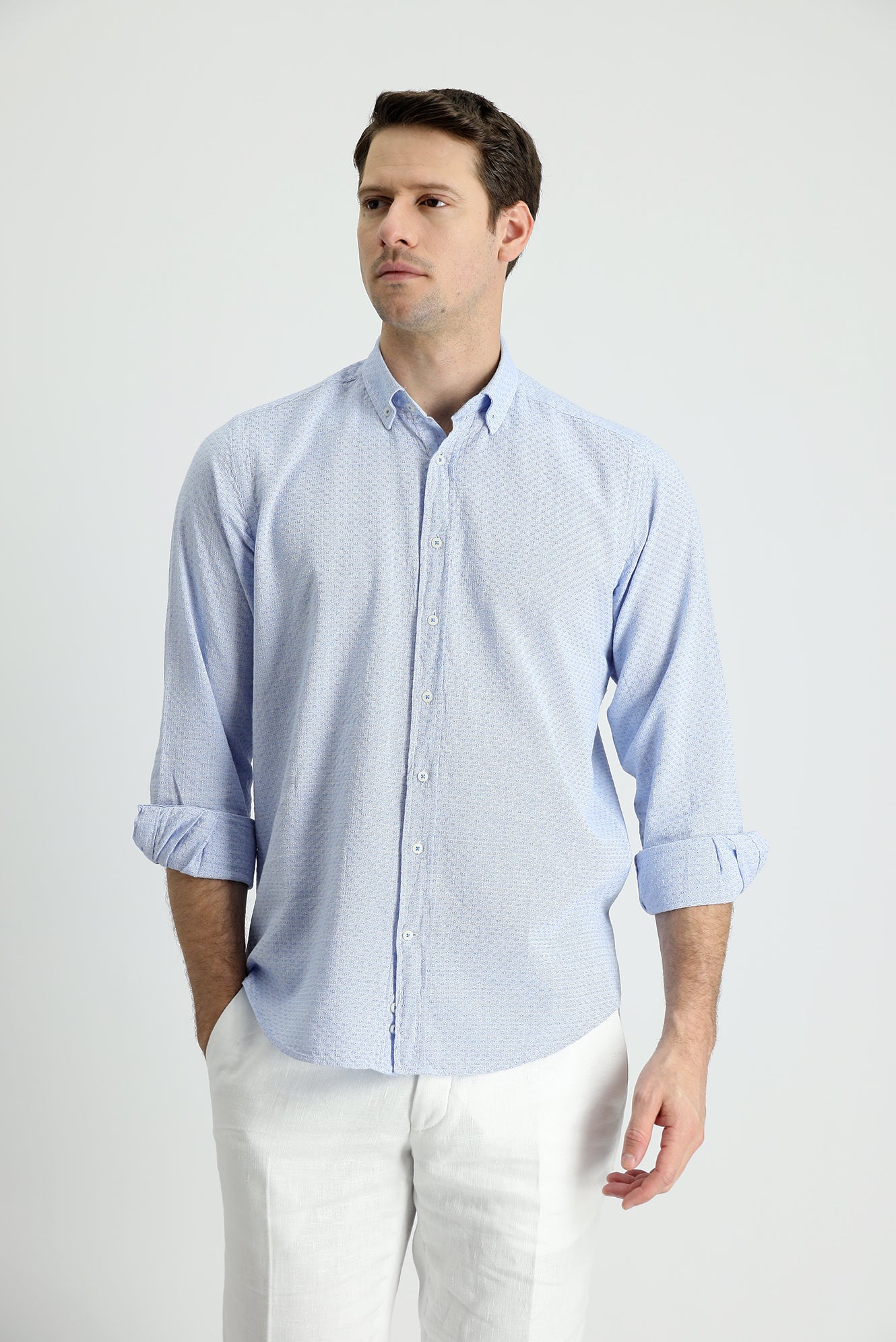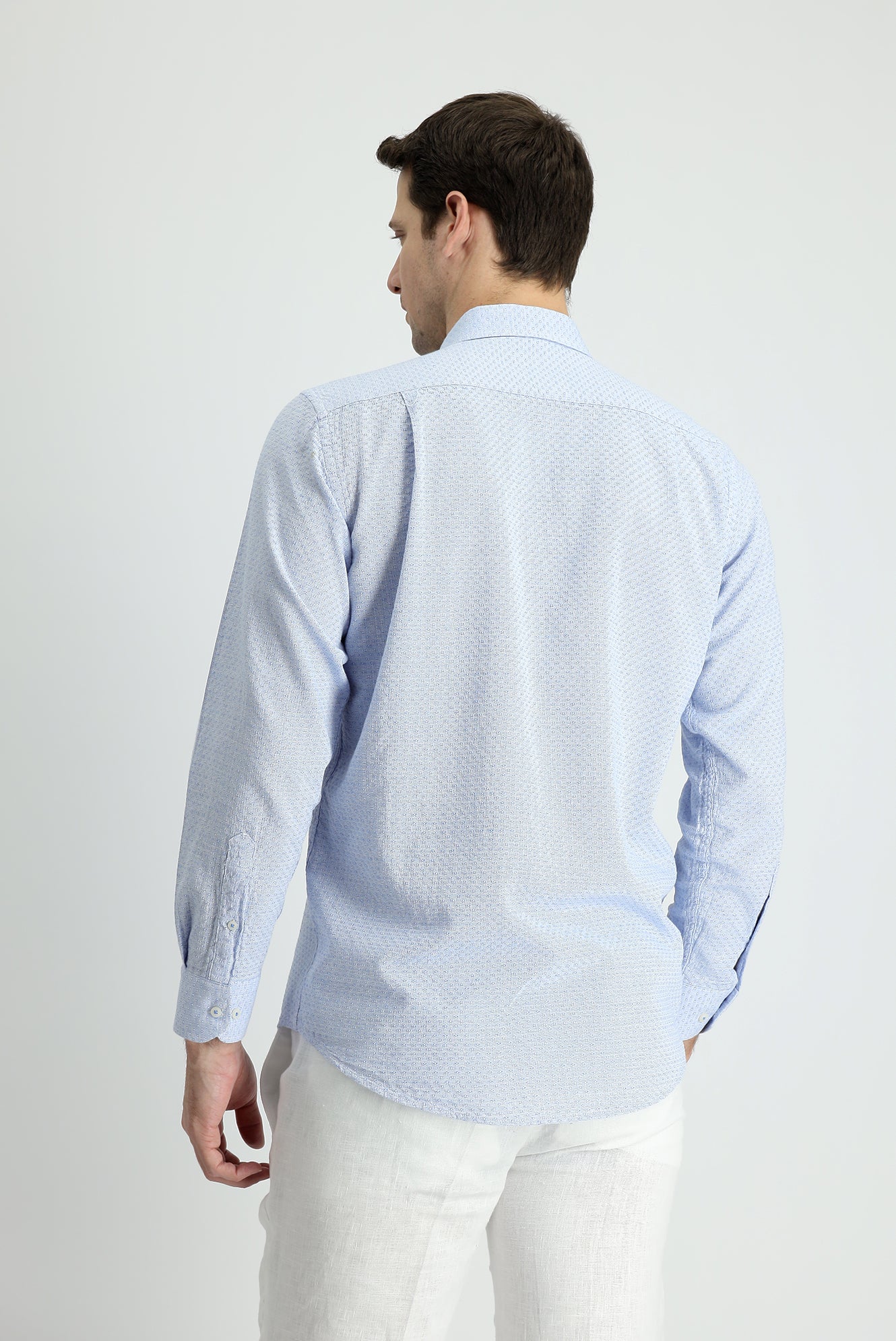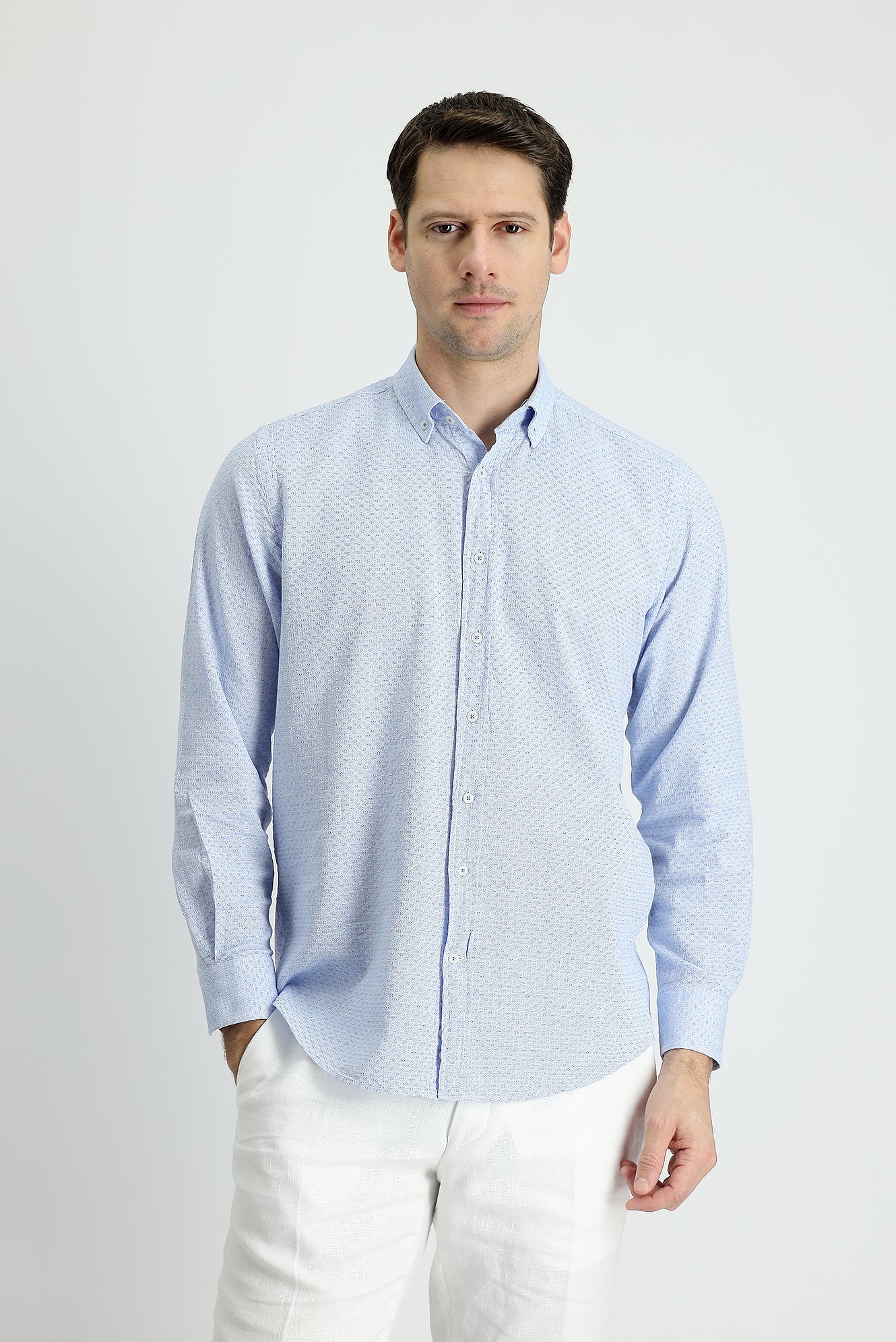 Koyu Mavi Uzun Kol Regular Fit Keten Görünümlü Desenli Pamuk Düğmeli Yaka Gömlek