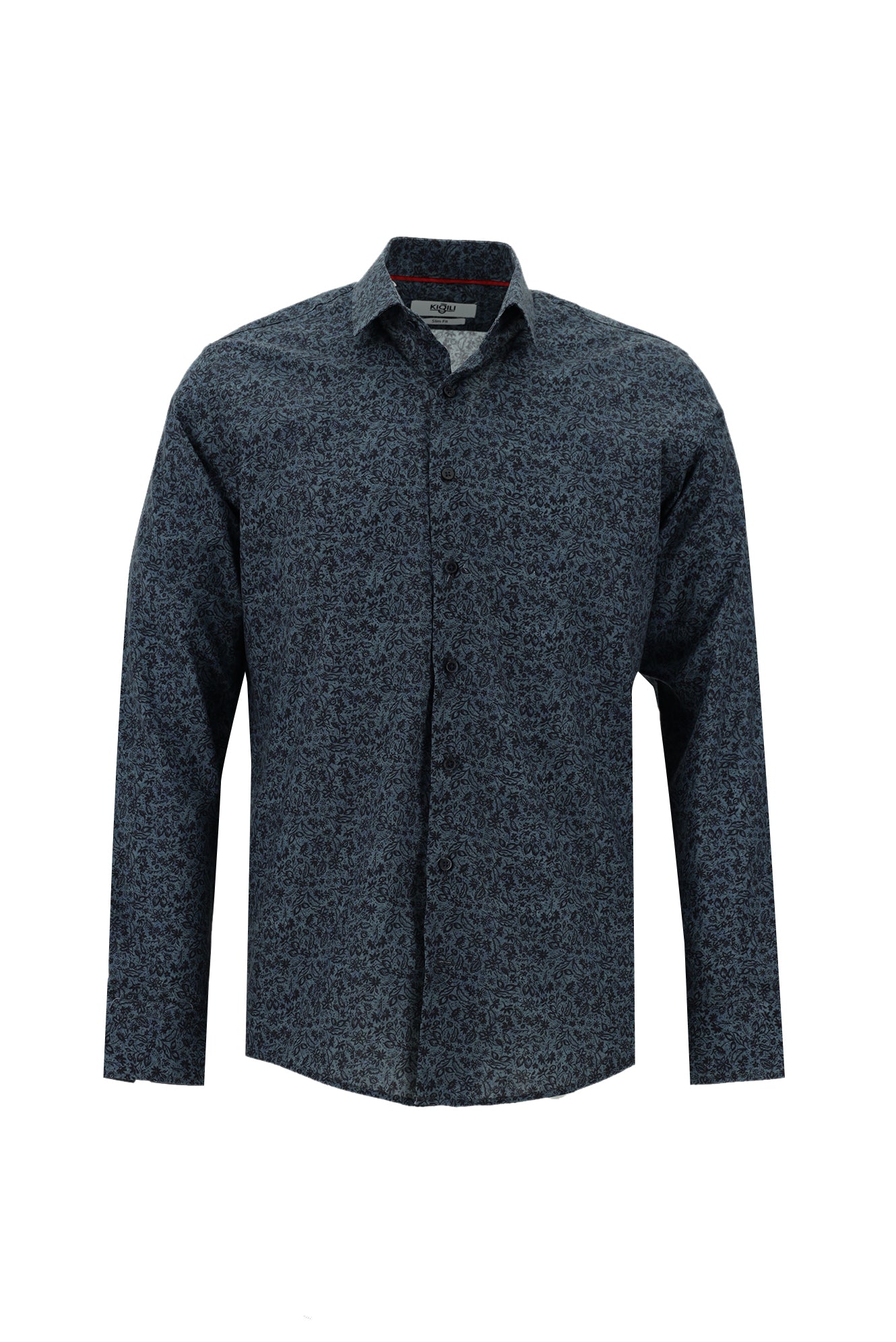 Koyu Mavi Uzun Kol Slim Fit Dar Kesim Baskılı Pamuk Gömlek