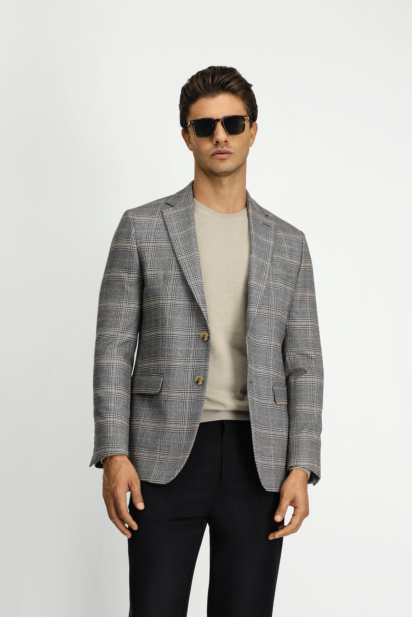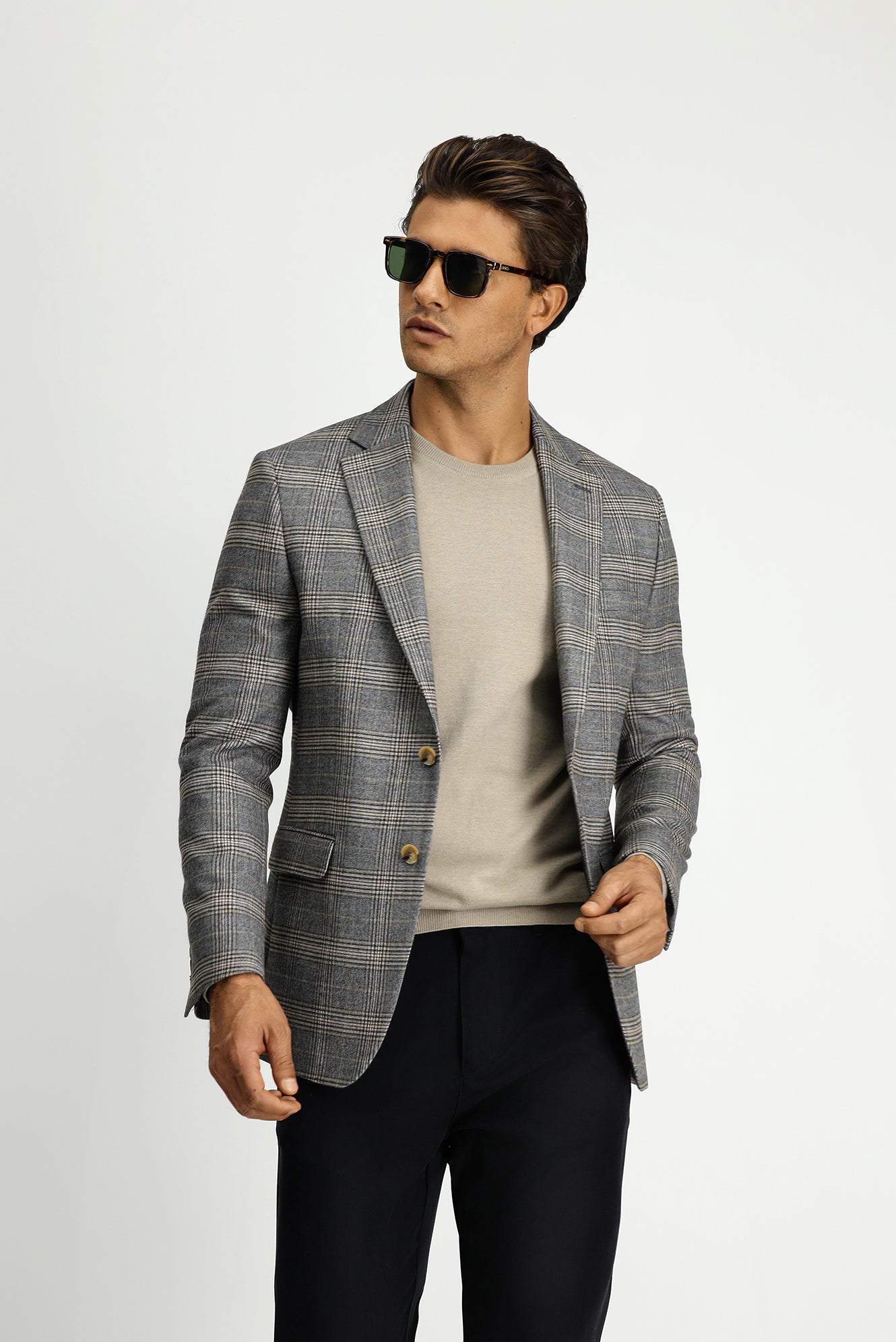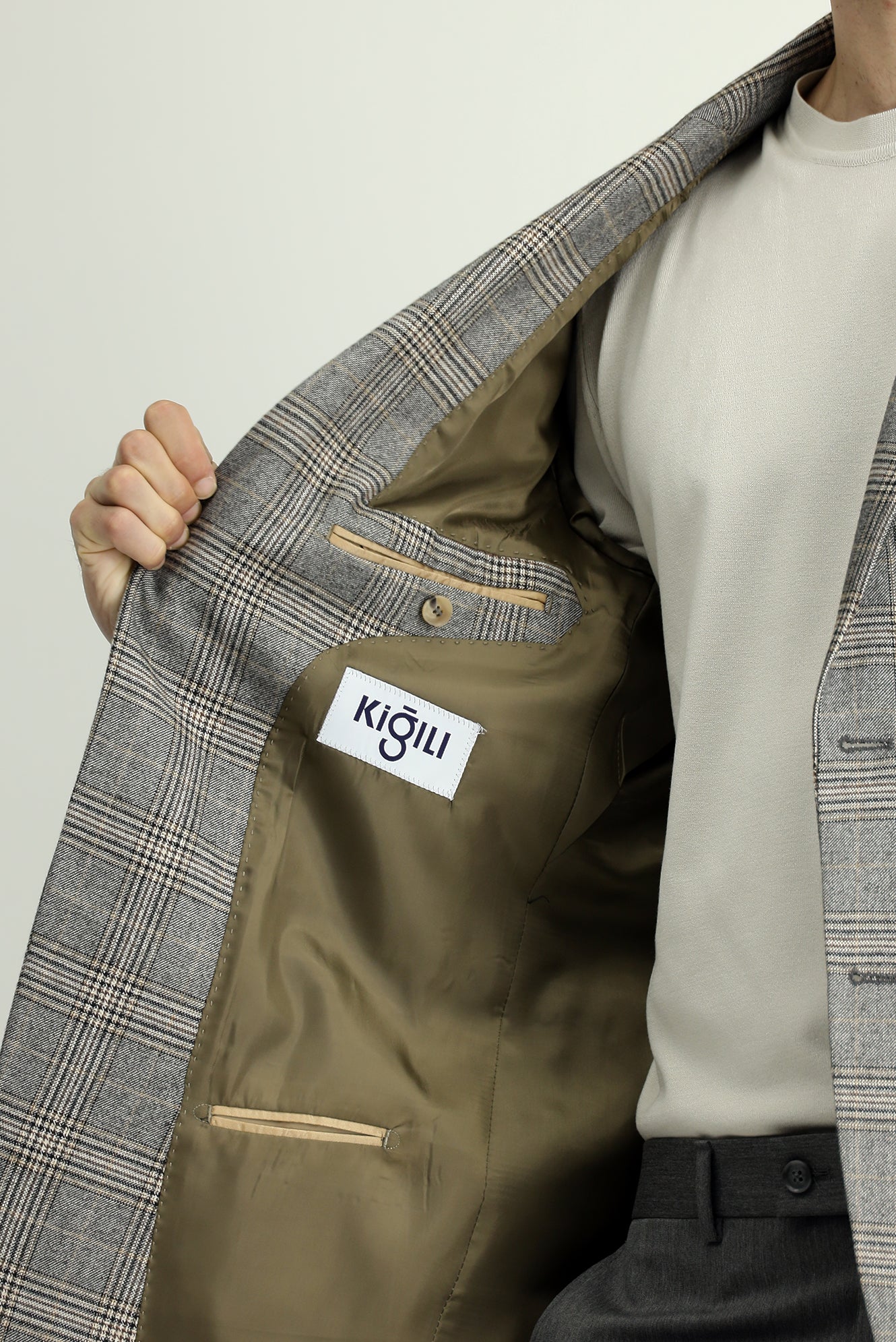 Koyu Vizon Muscle Fit Klasik Ekose Ceket