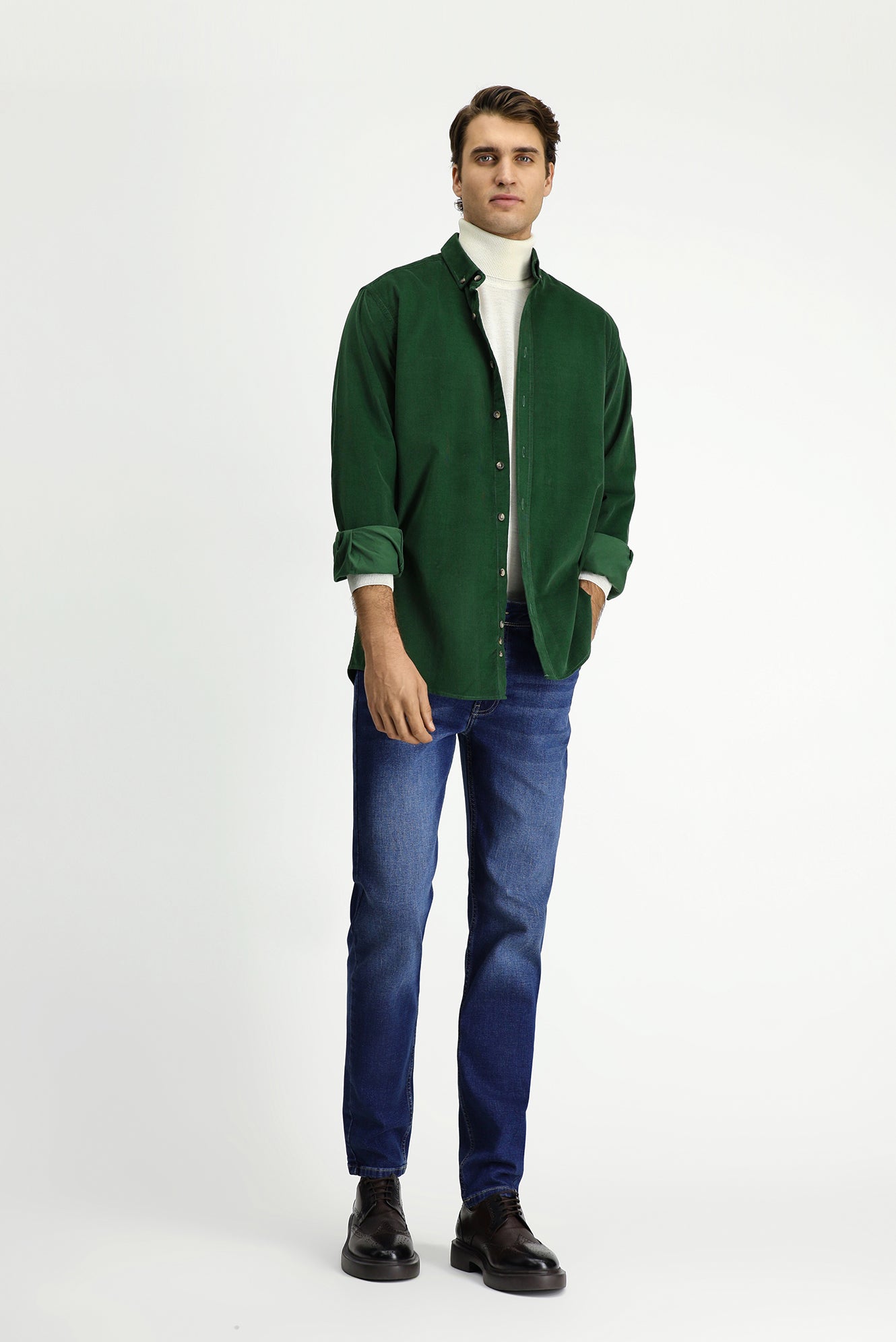 Koyu Yeşil Uzun Kol Regular Fit Spor Düğmeli Yaka Pamuk Kadife Gömlek