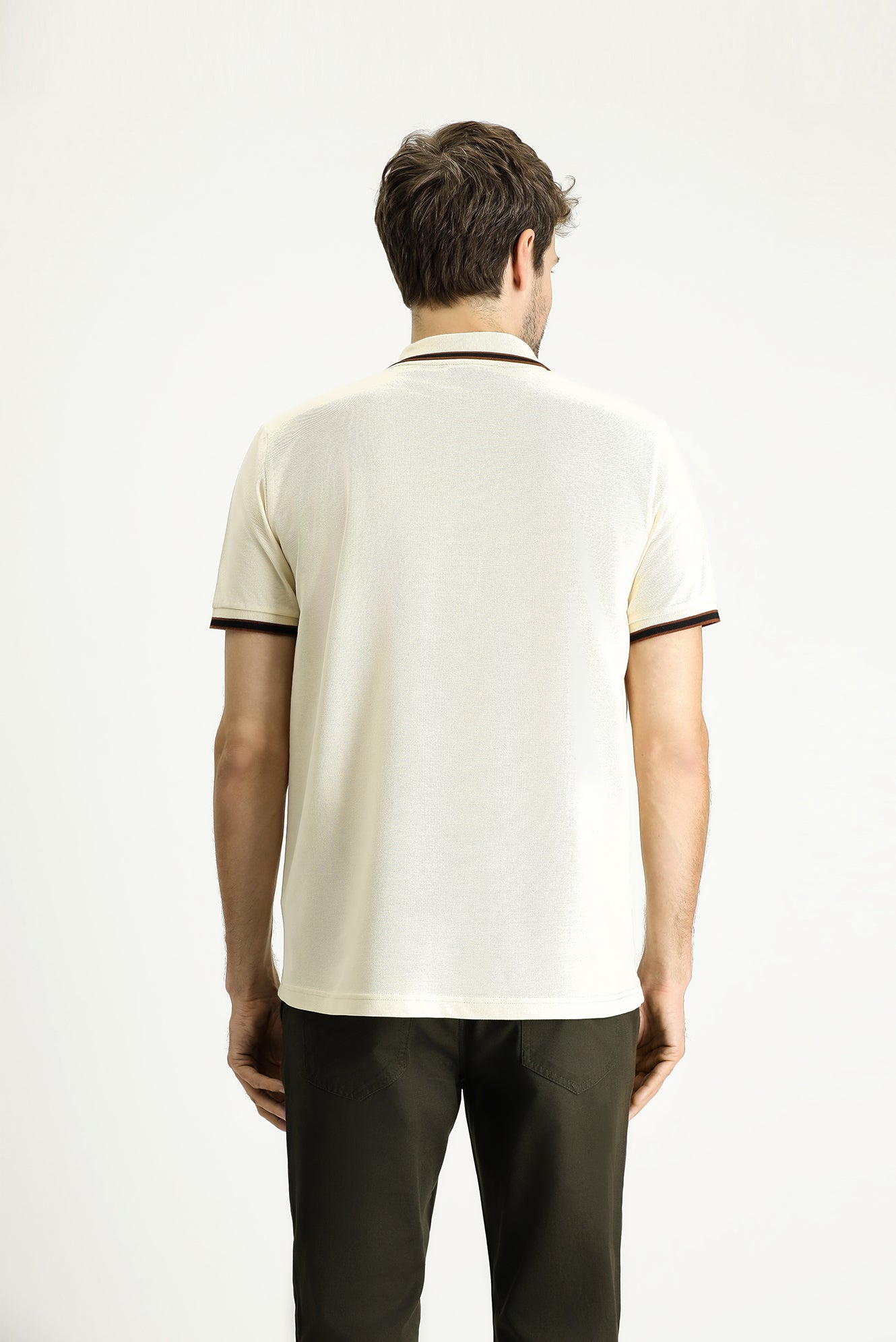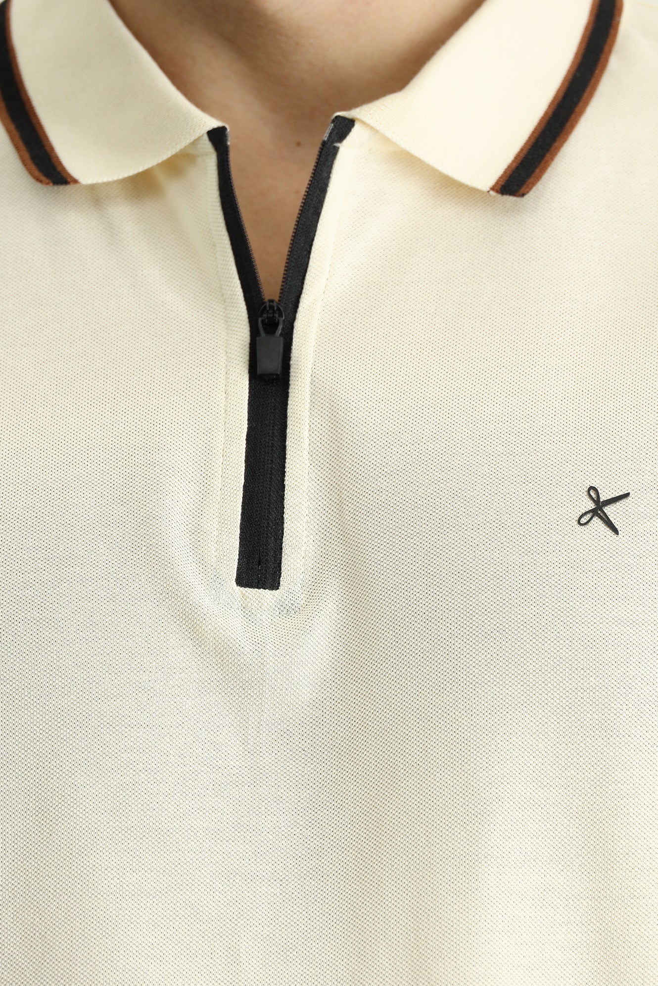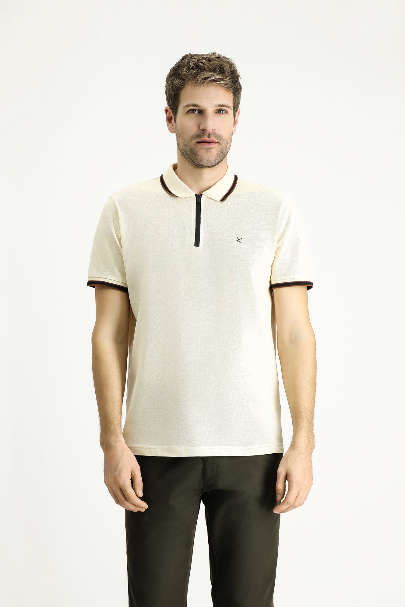 Krem Polo Yaka Regular Fit Fermuarlı Desenli Pamuk Tişört