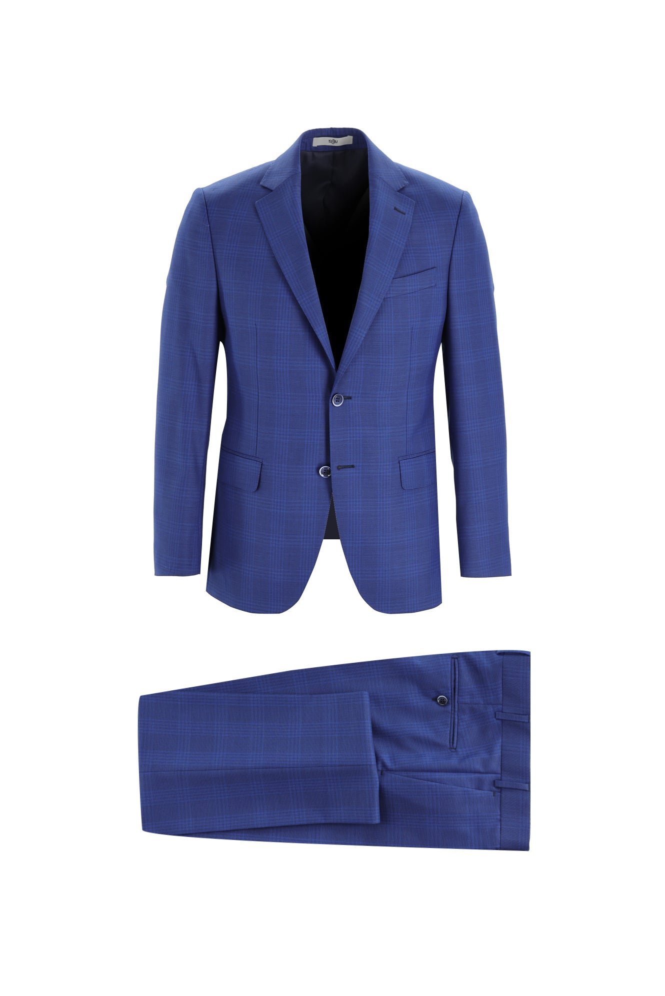 Mavi Slim Fit Dar Kesim Yünlü Ekose Takım Elbise