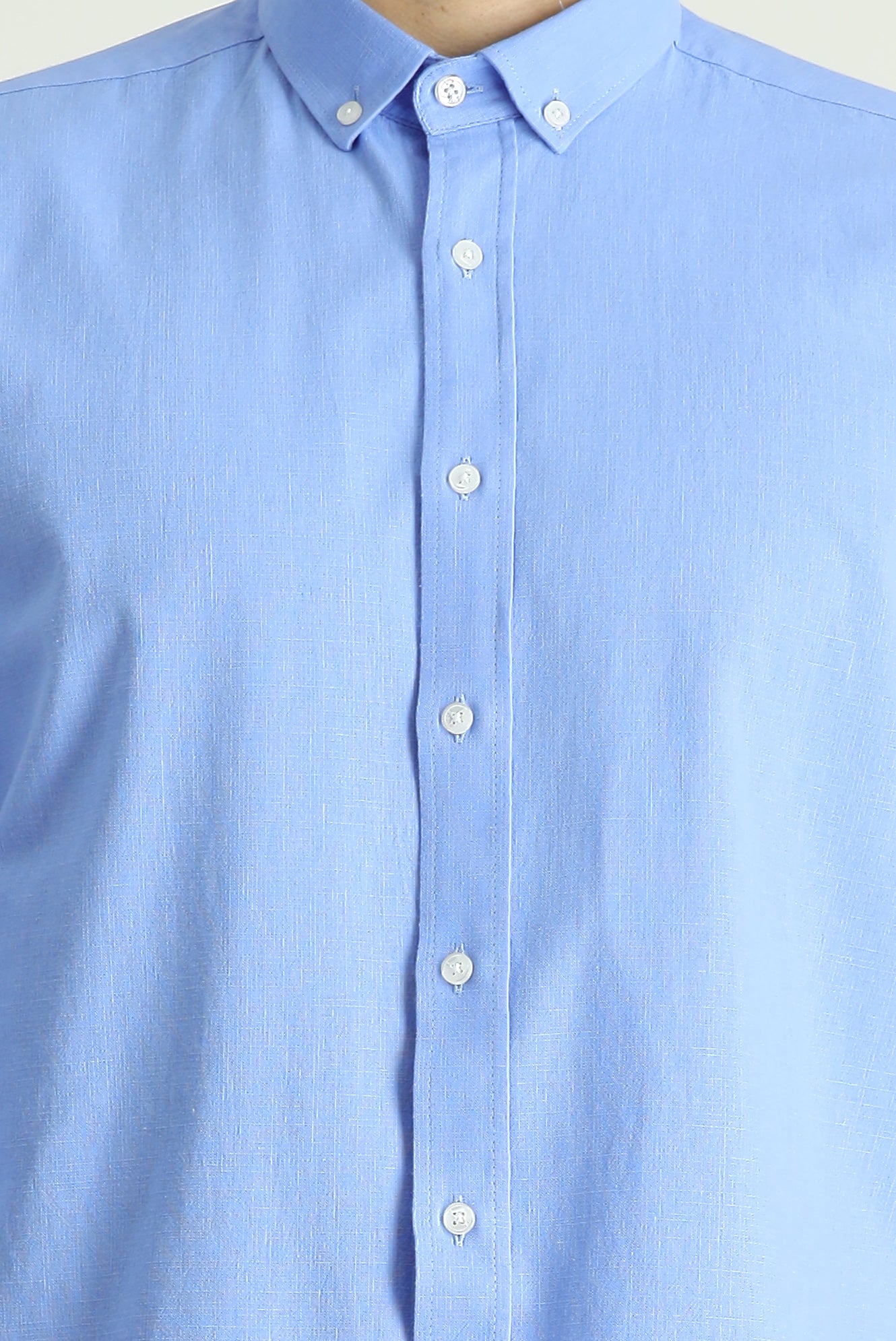 Mavi Uzun Kol Relaxed Fit Rahat Kesim Keten Görünümlü Pamuk Düğmeli Yaka Gömlek