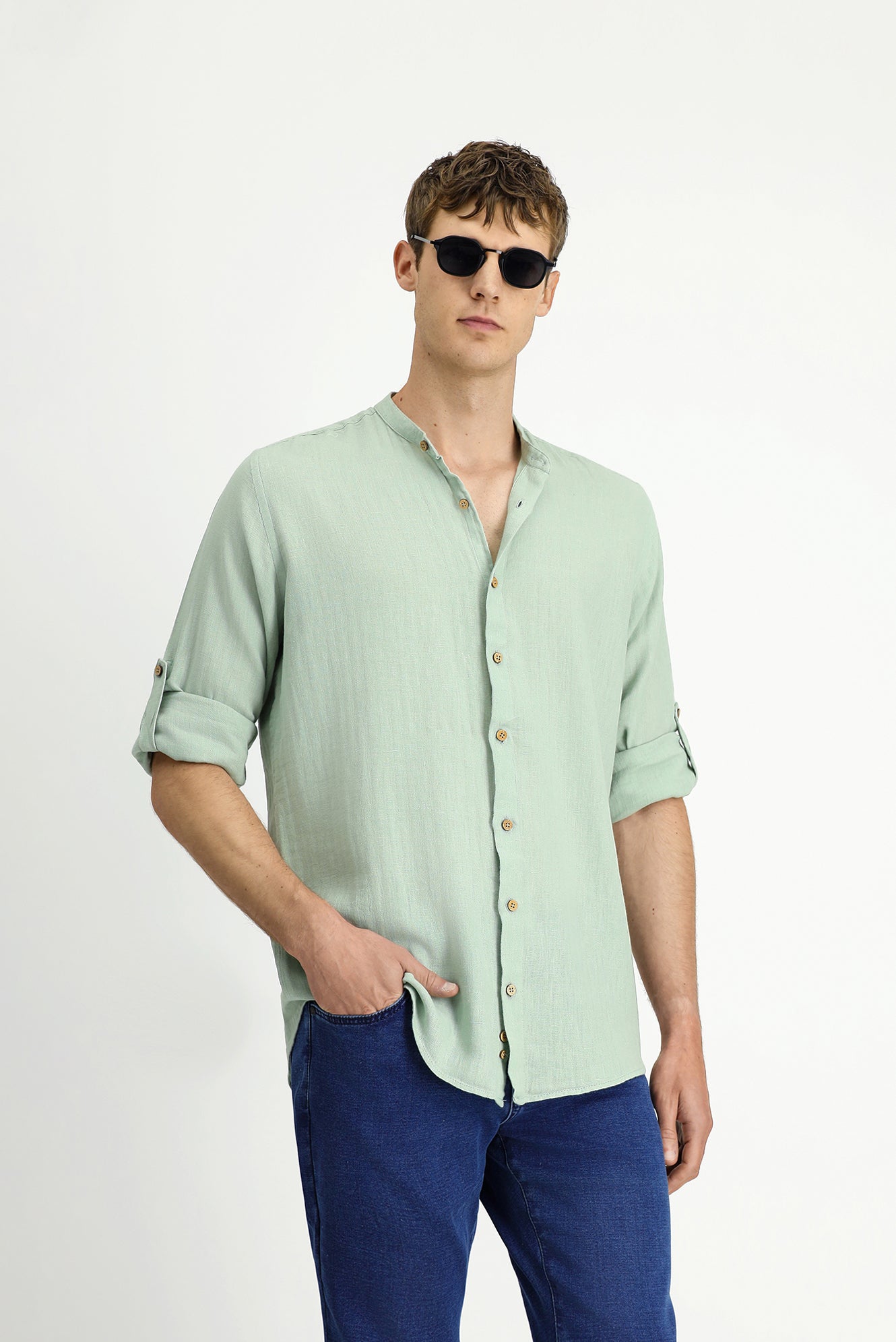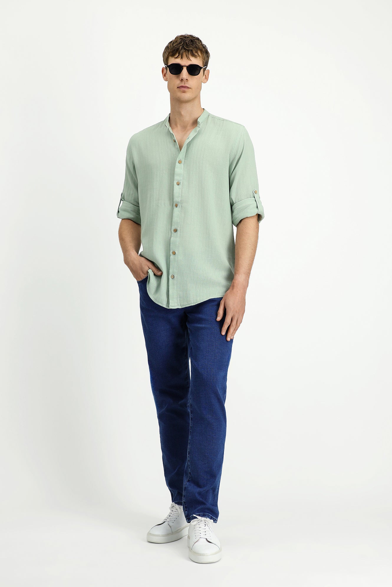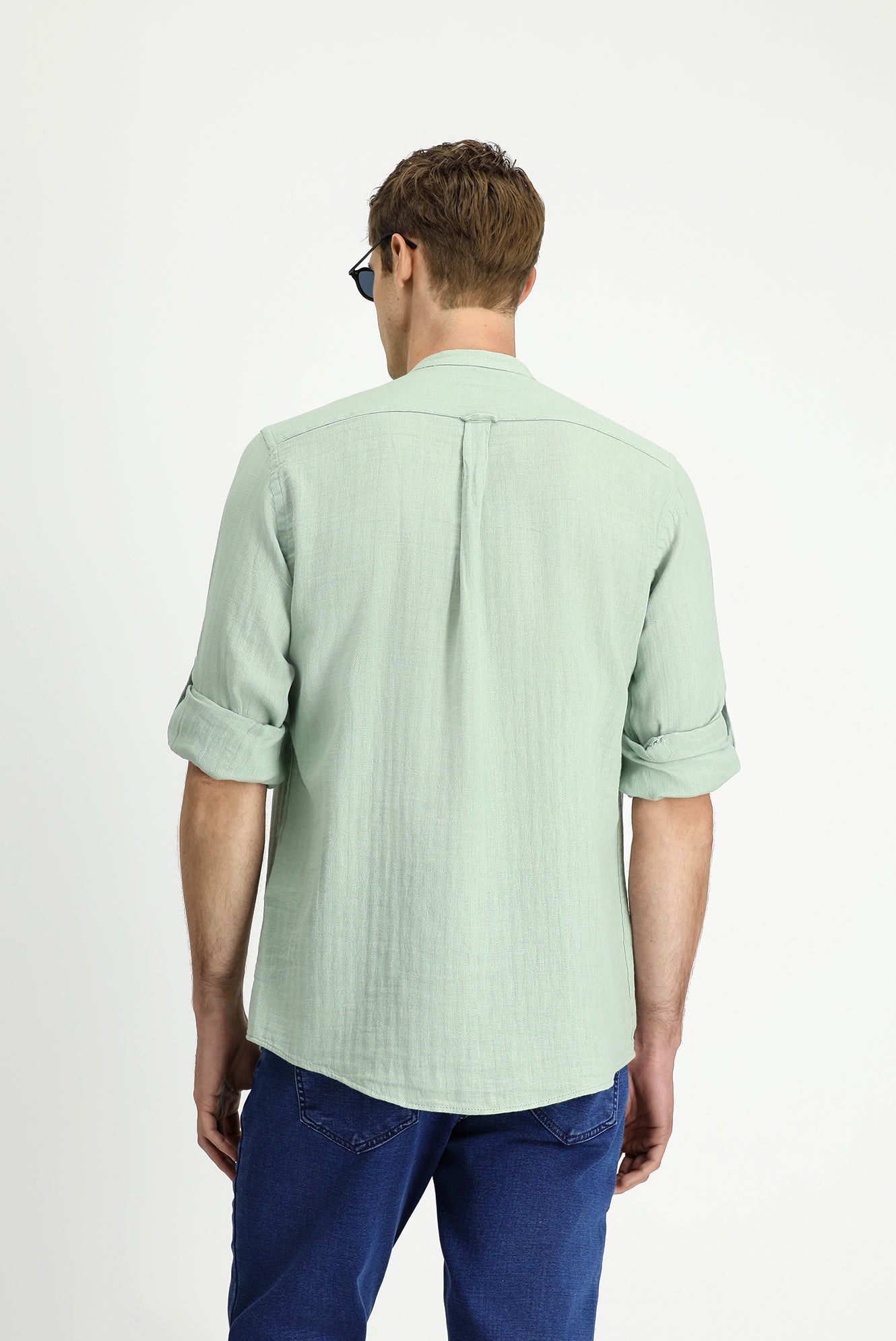 Mint Yeşili Uzun Kol Regular Fit Desenli Pamuklu Keten Gömlek
