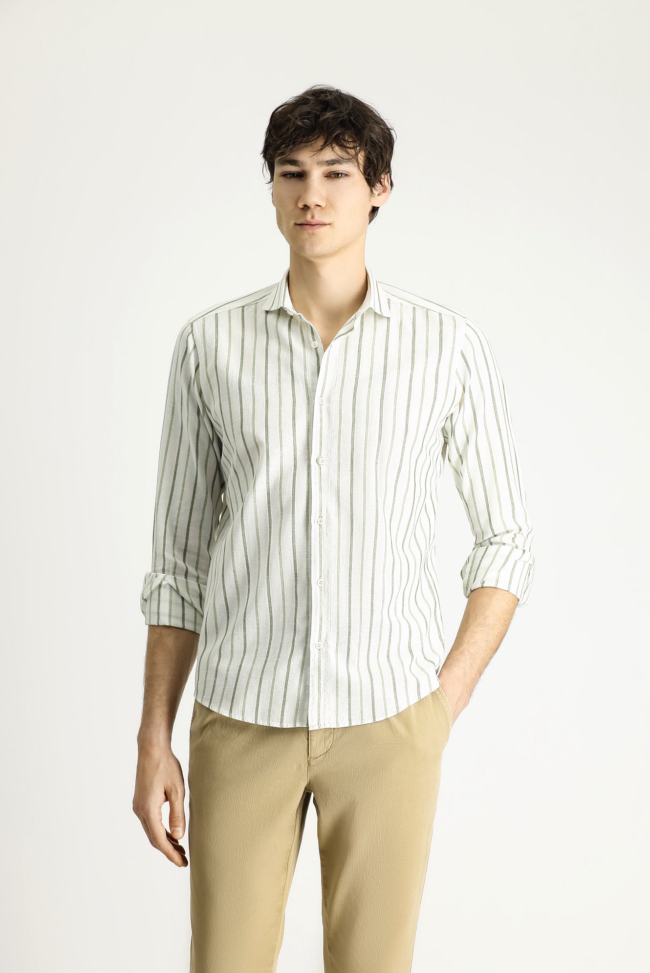 Mint Yeşili Uzun Kol Slim Fit Dar Kesim Çizgili Spor Keten Karışımlı Pamuklu Gömlek