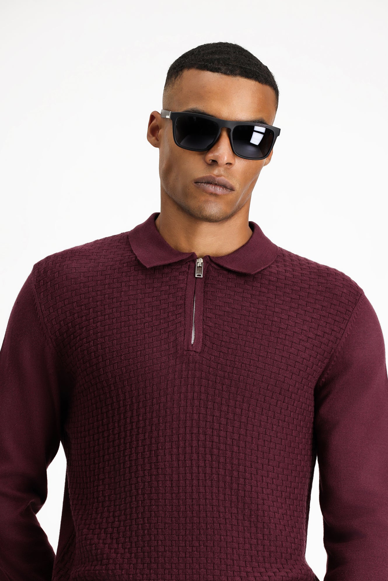 Mürdüm Polo Yaka Regular Fit Fermuarlı Desenli Pamuklu Triko Kazak