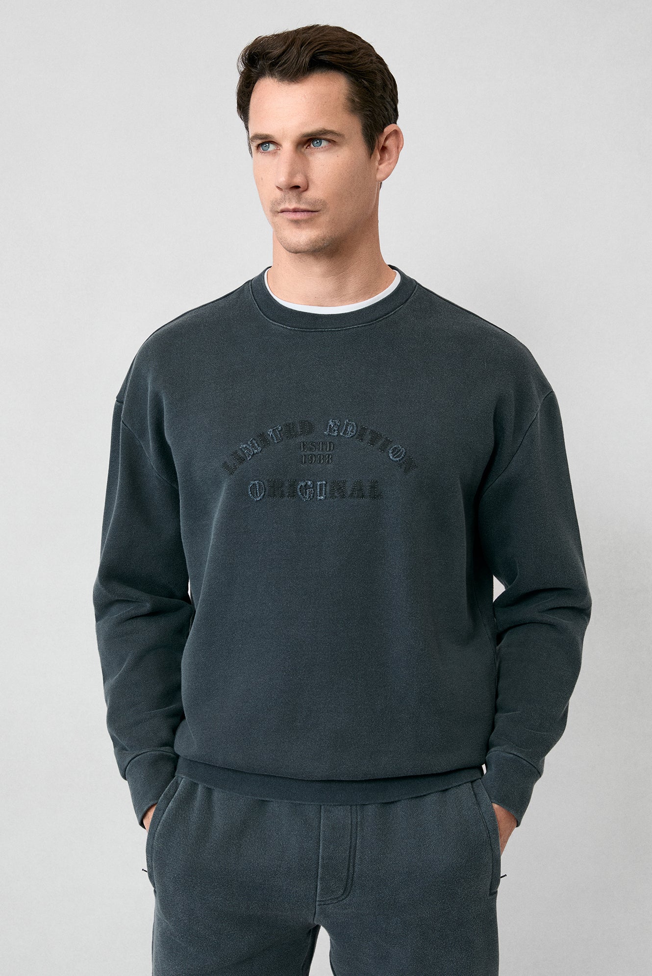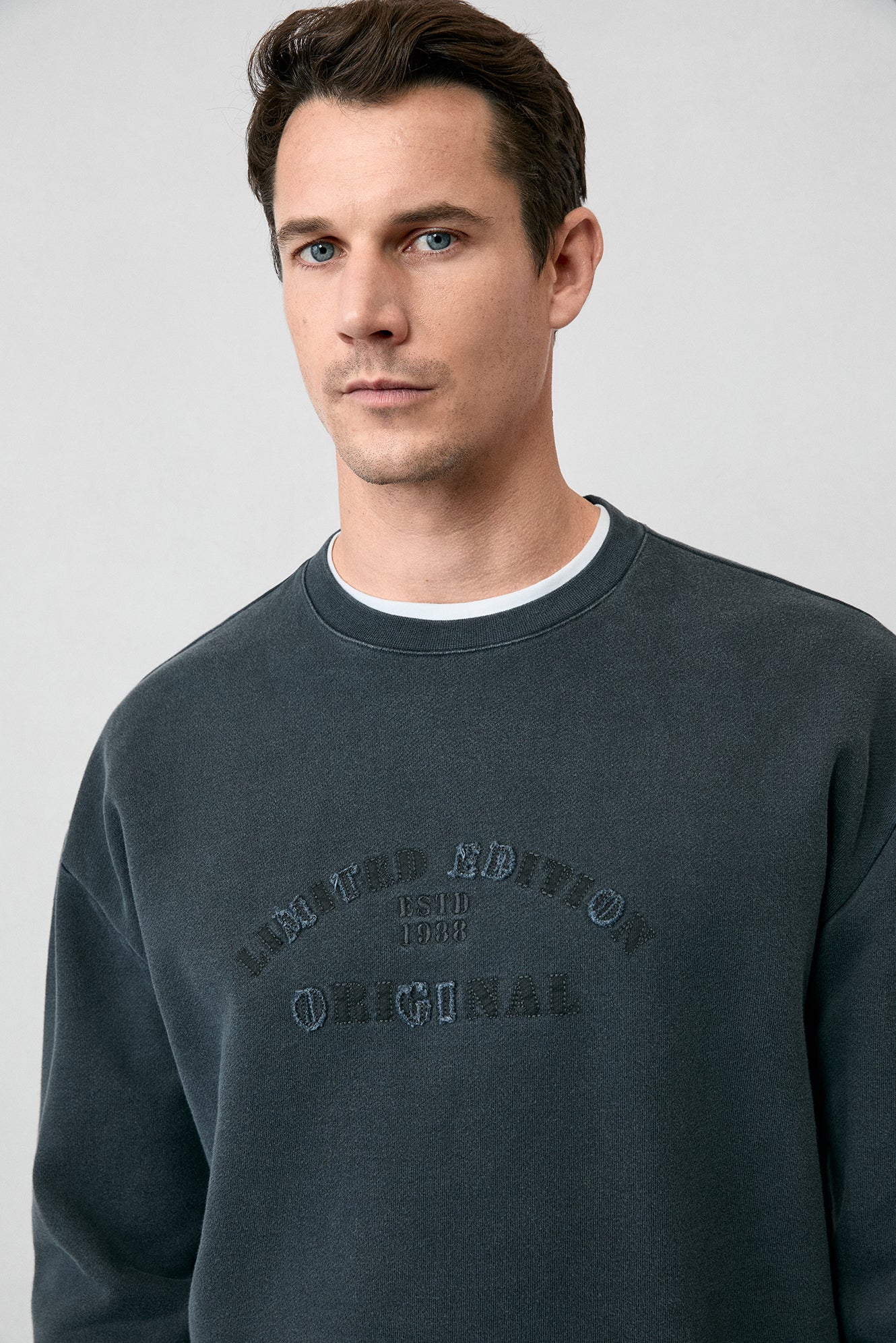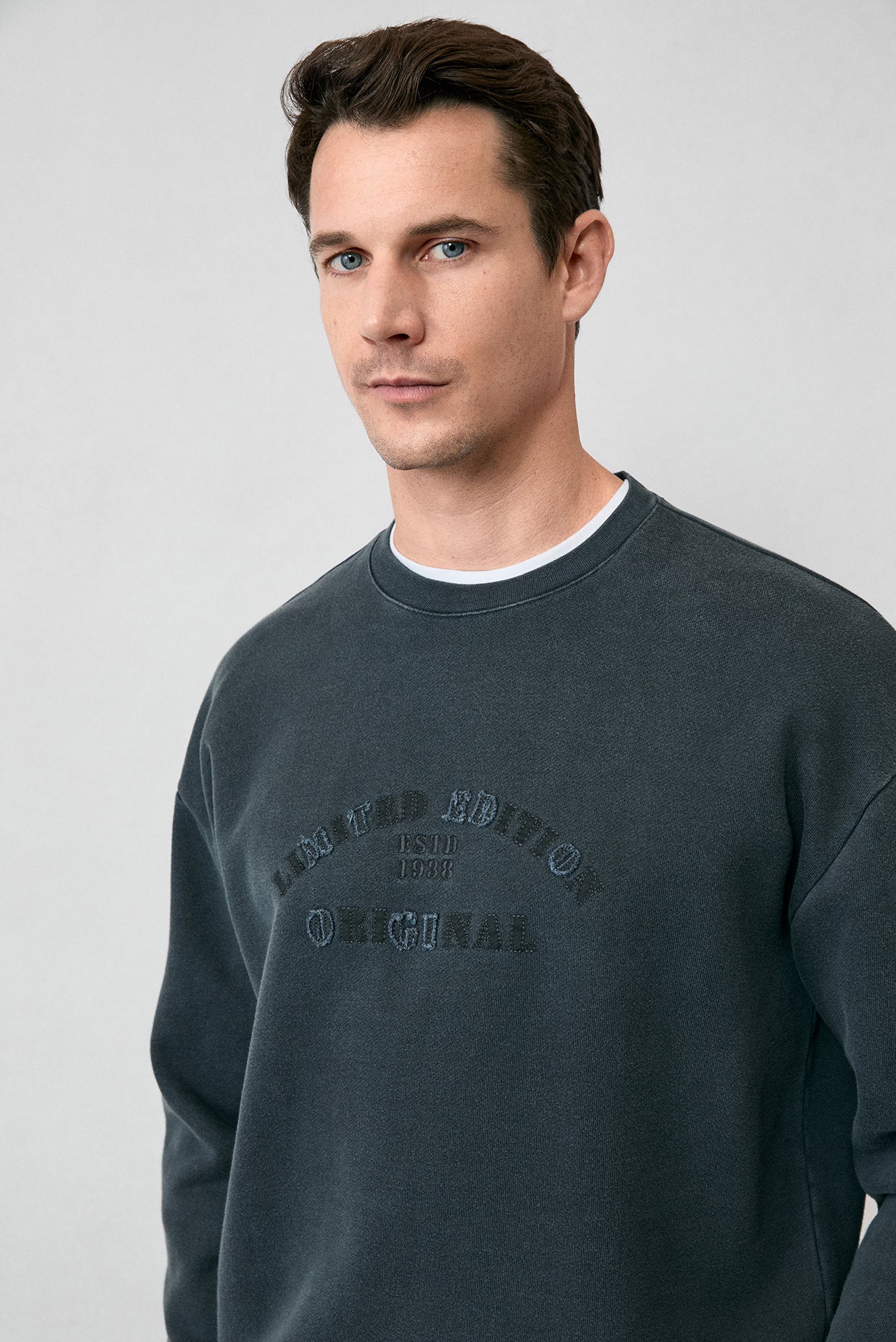 Orta Antrasit Bisiklet Yaka Oversize Ekstra Rahat Kesim Nakış Desenli Pamuk Sweatshırt