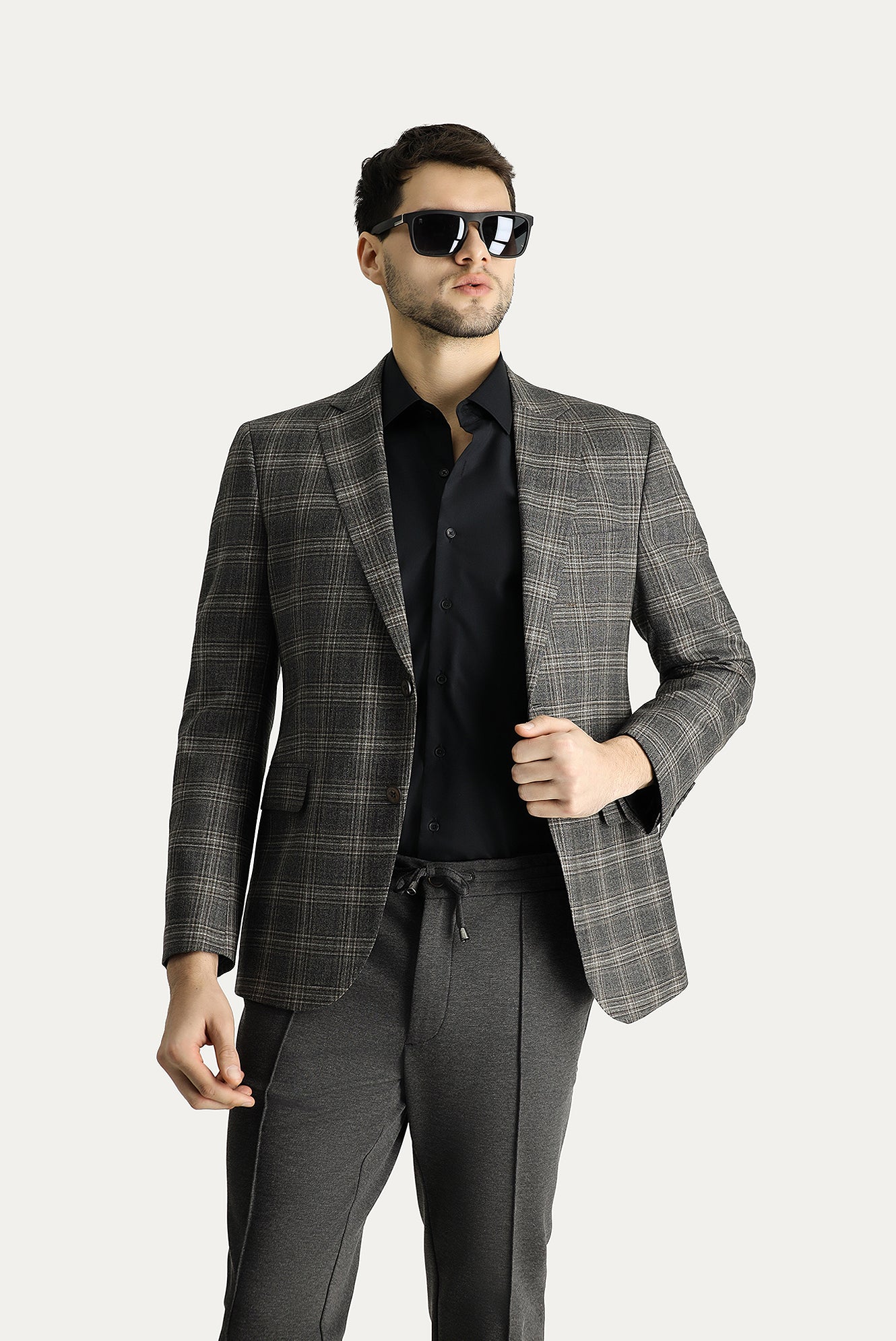Orta Antrasit Slim Fit Dar Kesim Yünlü Klasik Ekose Ceket
