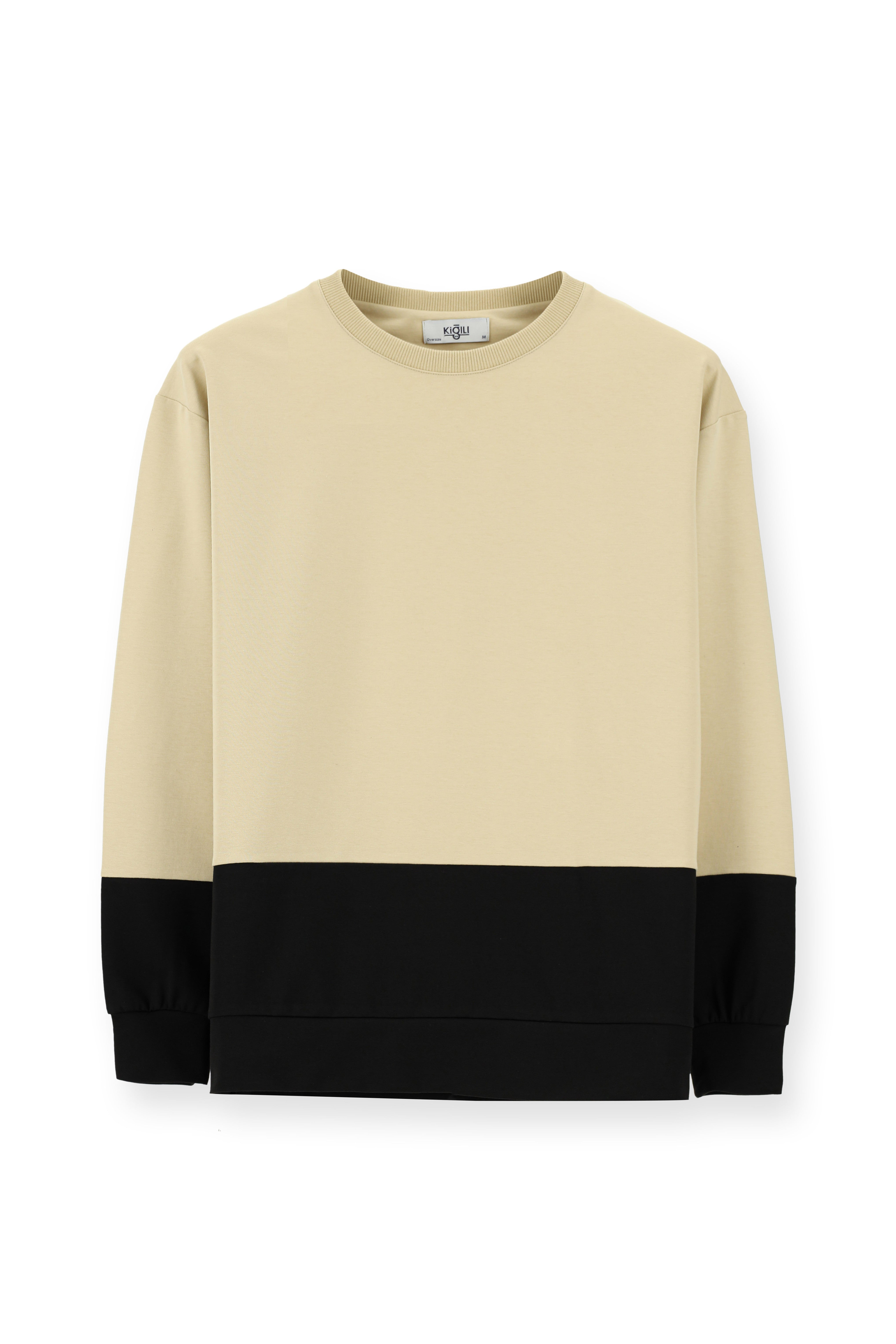 Orta Bej Bisiklet Yaka Oversize Desenli Pamuklu Sweatshirt