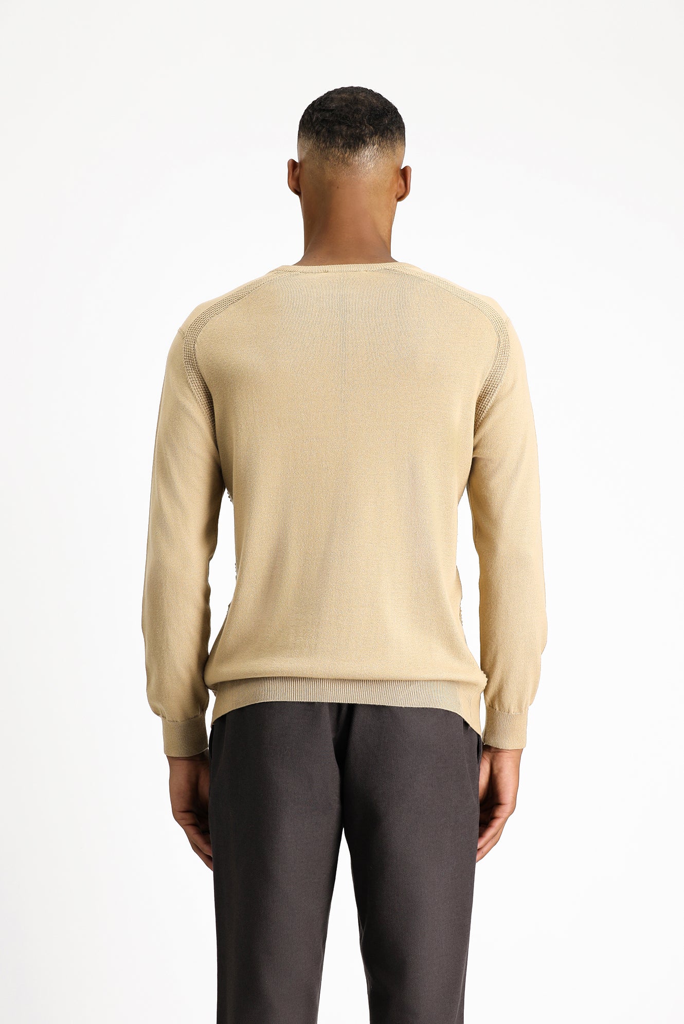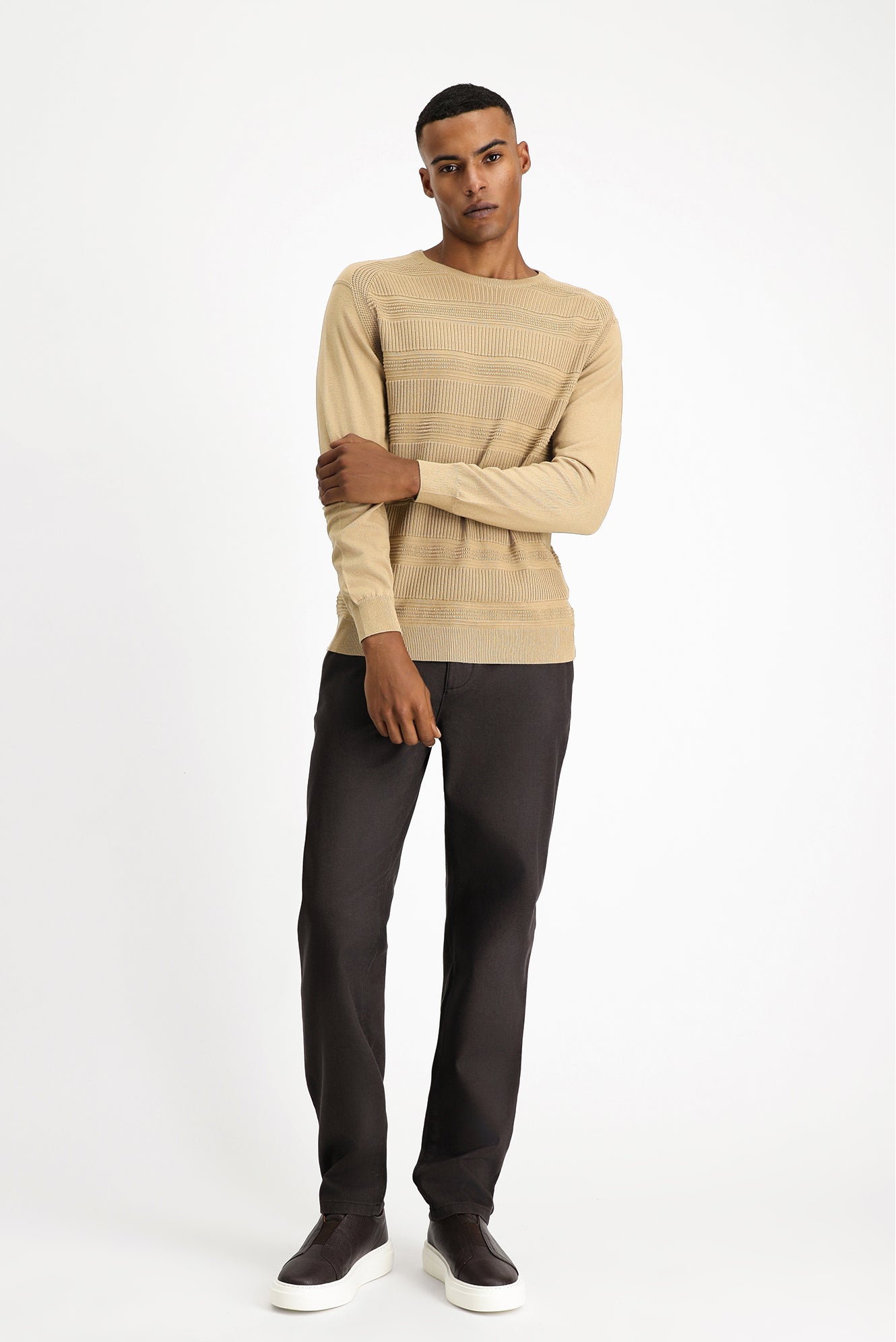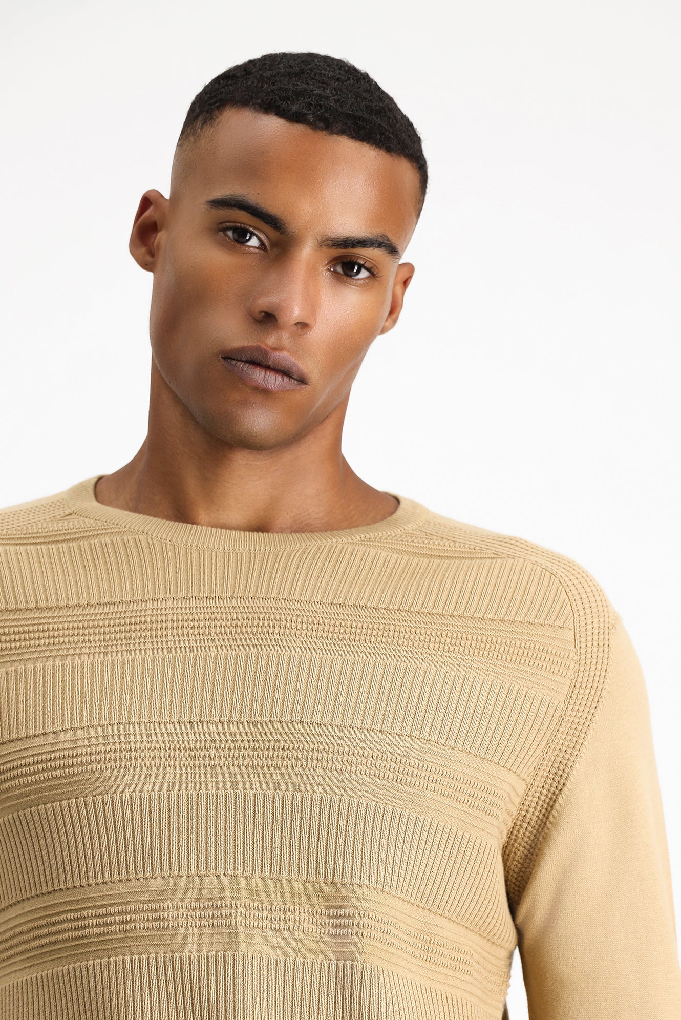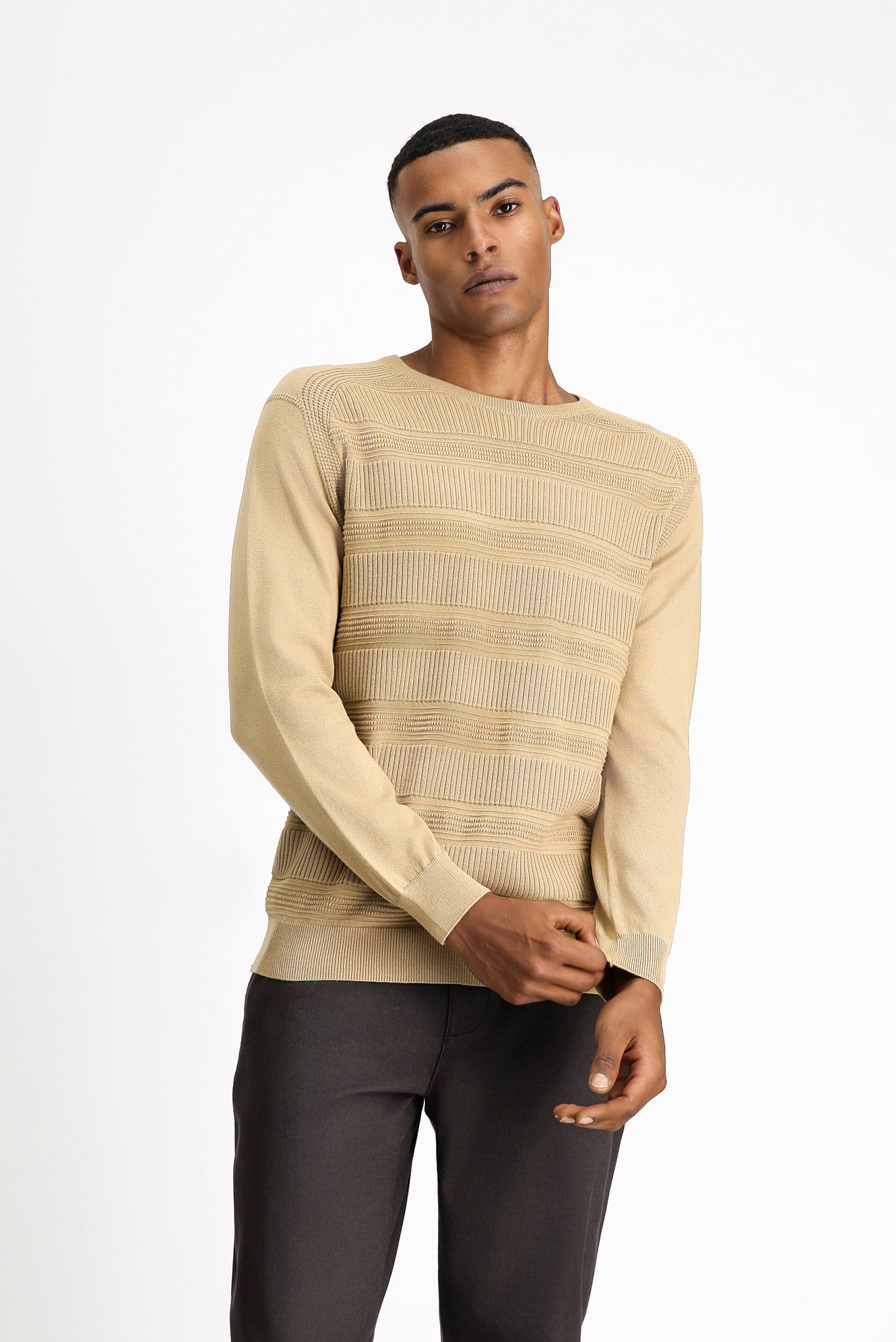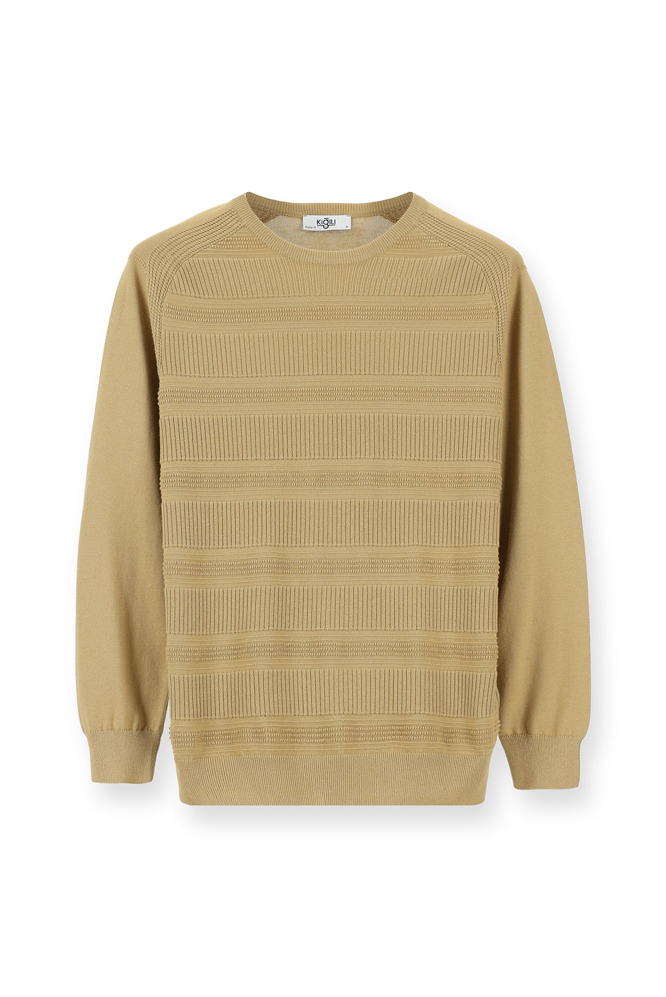 Orta Bej Bisiklet Yaka Regular Fit Çizgili Pamuklu Triko Kazak