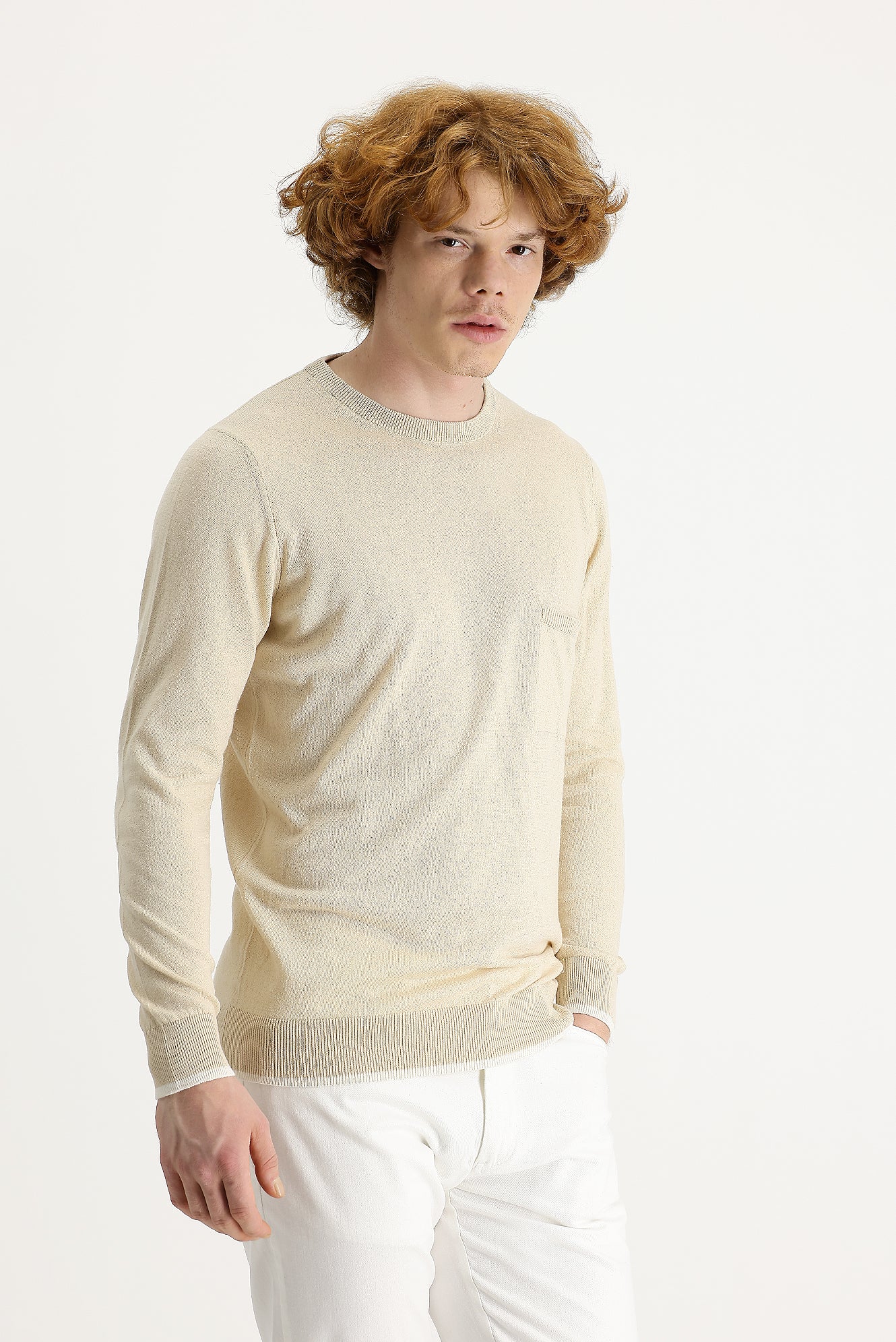 Orta Bej Bisiklet Yaka Slim Fit Dar Kesim Pamuklu Keten Triko Kazak