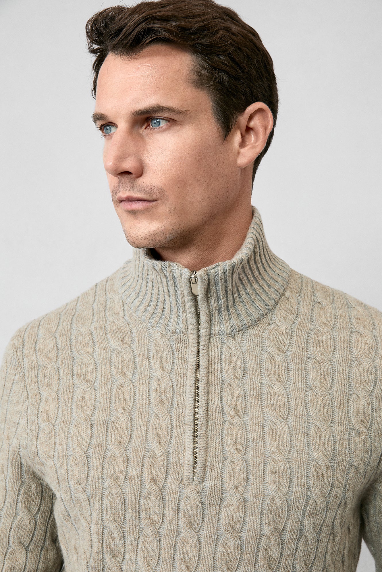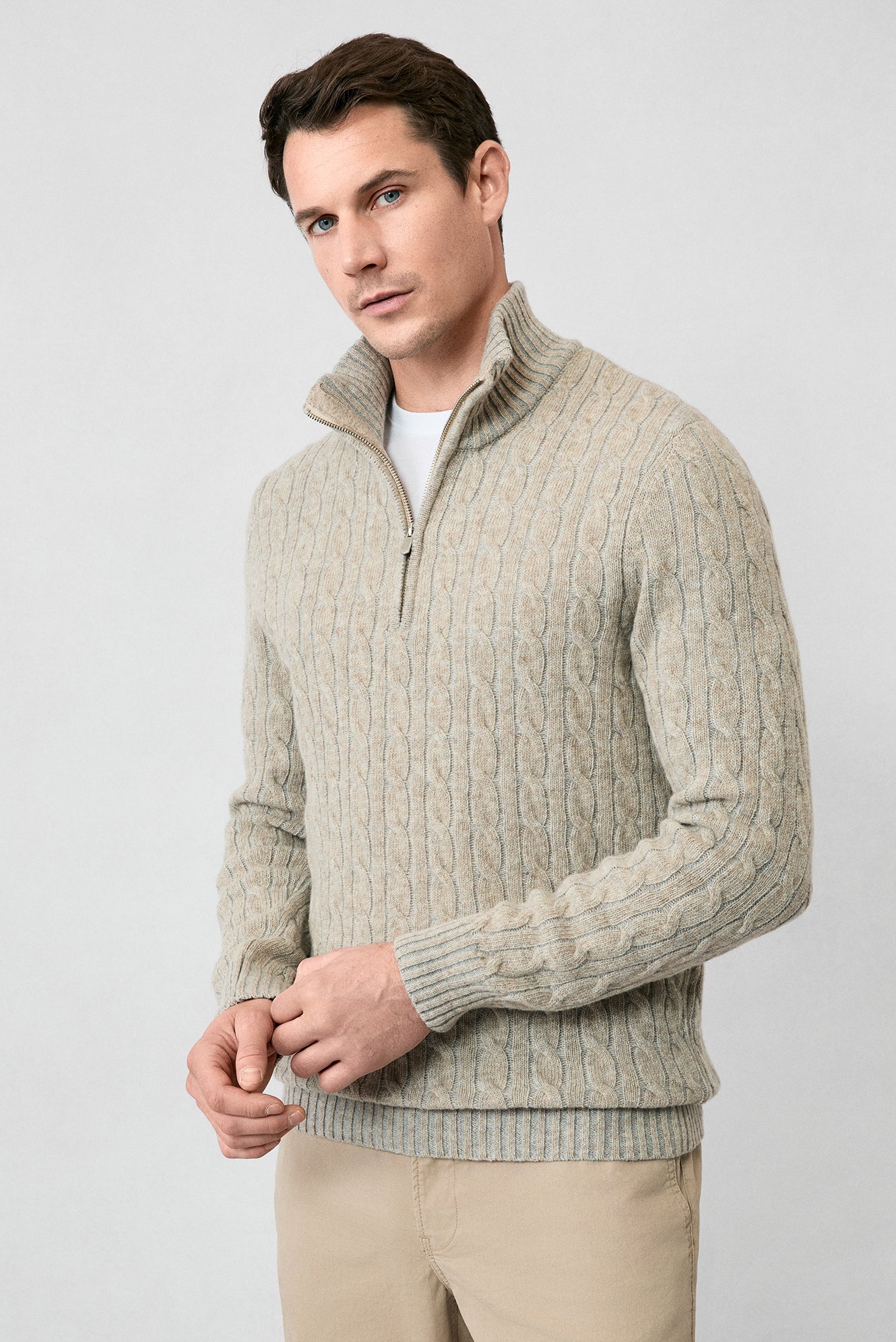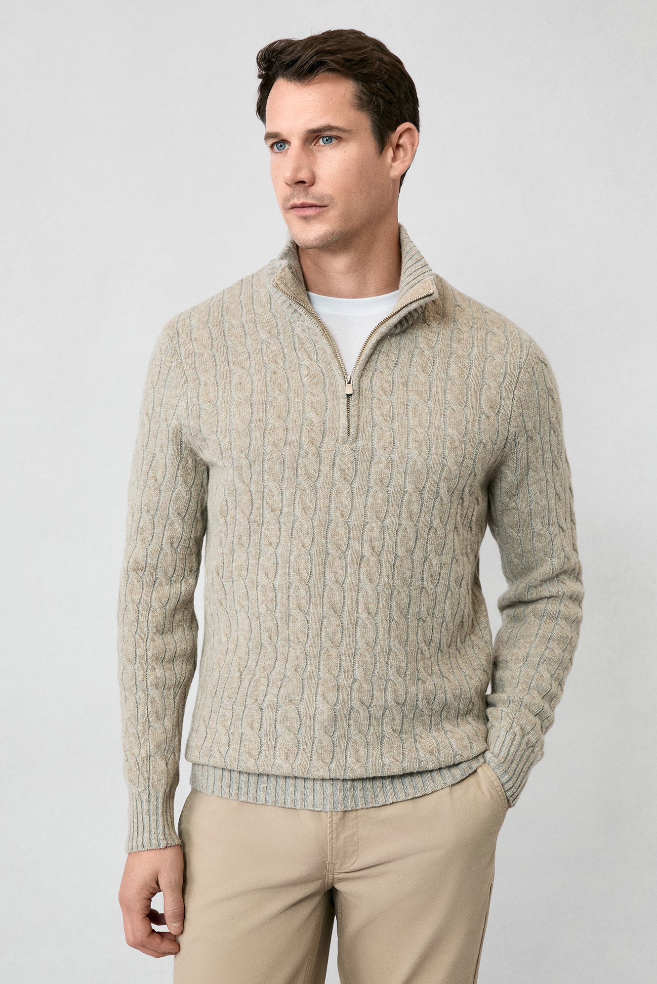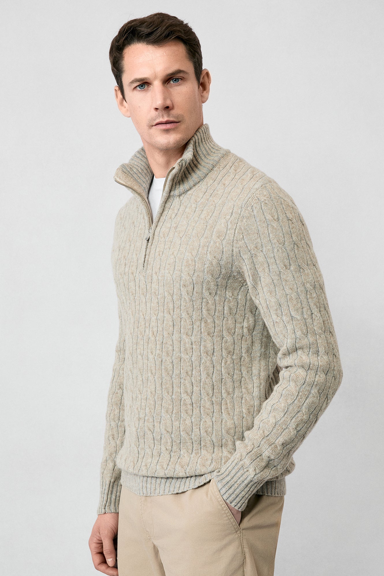 Orta Bej Yarım Balıkçı Yaka Regular Fit Fermuarlı Desenli Örme Yünlü Triko Kazak