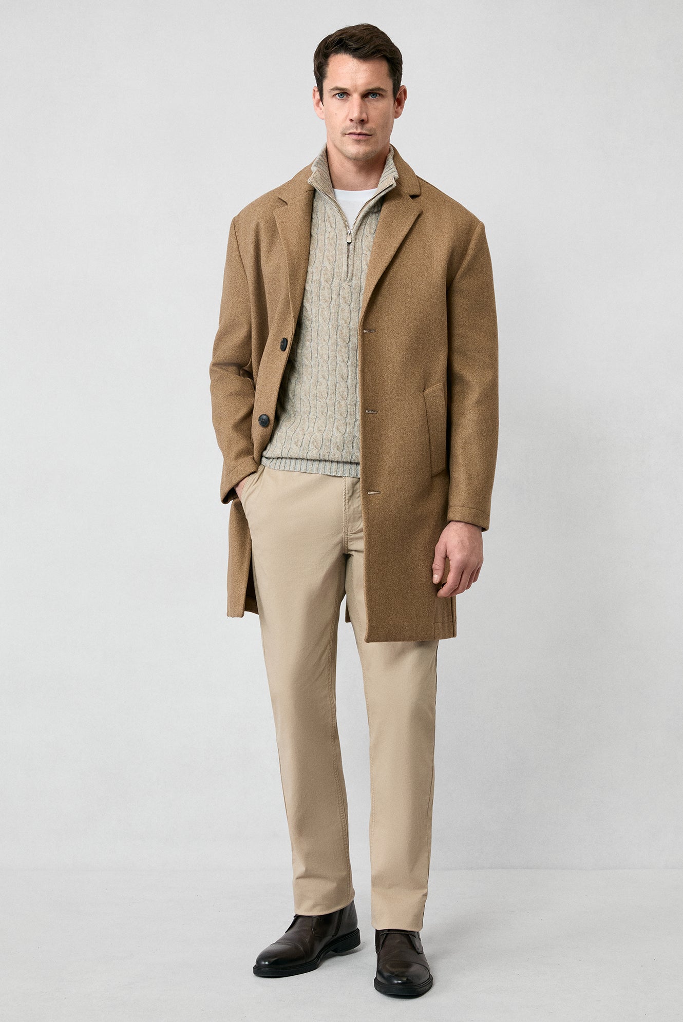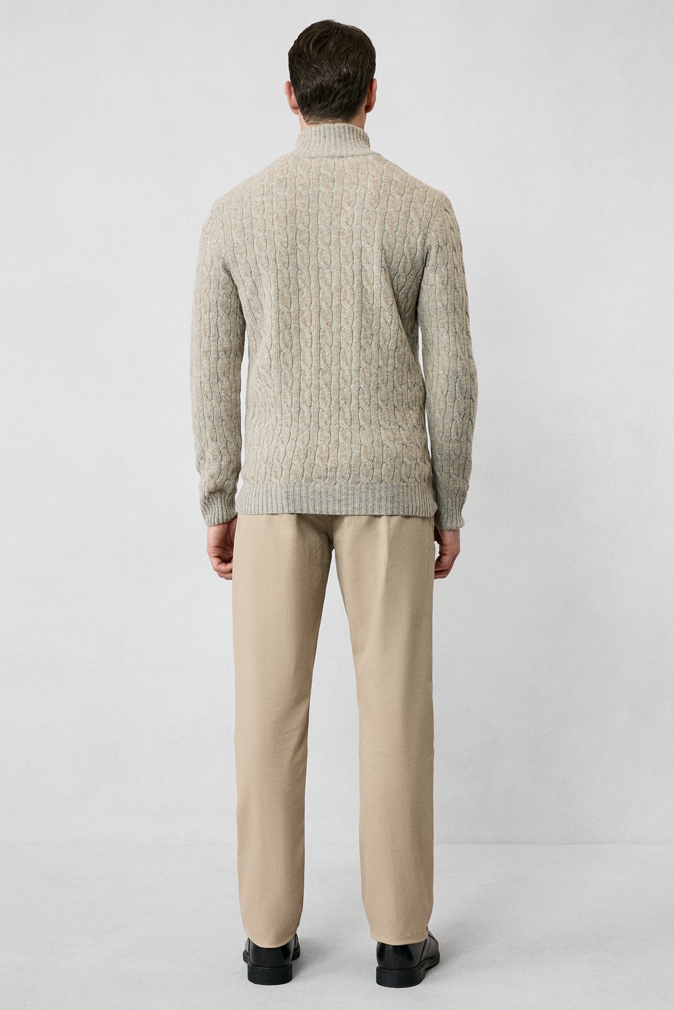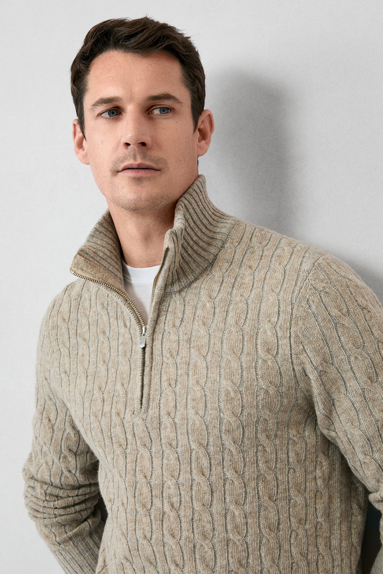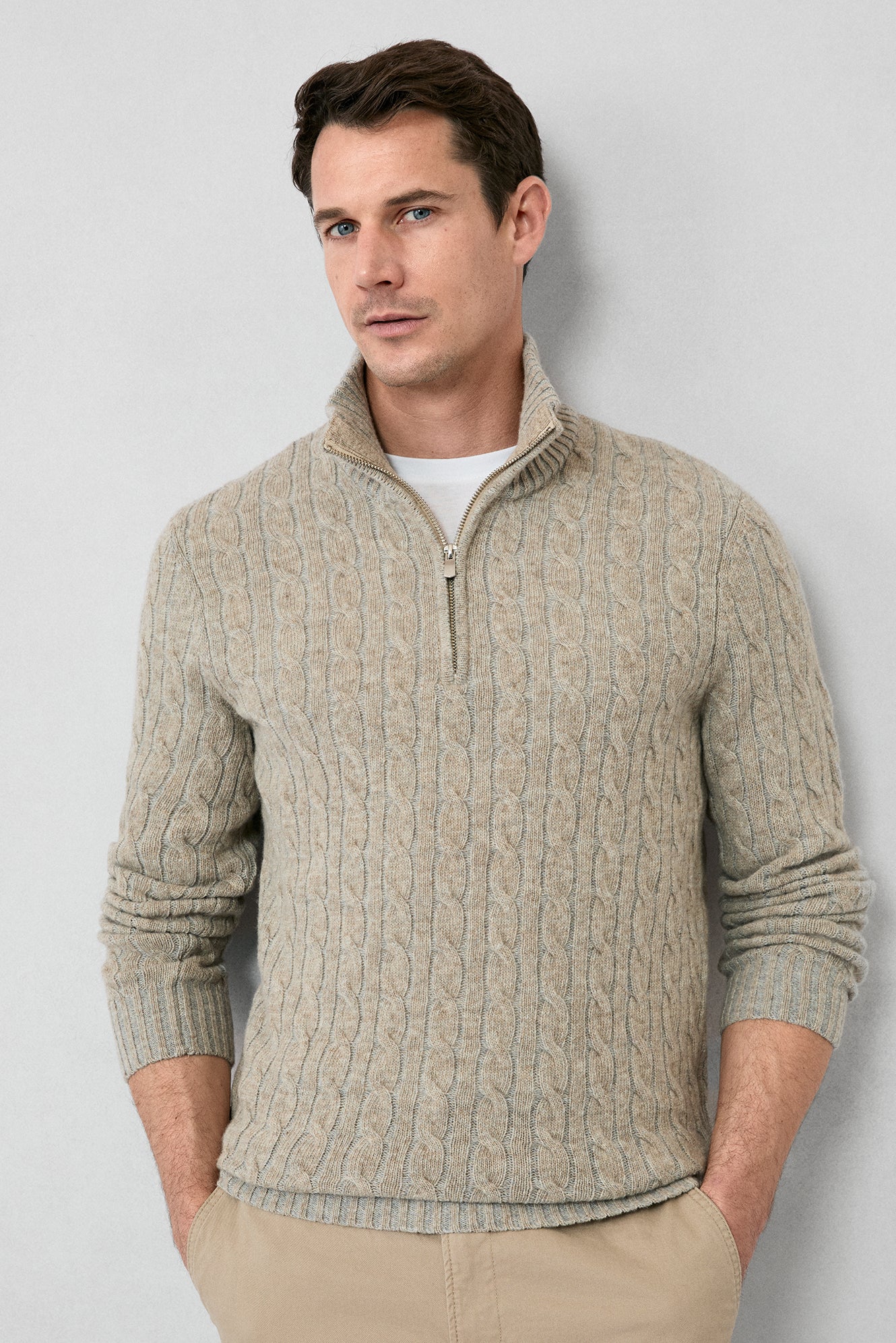 Orta Bej Yarım Balıkçı Yaka Regular Fit Fermuarlı Desenli Örme Yünlü Triko Kazak
