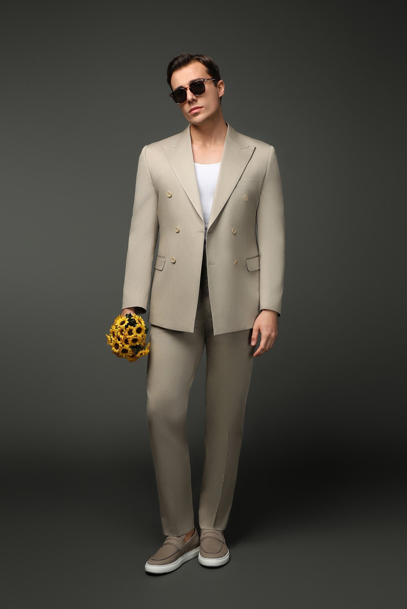 Orta Bej 7 Drop Slim Fit Dar Kesim Pamuklu Lyocell Kruvaze Takım Elbise