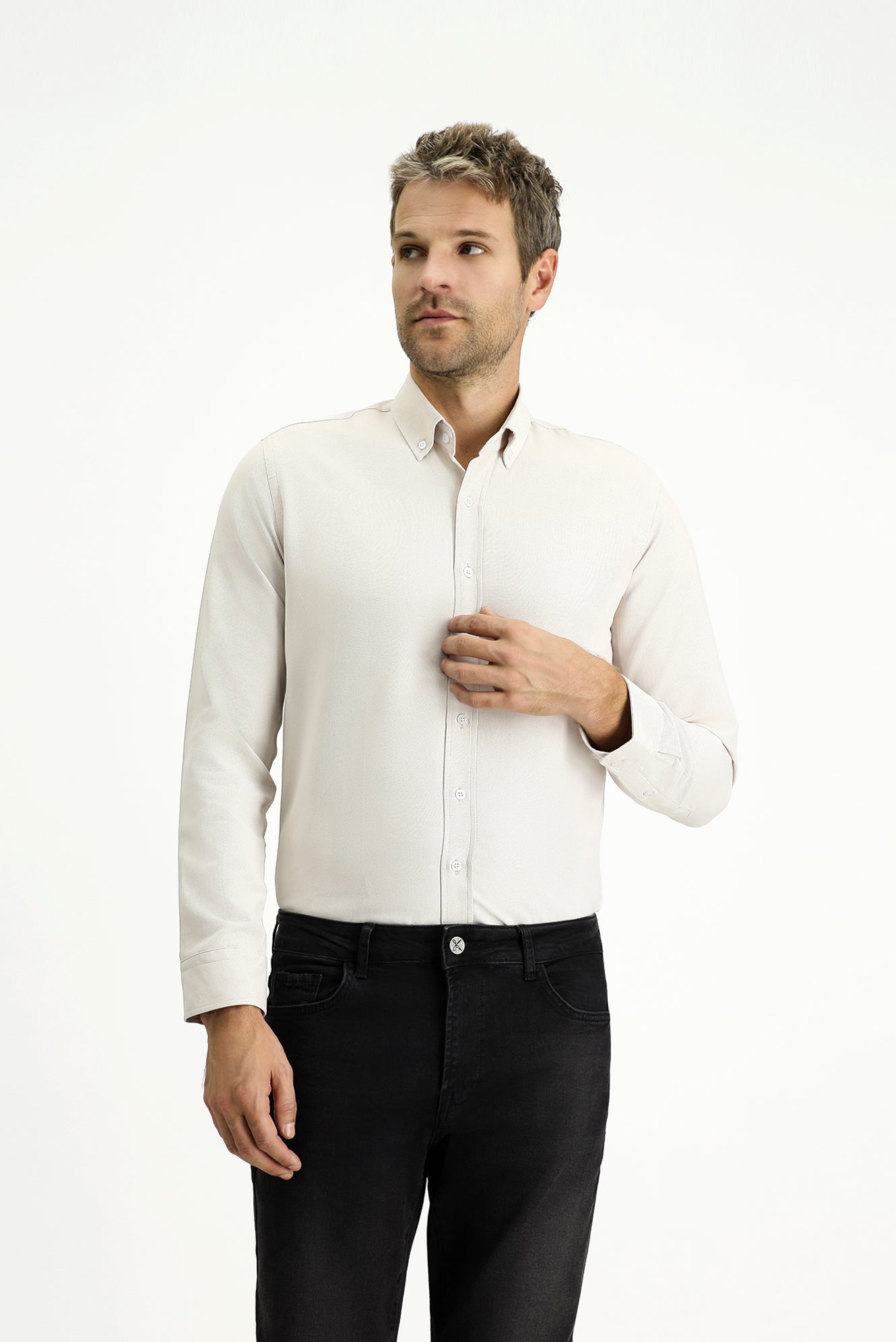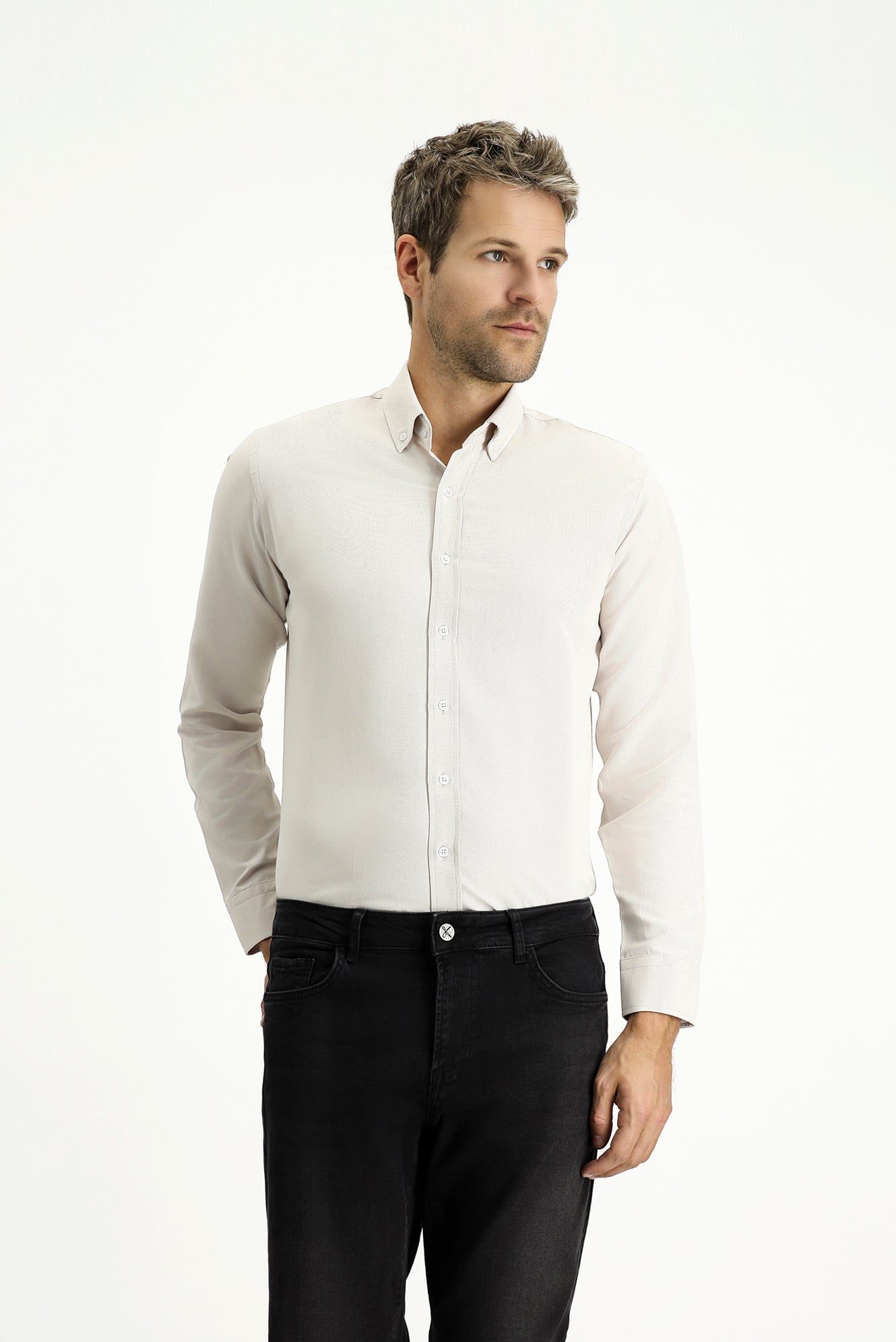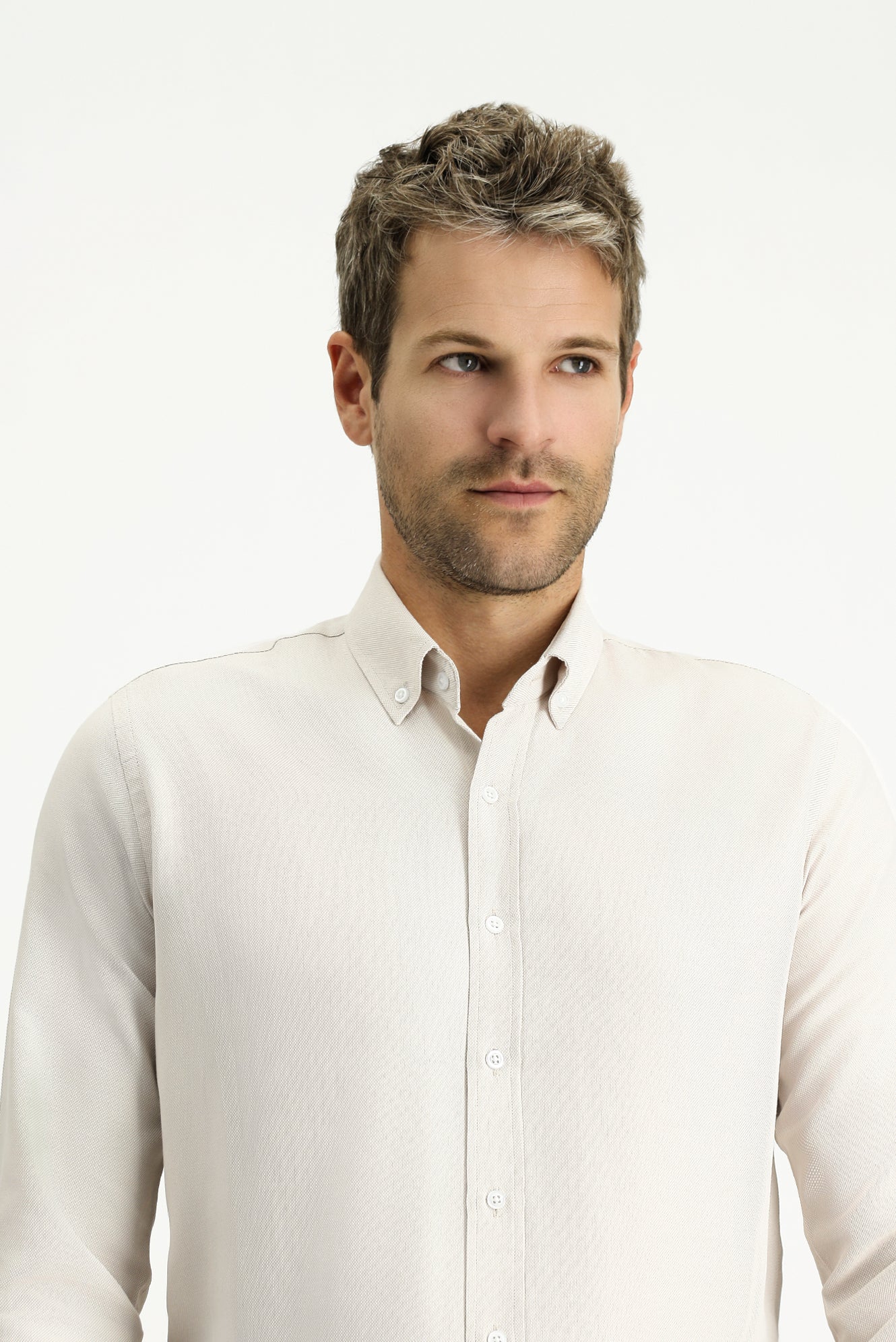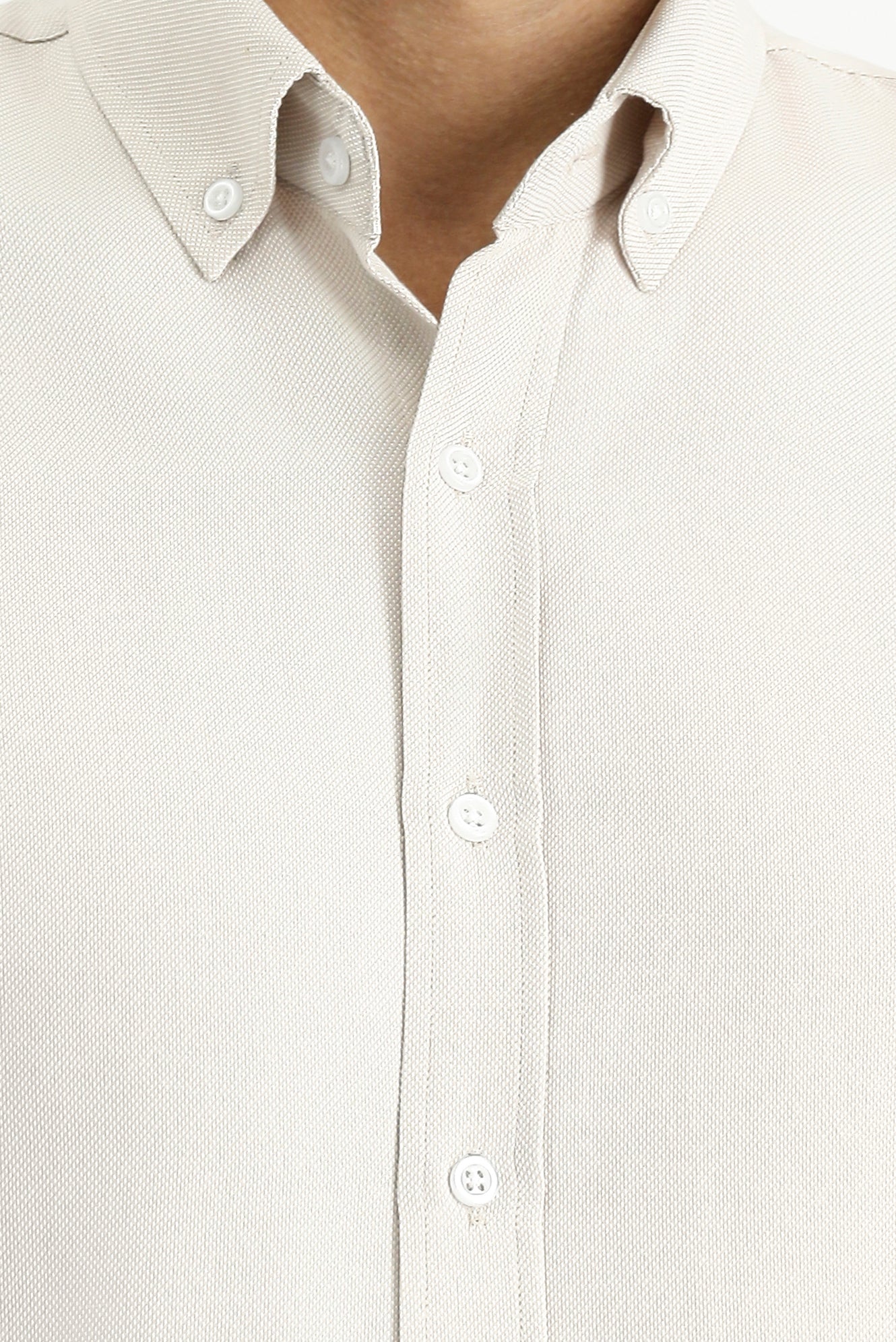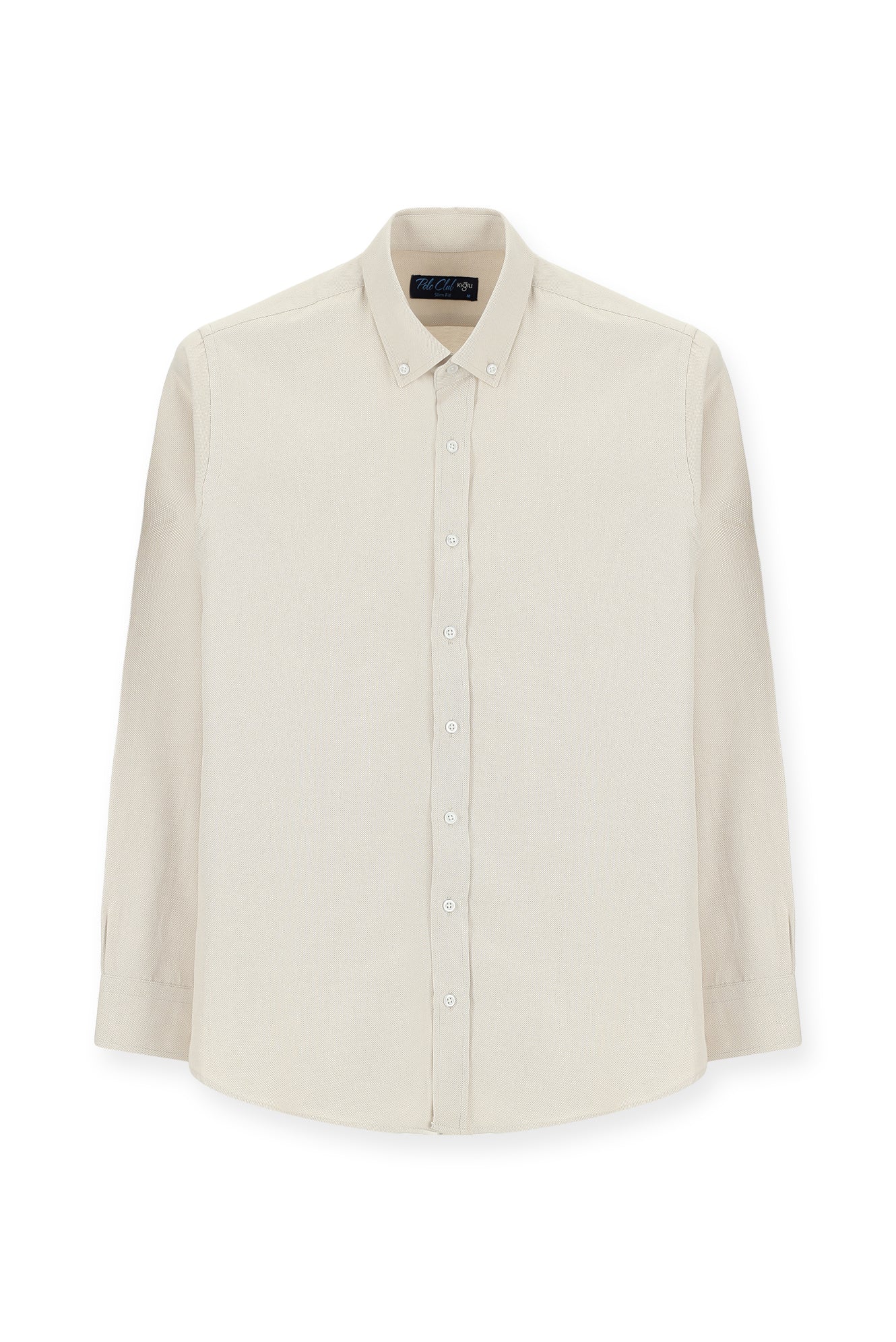 Orta Bej Uzun Kol Slim Fit Düğmeli Yaka Oxford Pamuklu Kolay Ütülenebilir Gömlek