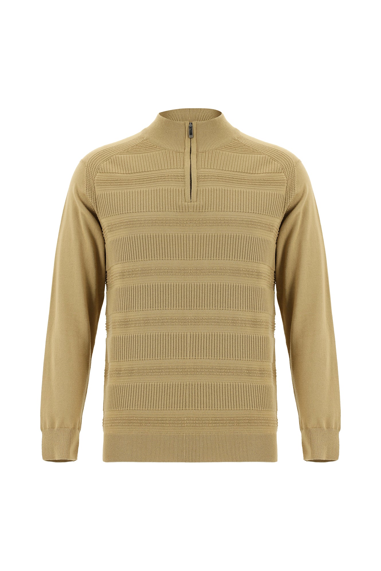 Orta Bej Yarım Balıkçı Yaka Regular Fit Fermuarlı Desenli Pamuklu Triko Kazak