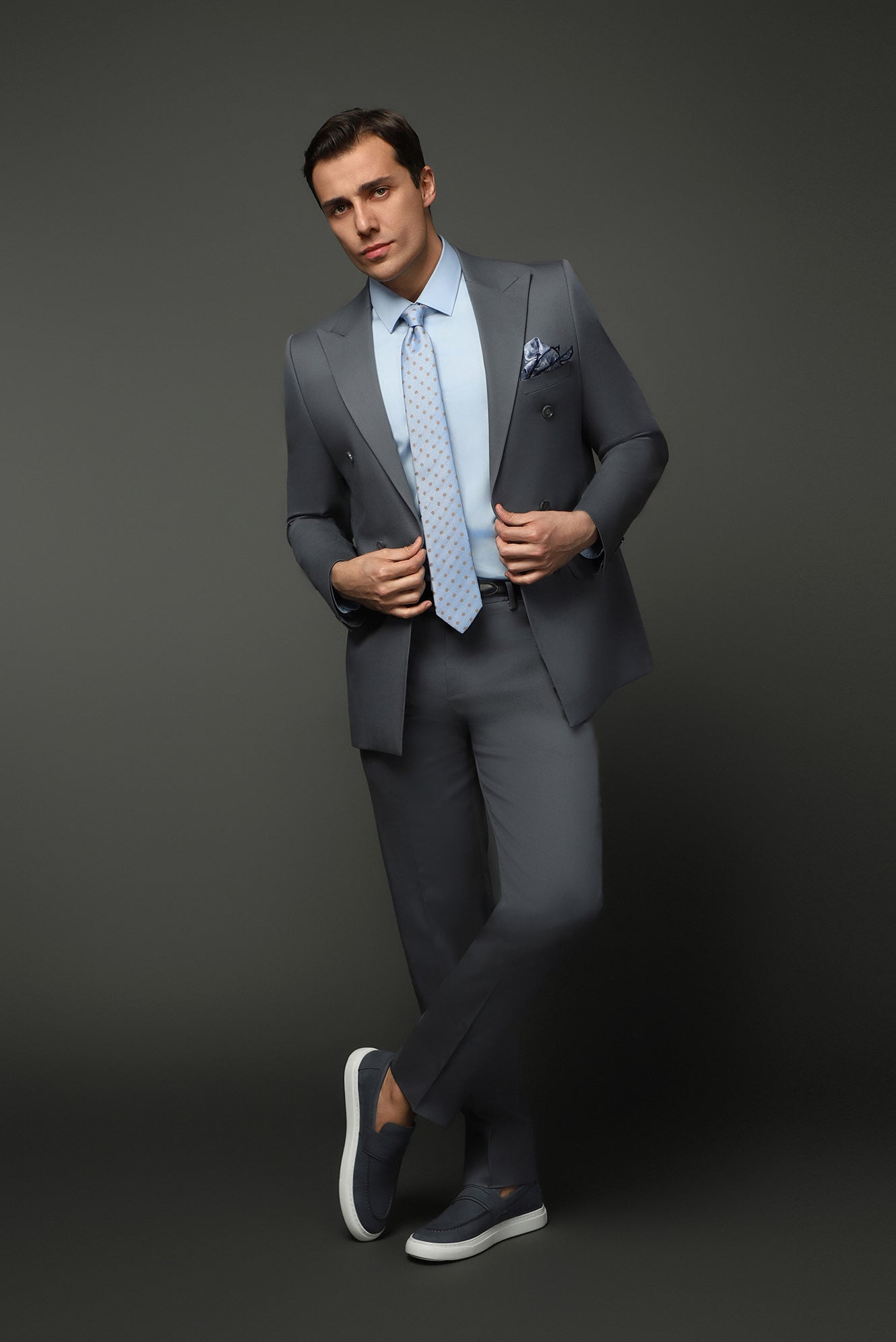 Orta Füme Regular Fit Pamuklu Lyocell Kruvaze Takım Elbise