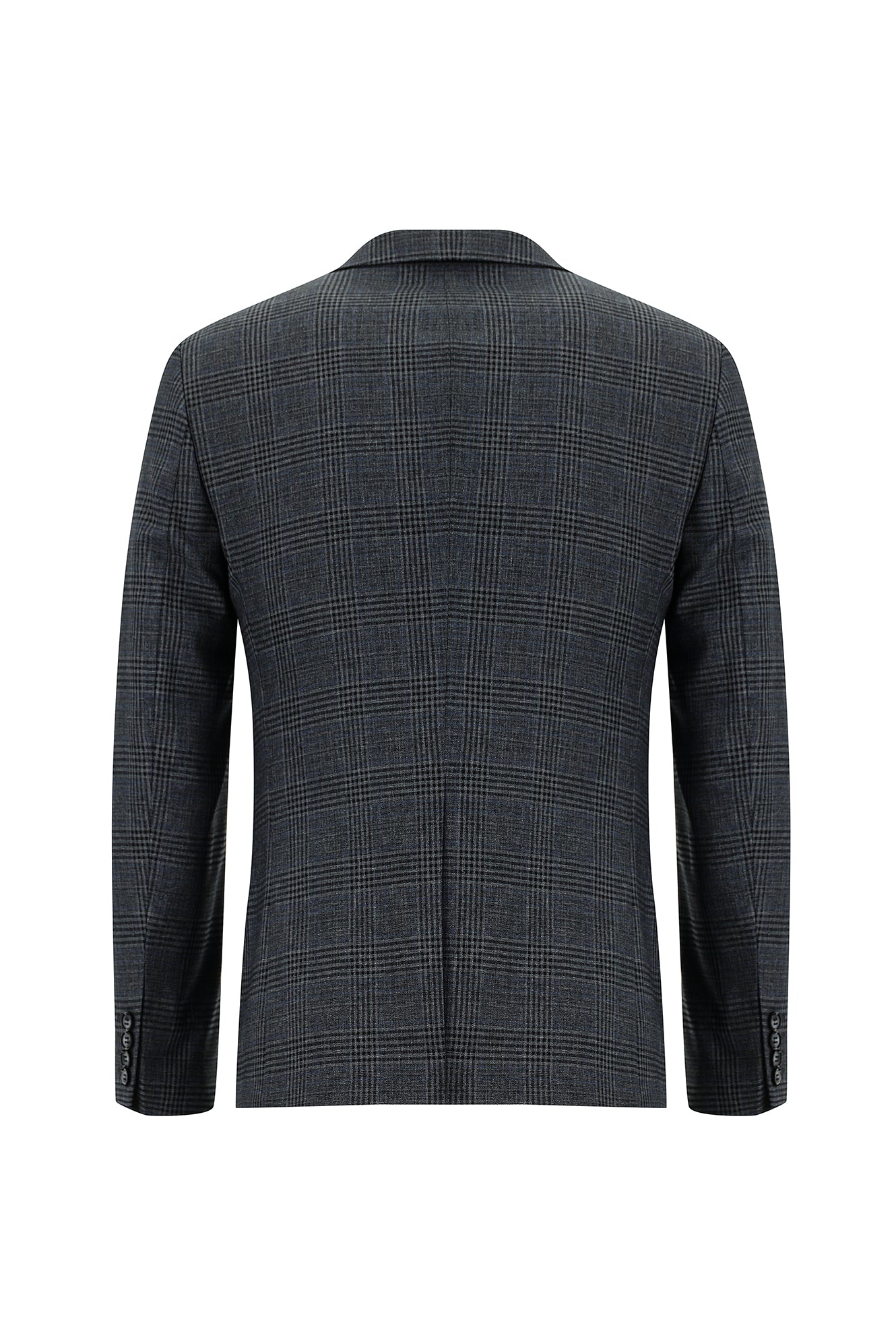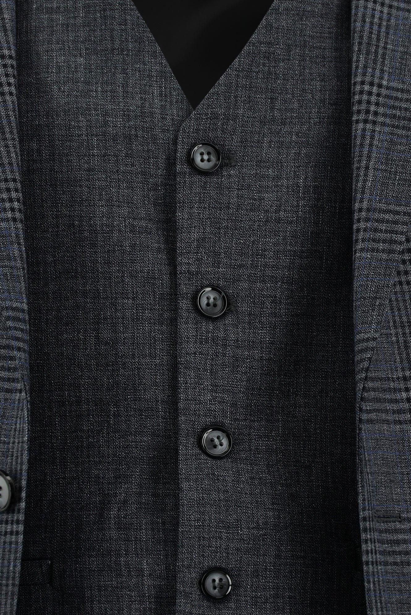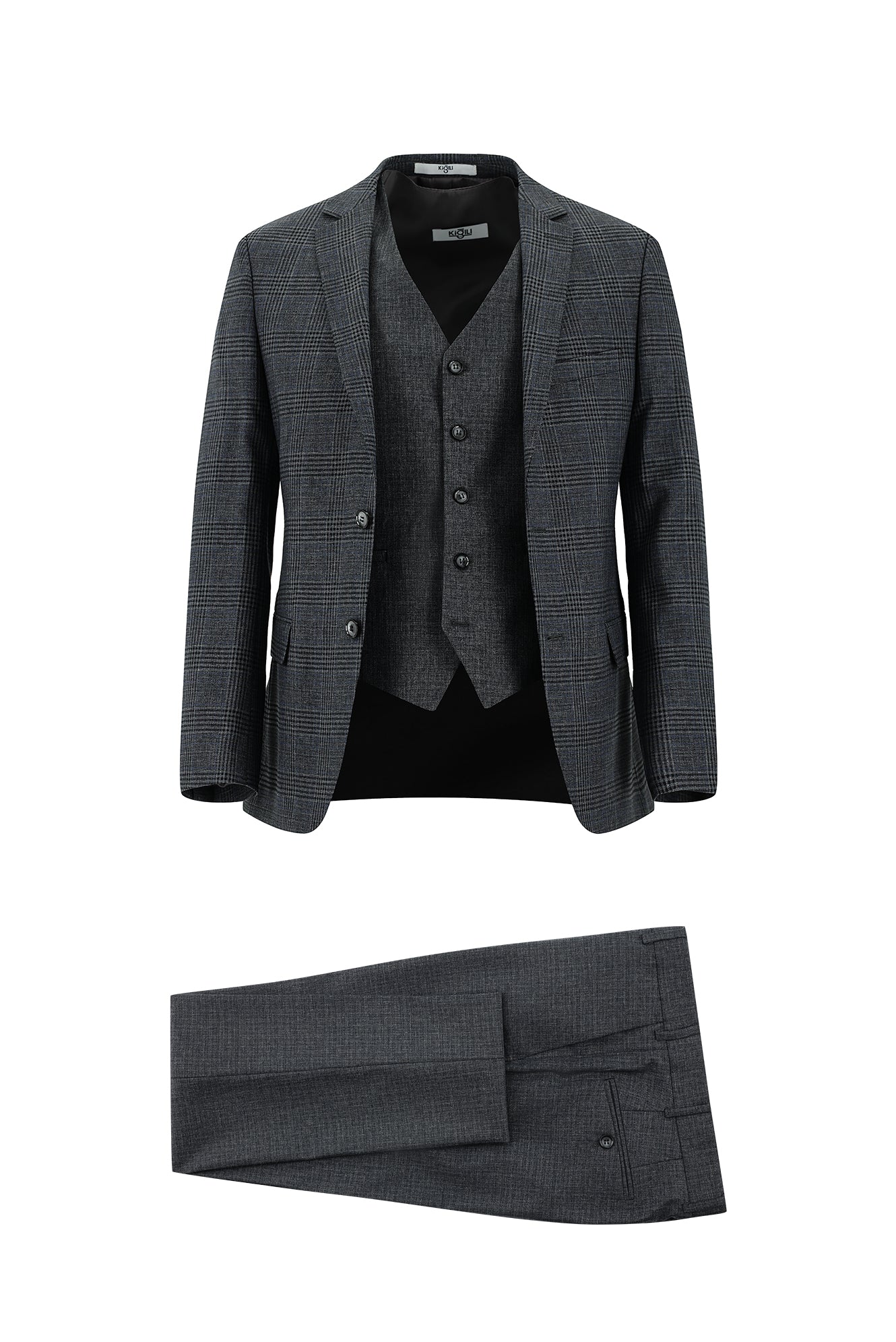 Orta Füme 7 Drop Slim Fit Dar Kesim Ekose Yelekli Kombinli Takım Elbise