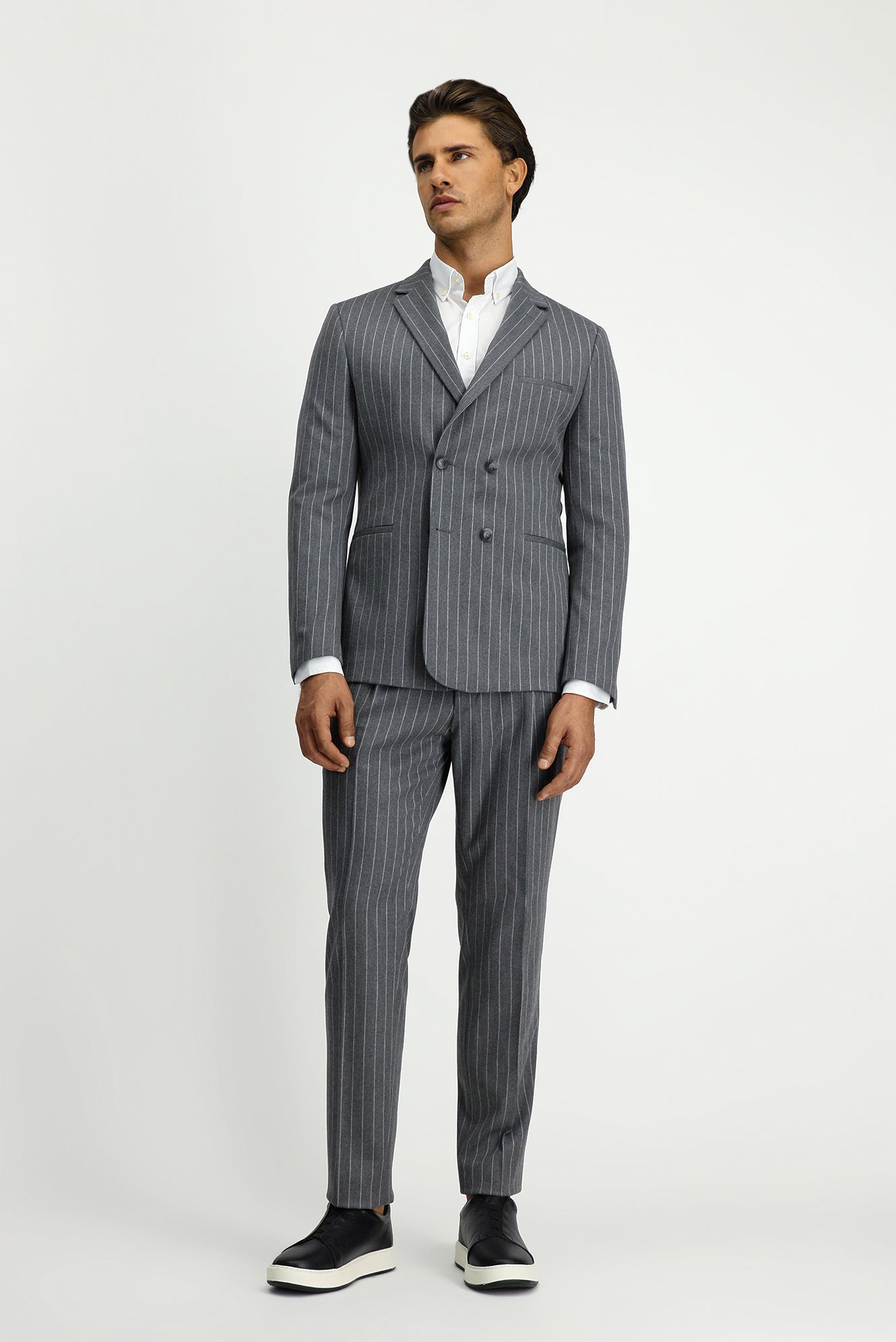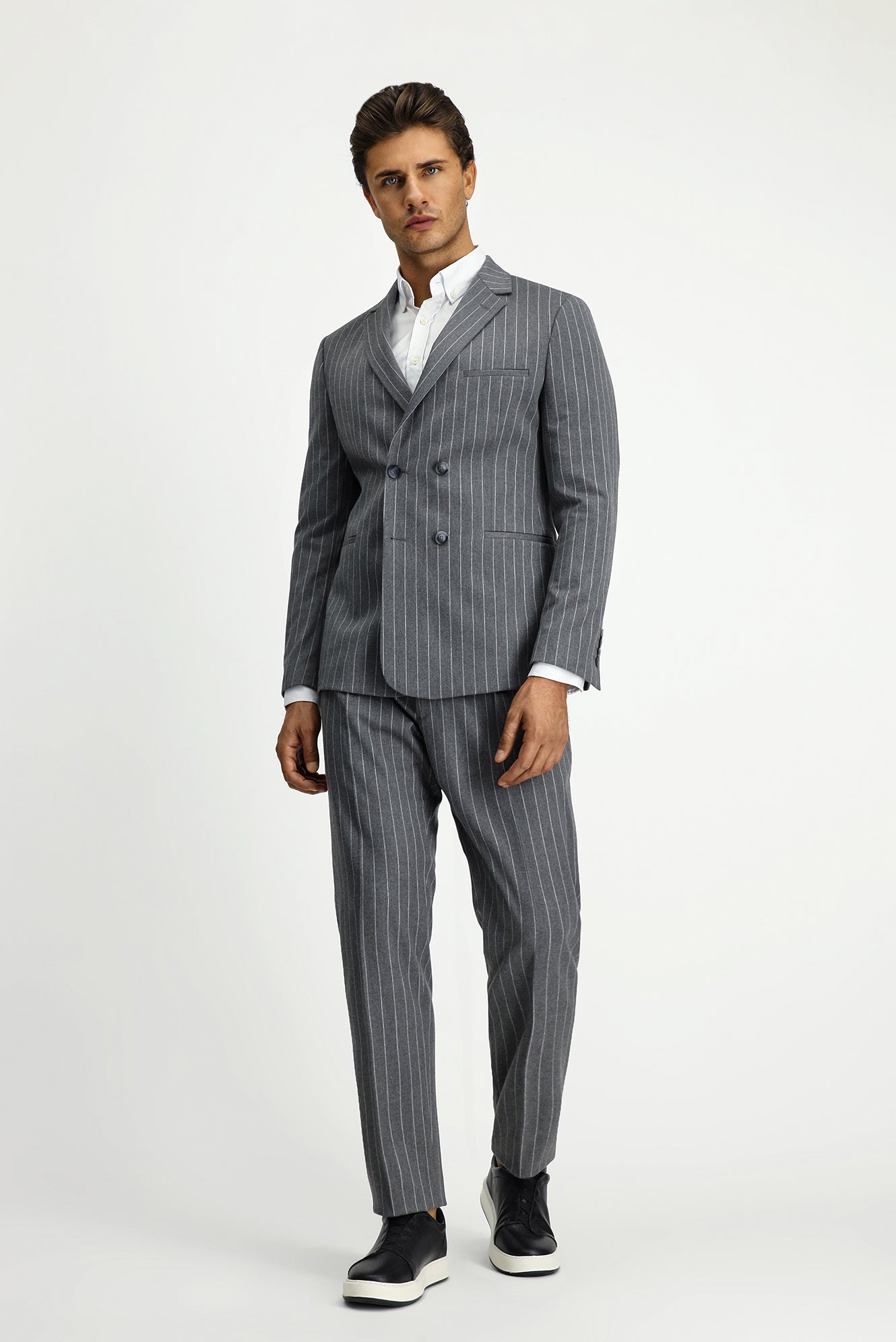 Orta Füme Slim Fit Dar Kesim Çizgili Beli Tokalı Kruvaze Takım Elbise
