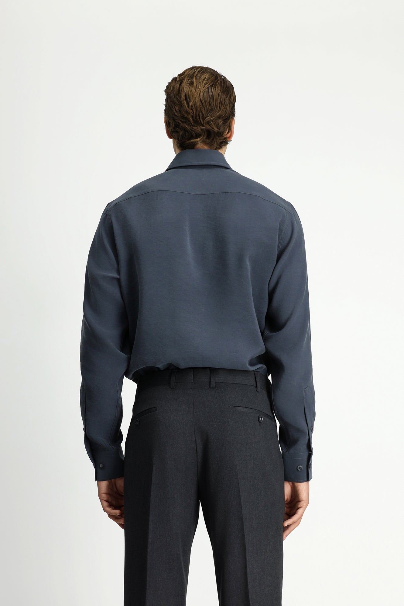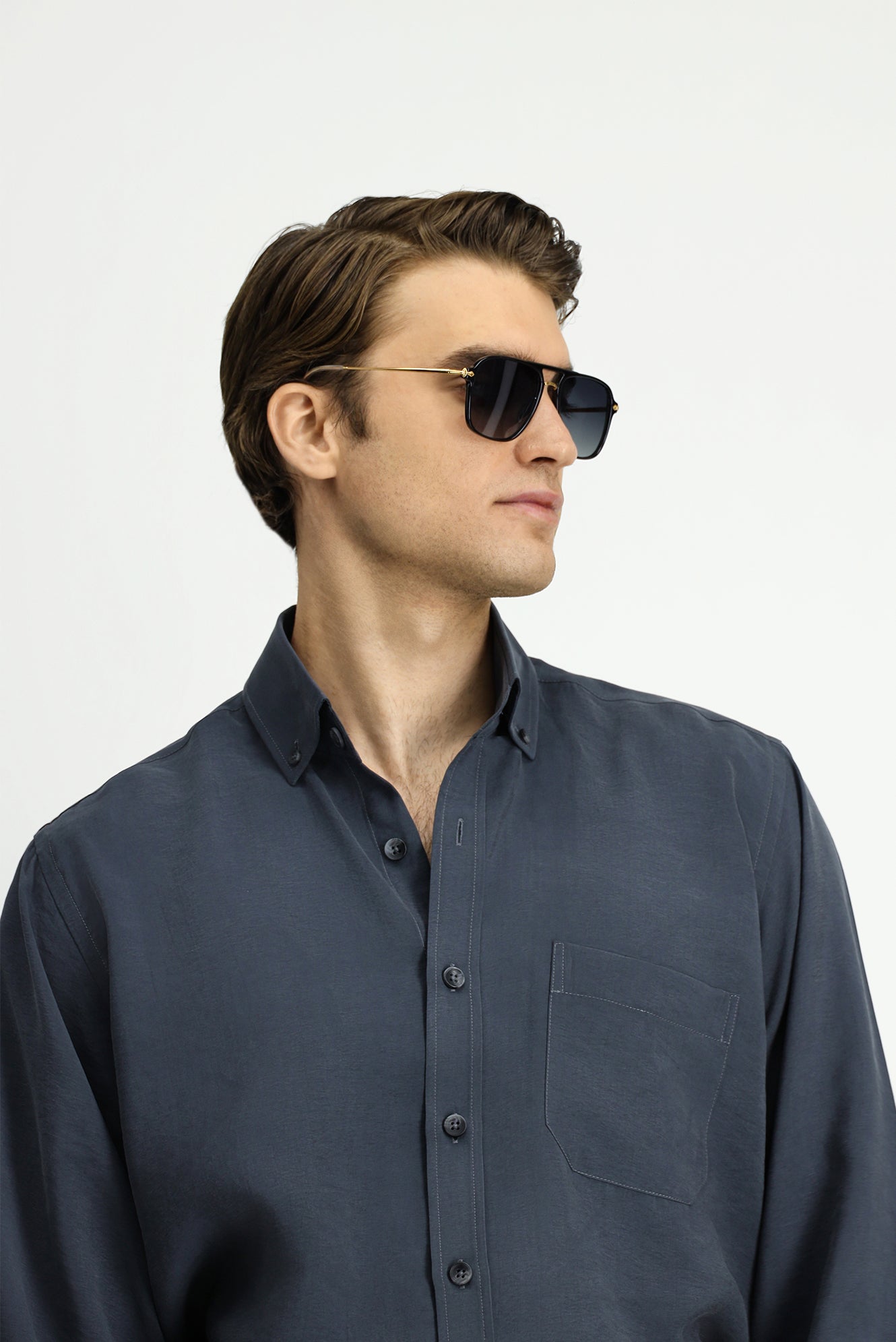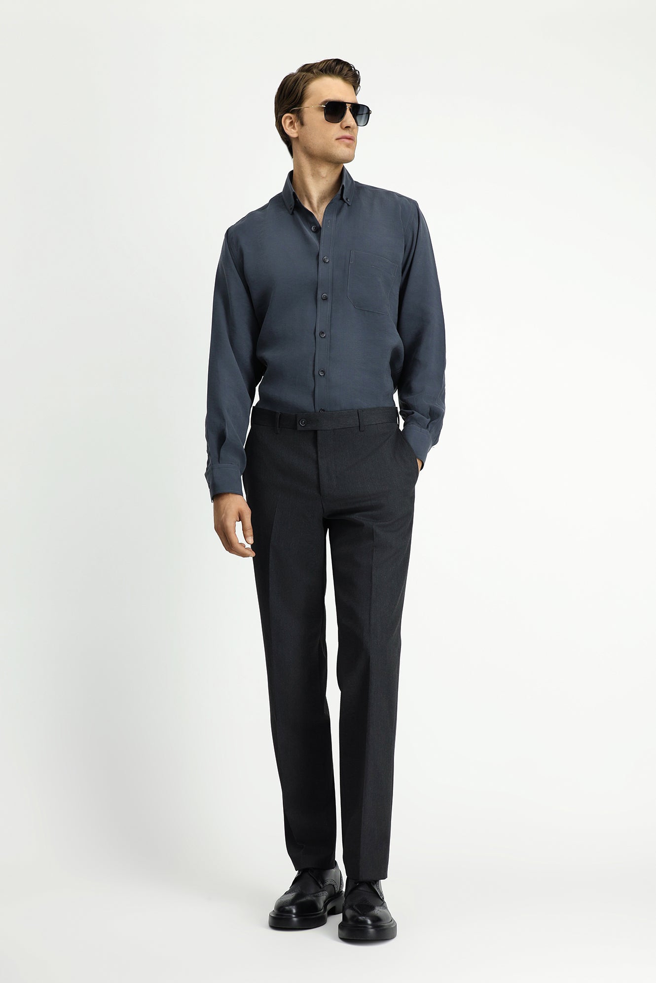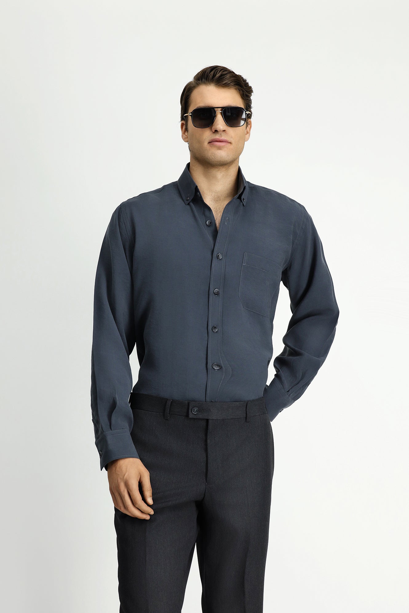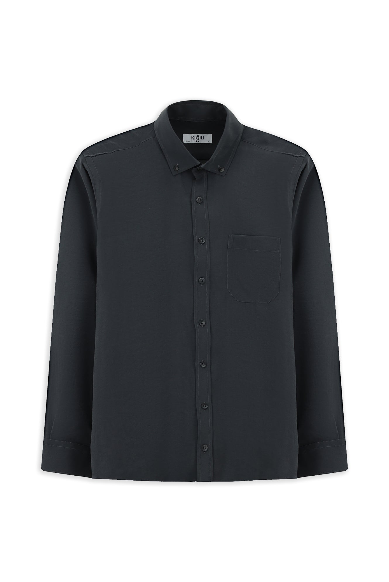 Orta Füme Uzun Kol Regular Fit Düğmeli Yaka Cepli Modal Karışımlı Gömlek