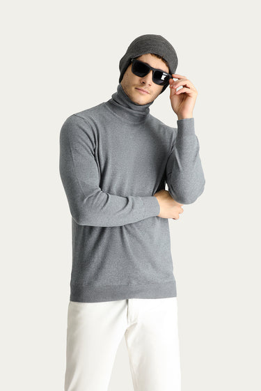 Orta Gri Melanj Balıkçı Yaka Regular Fit Pamuklu Triko Kazak
