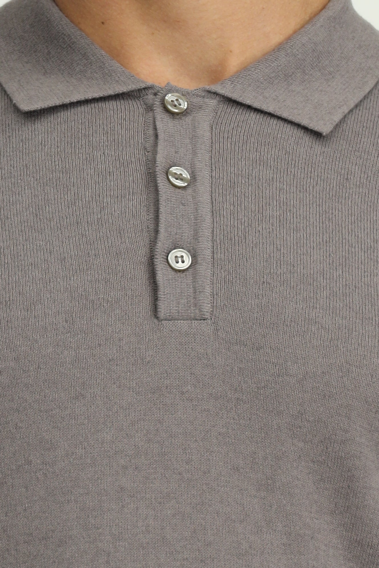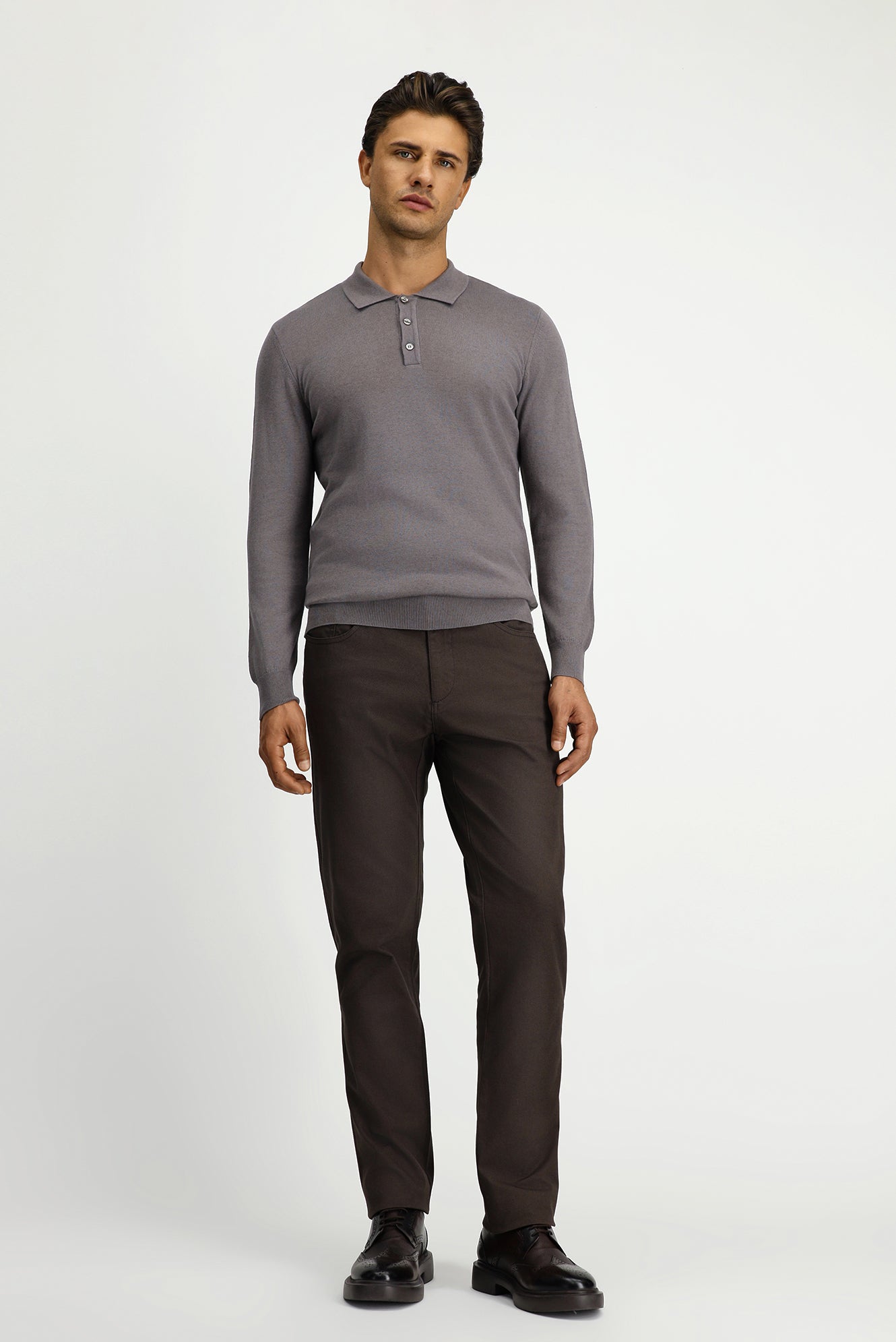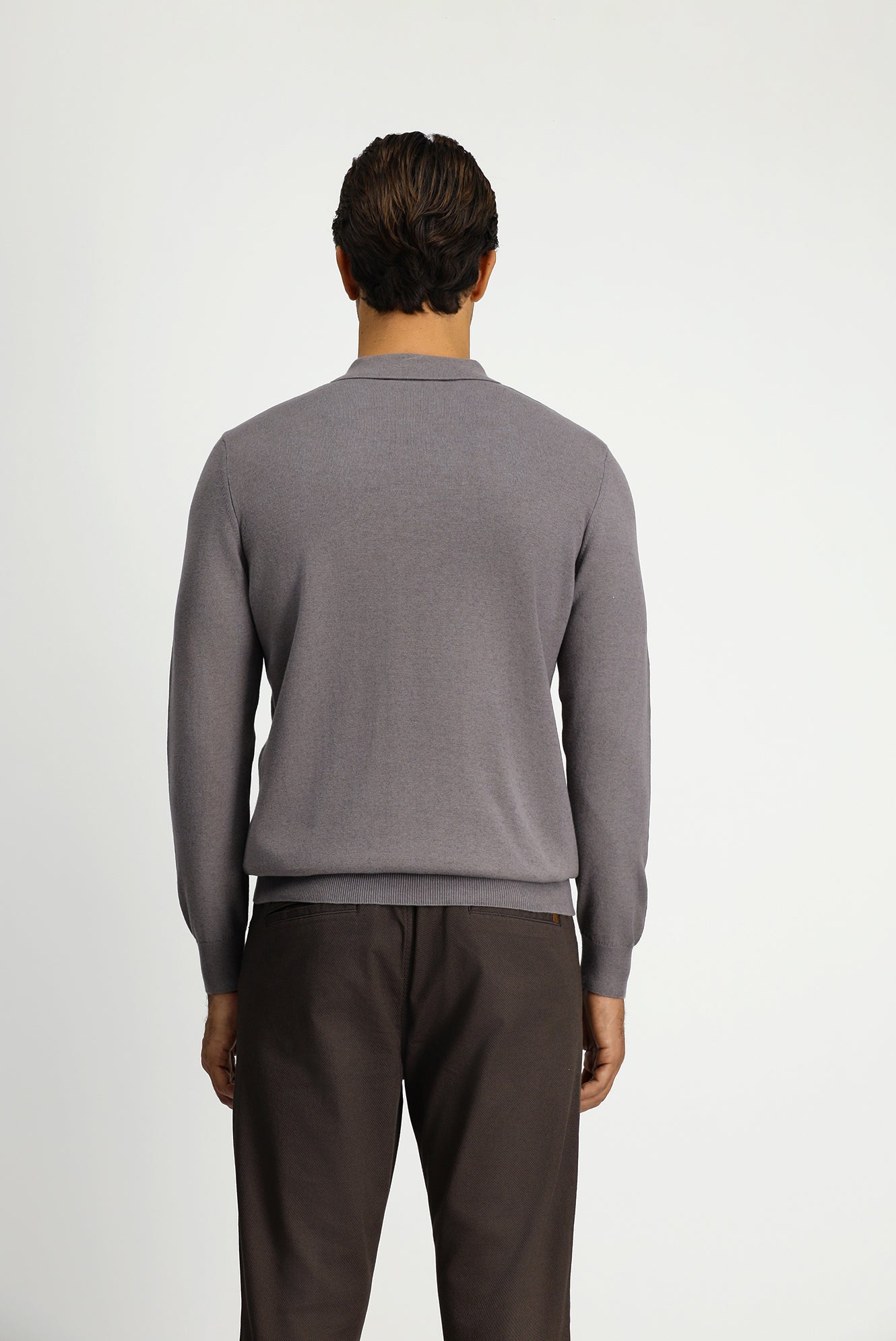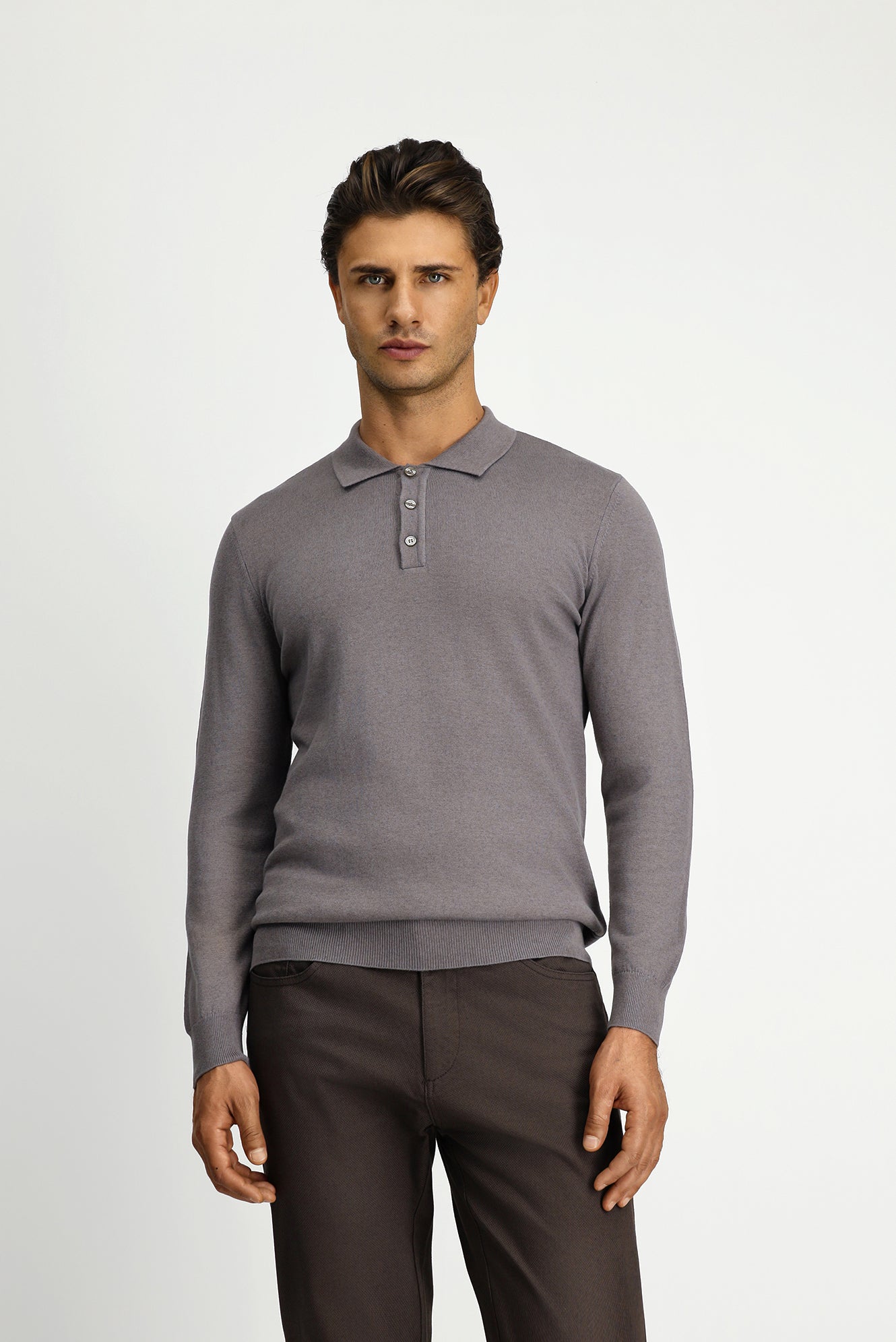 Orta Gri Melanj Polo Yaka Regular Fit Pamuklu Kaşmirli Triko Kazak