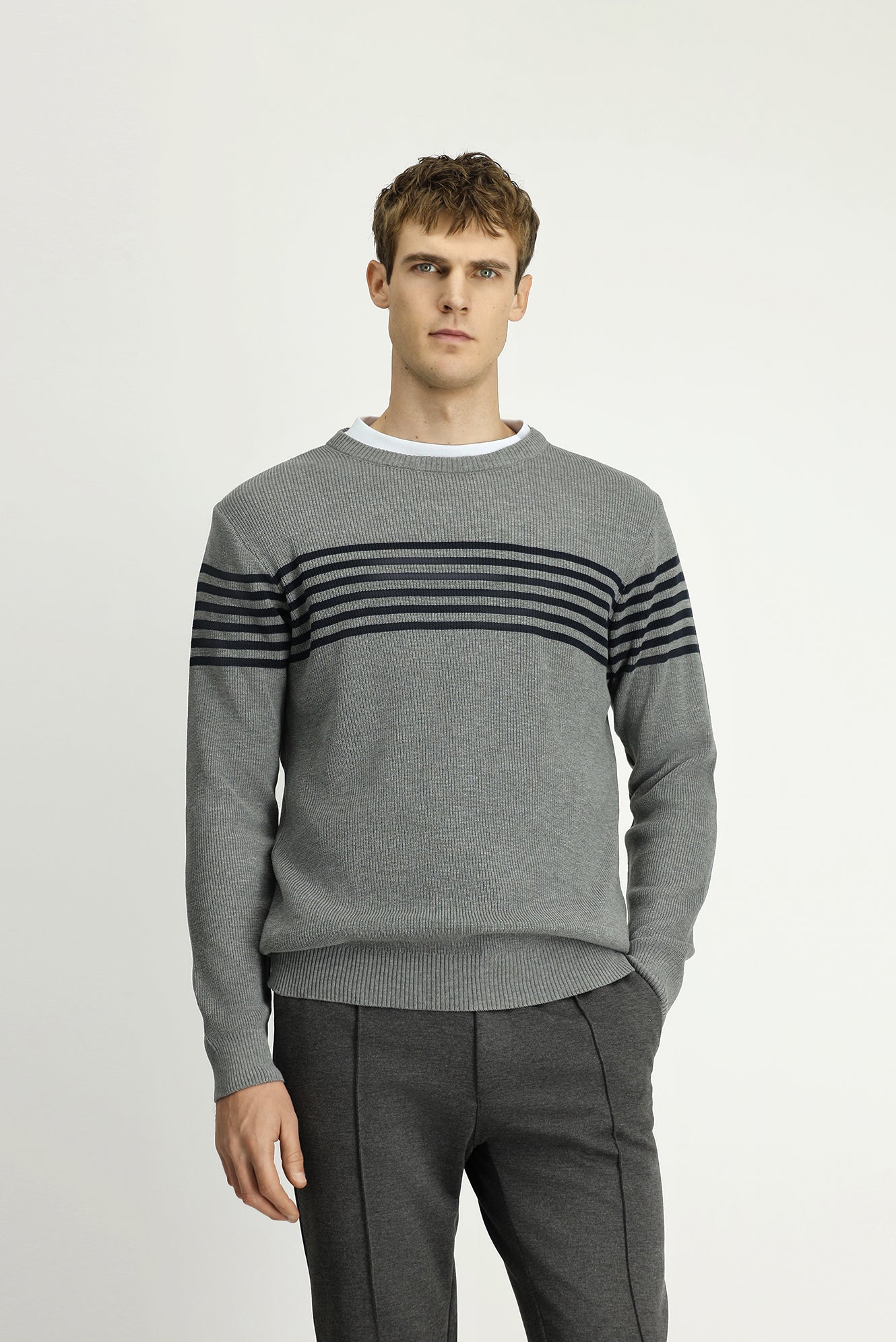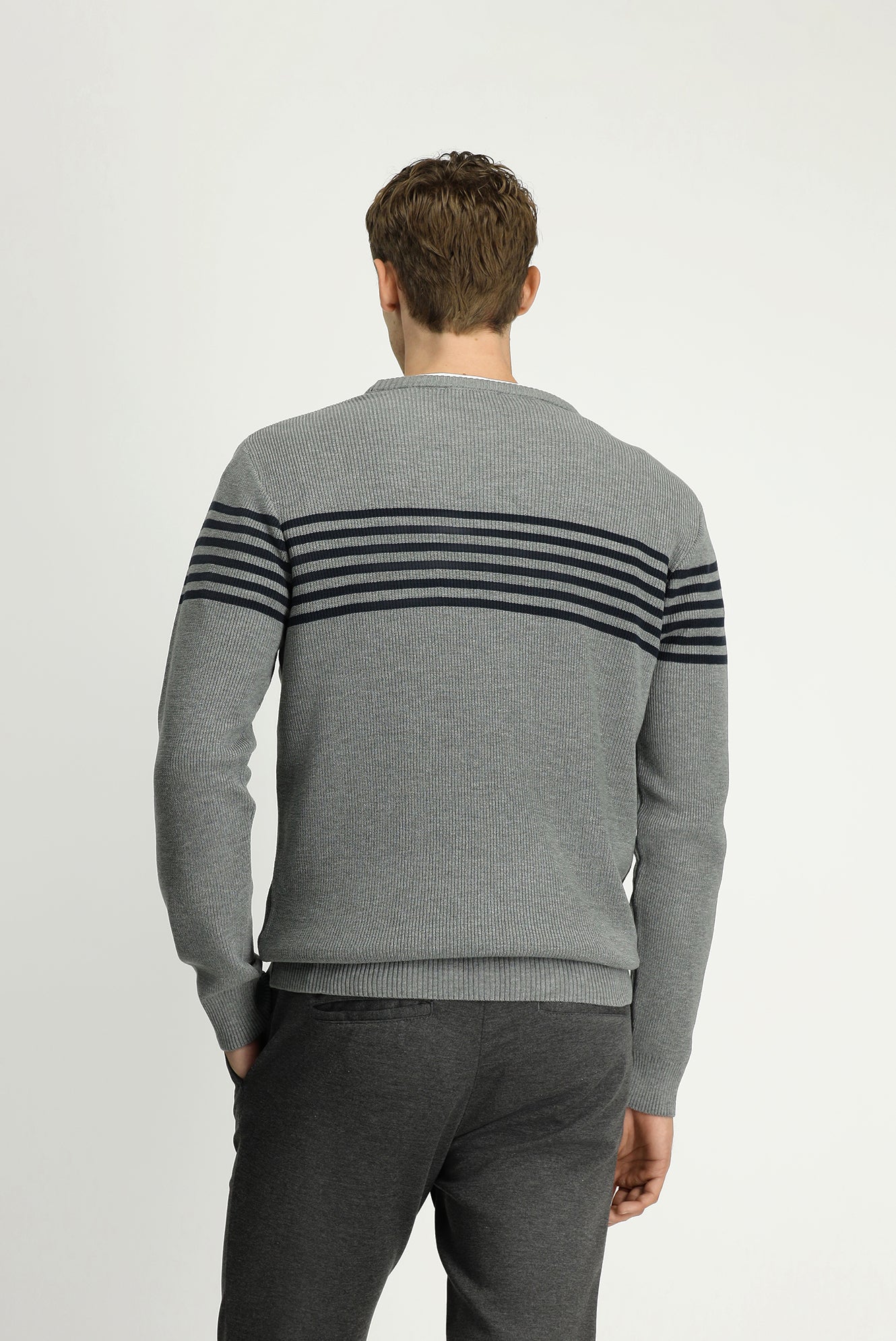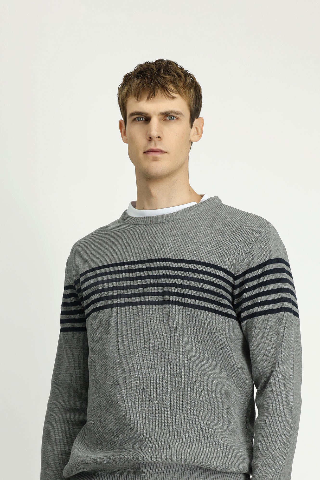 Orta Gri Melanj Bisiklet Yaka Regular Fit Çizgili Triko Kazak