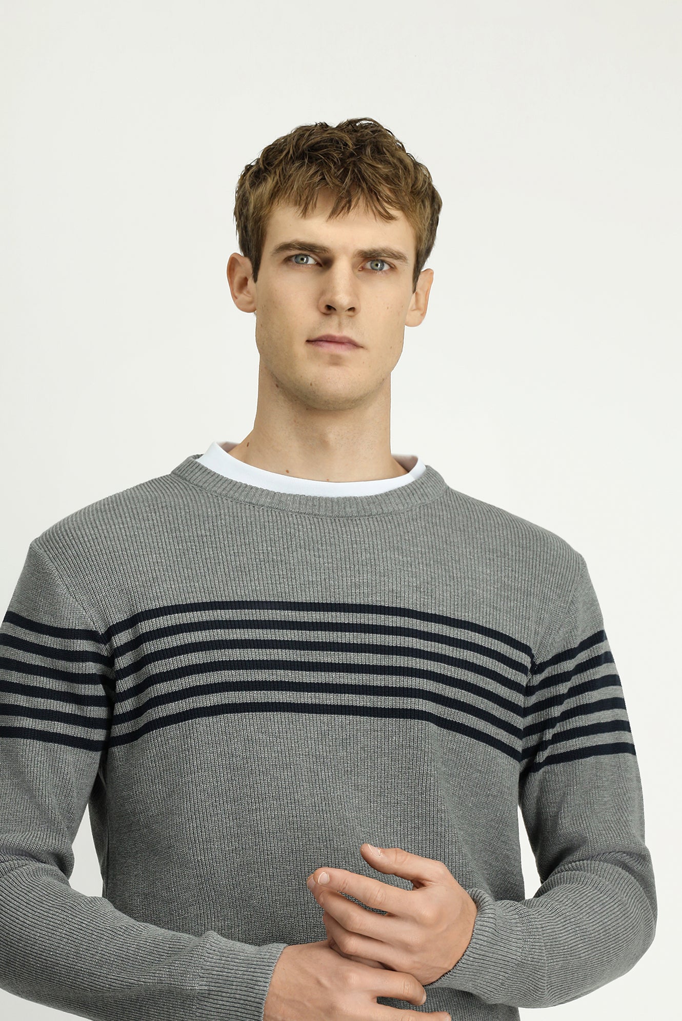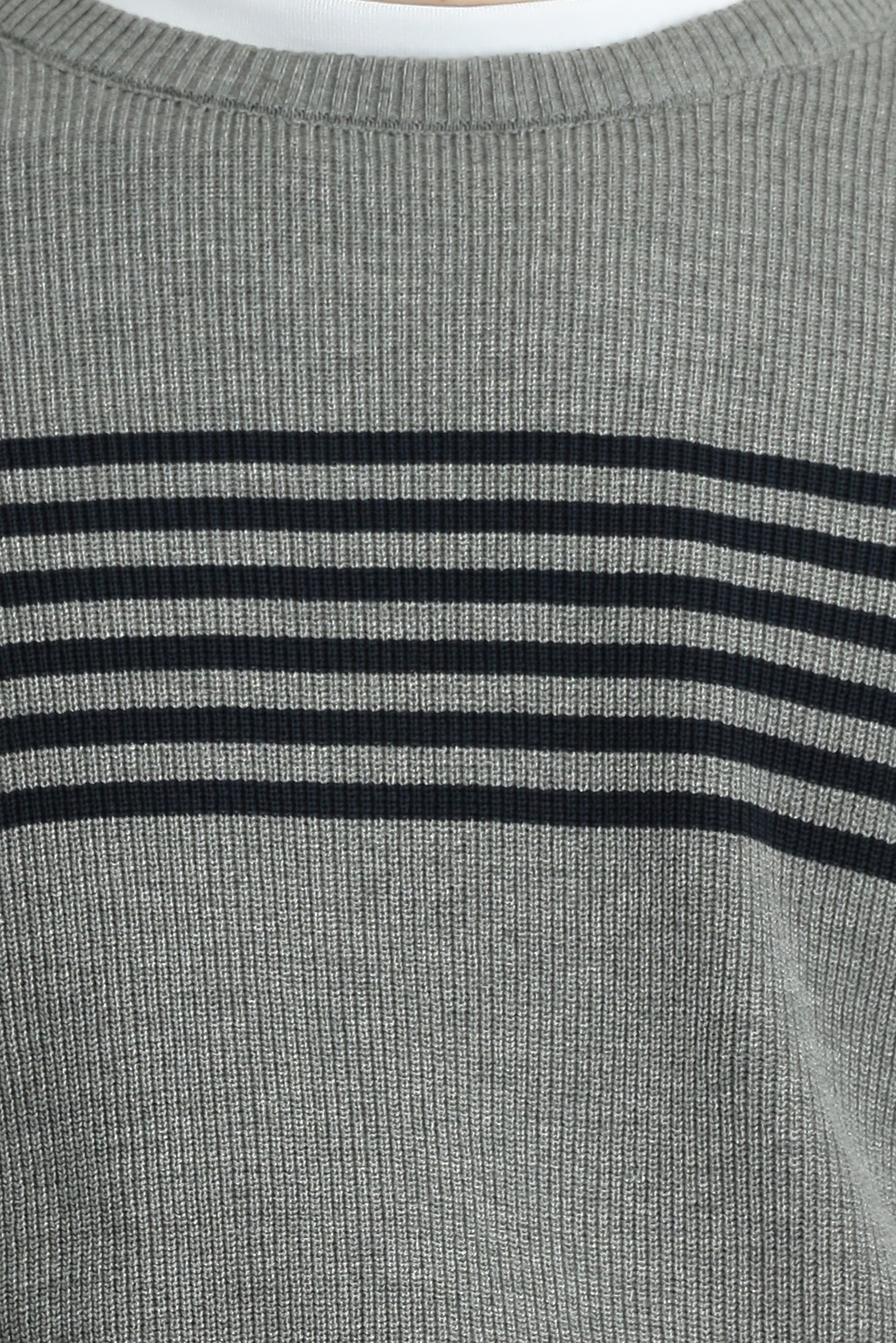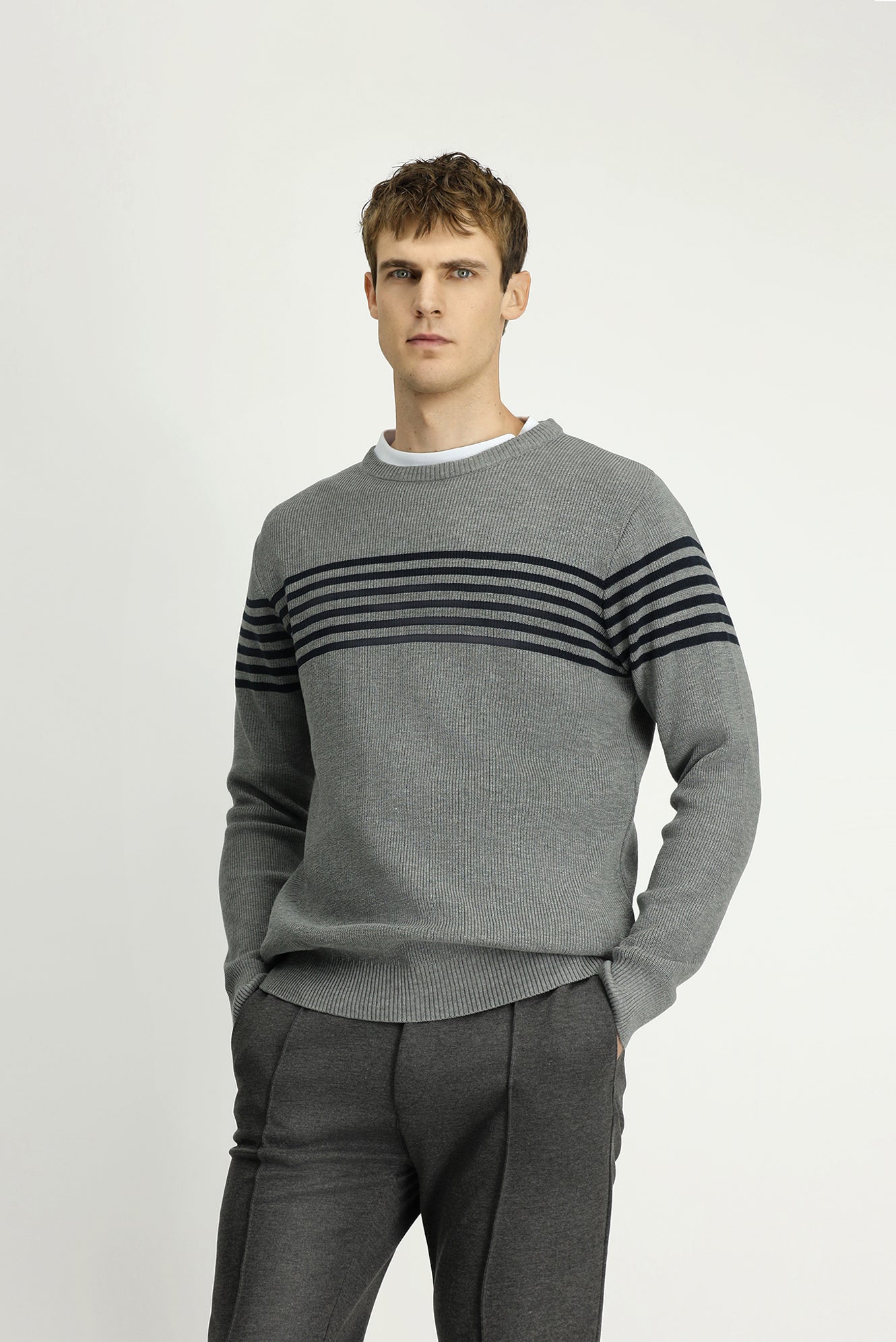 Orta Gri Melanj Bisiklet Yaka Regular Fit Çizgili Triko Kazak