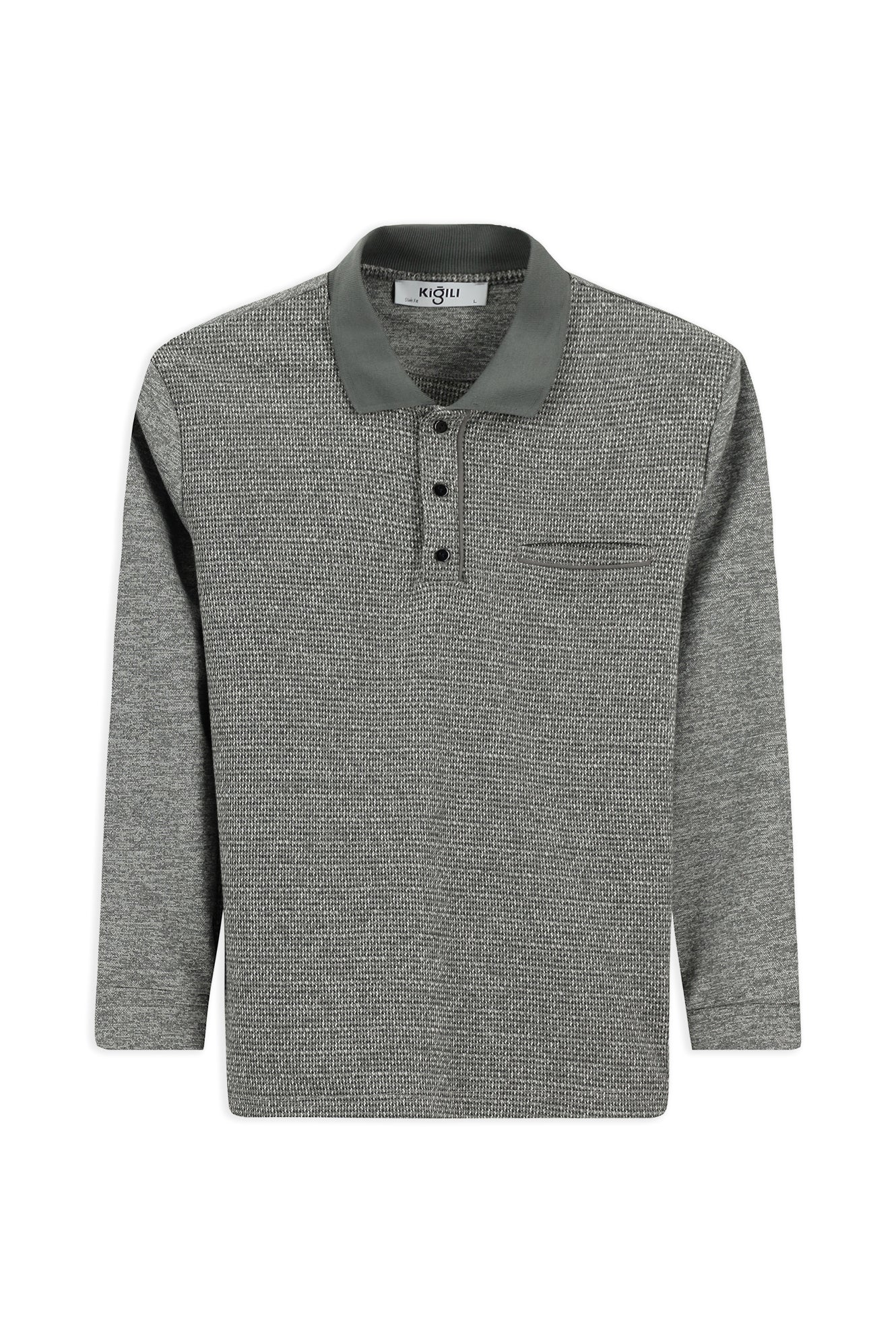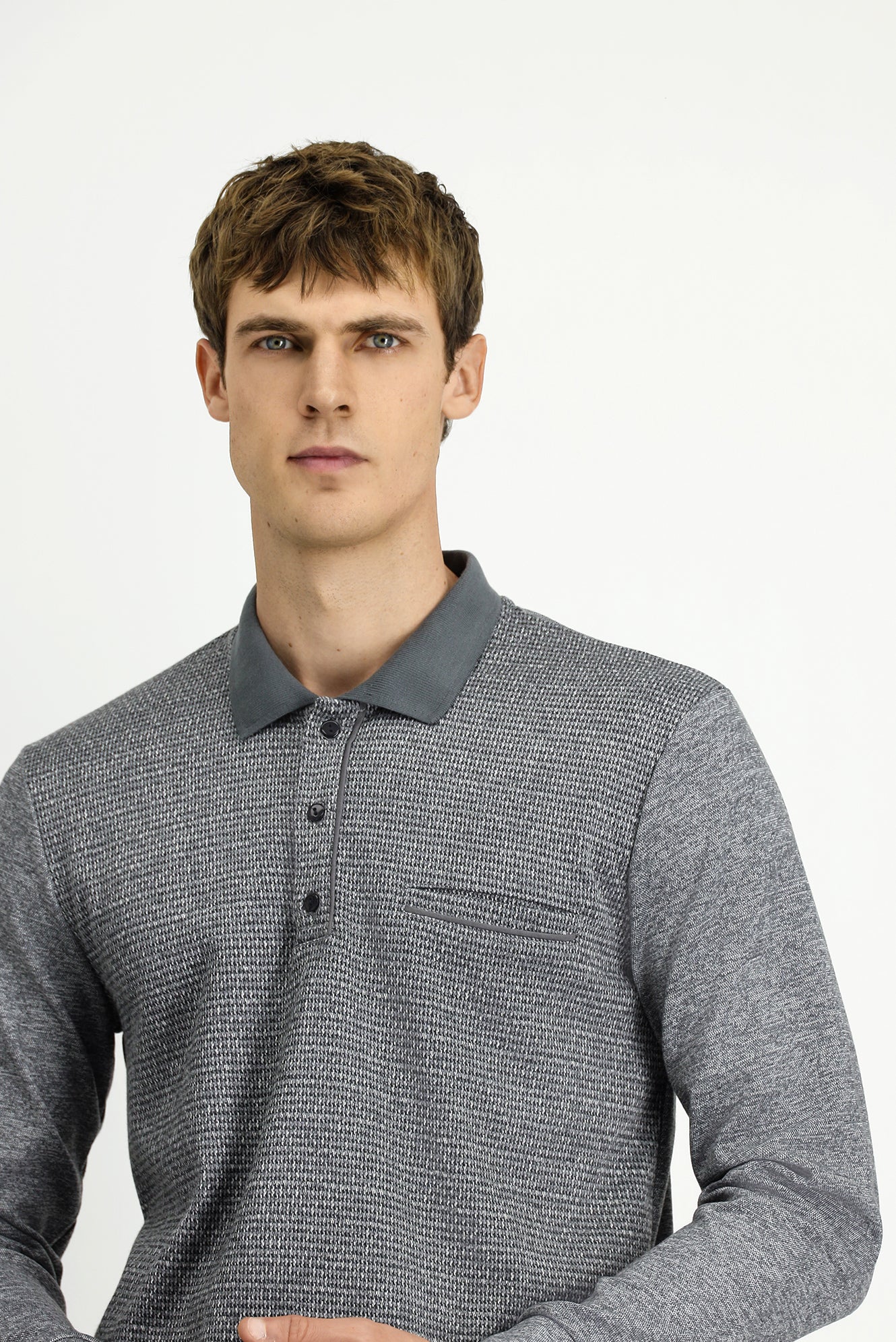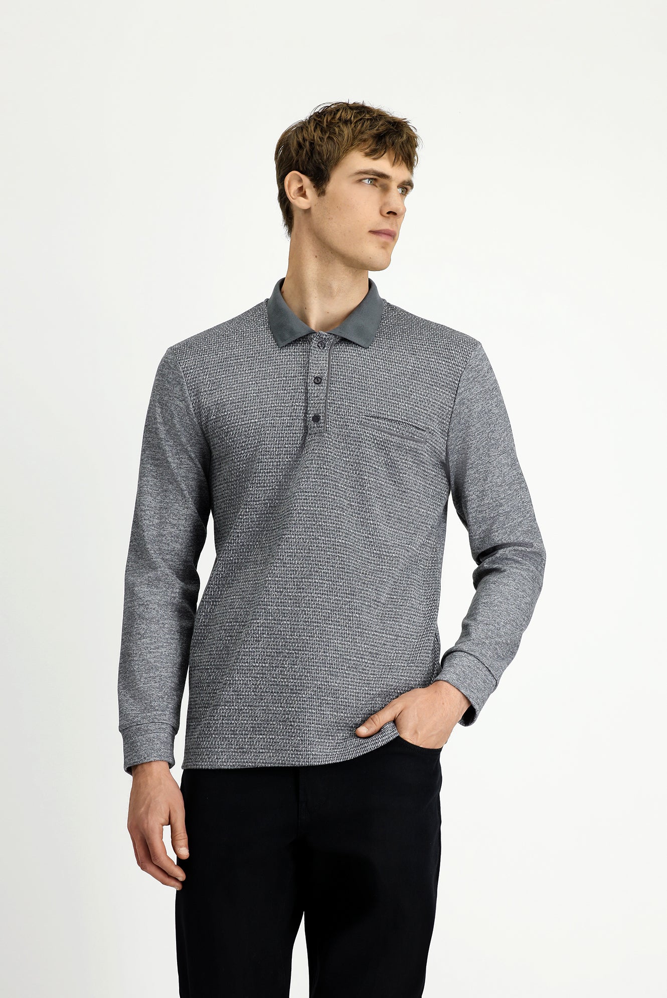 Orta Gri Melanj Polo Yaka Regular Fit Desenli Pamuklu Sweatshit