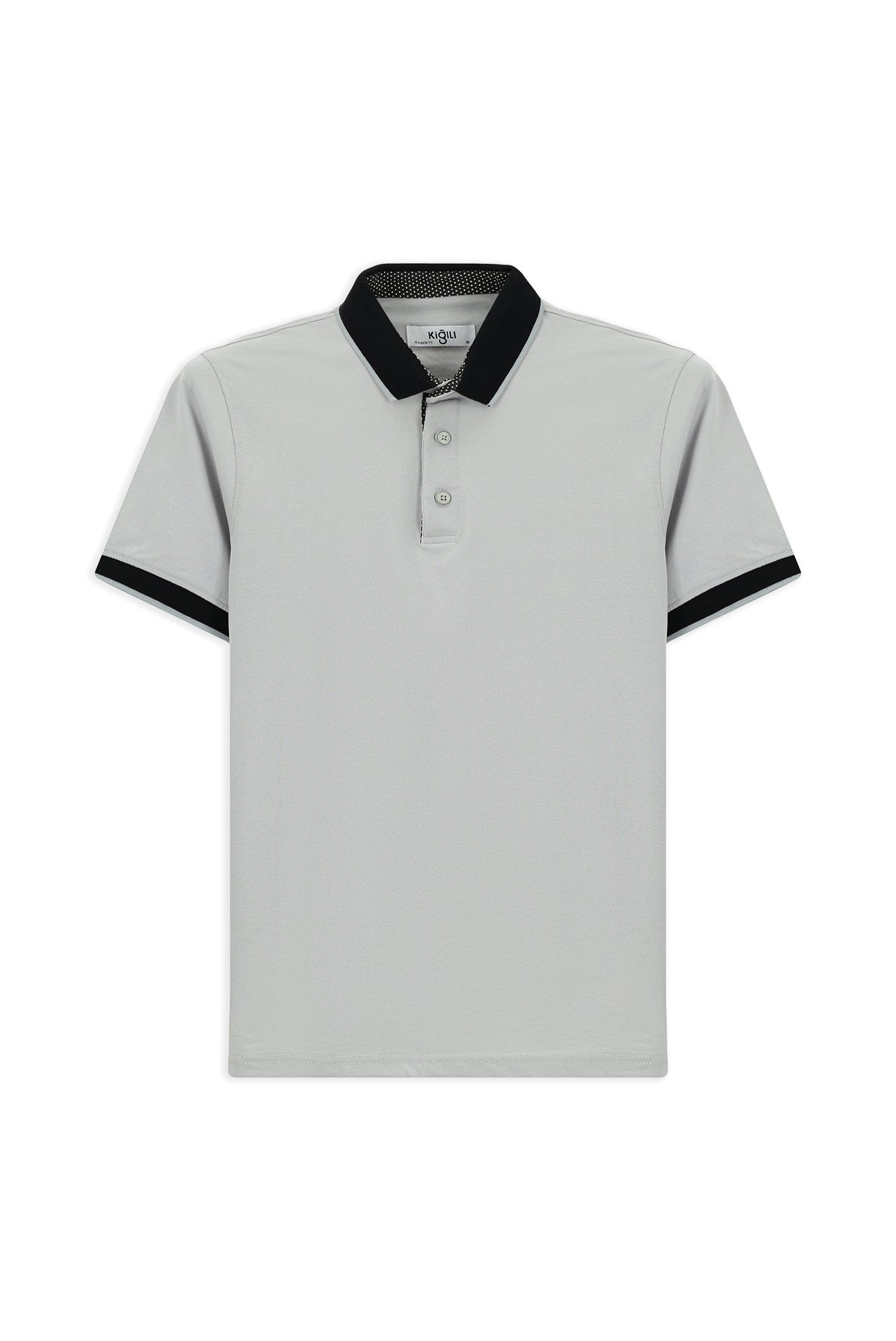 Orta Gri Polo Yaka Regular Fit Desenli Pamuklu Tişört