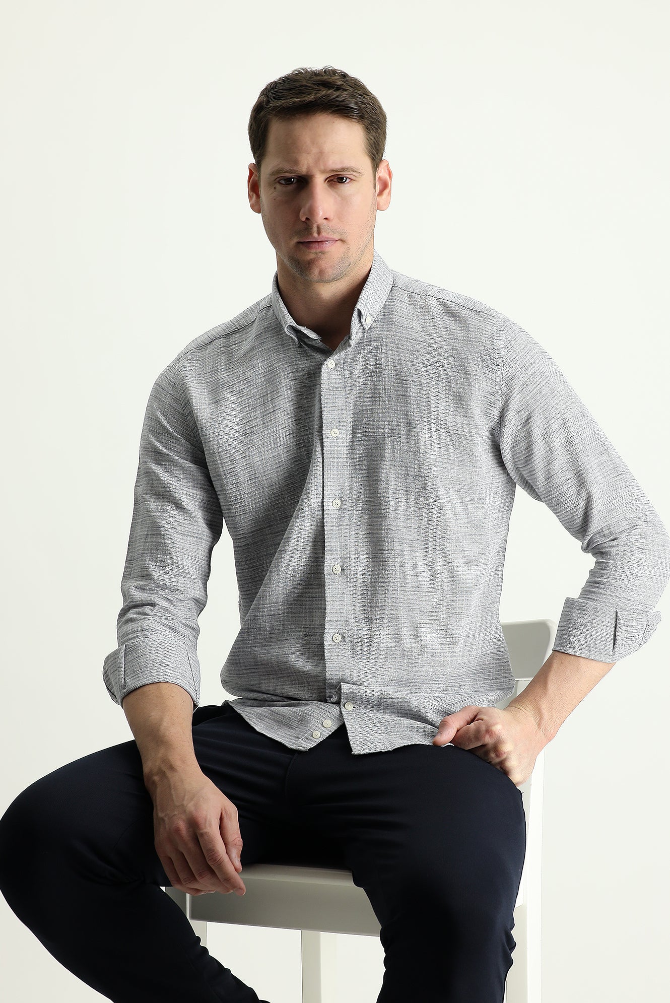 Orta Gri Uzun Kol Slim Fit Dar Kesim Keten Görünümlü Pamuk Spor Düğmeli Yaka Gömlek