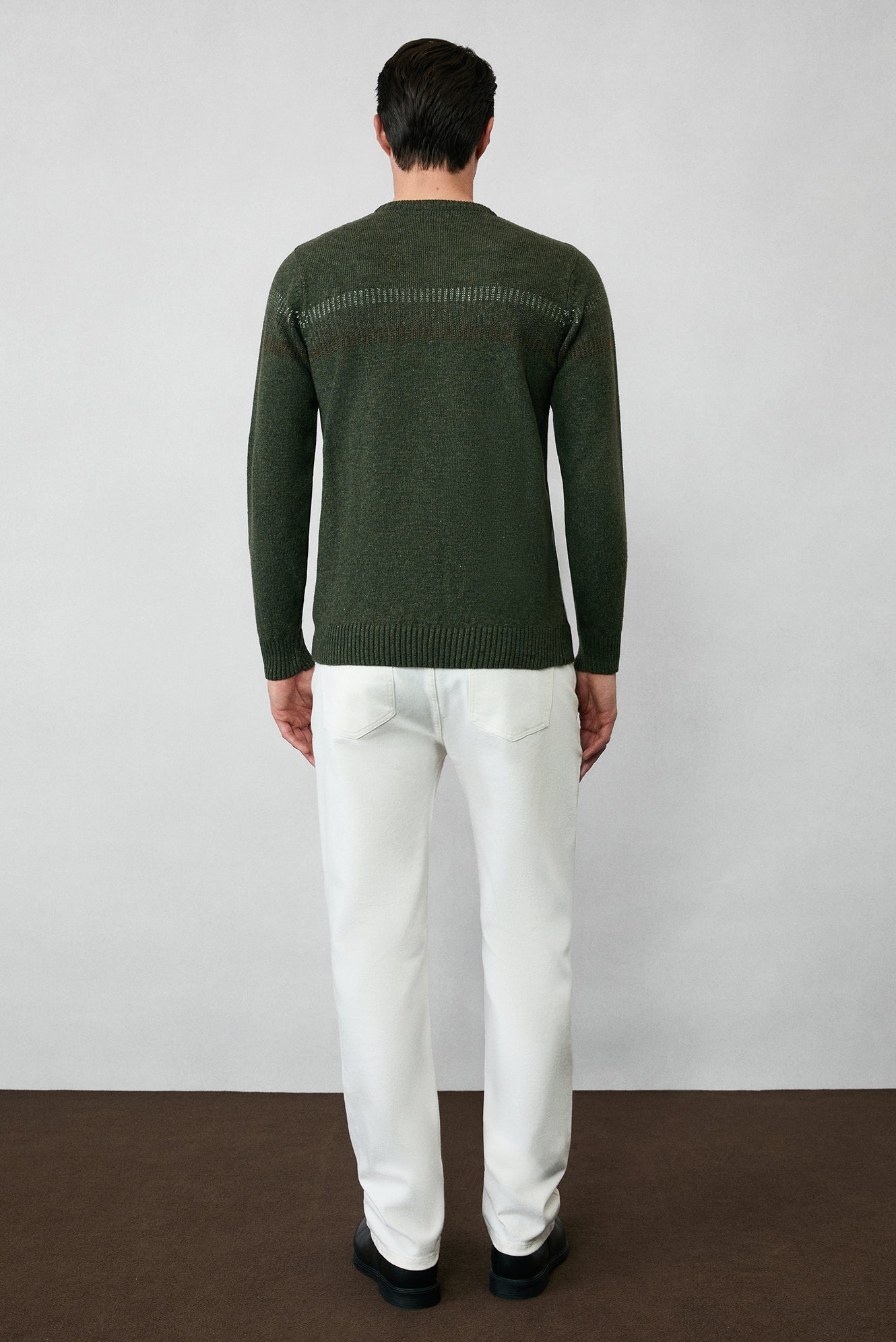 Orta Haki Bisiklet Yaka Regular Fit Yünlü Desenli Triko Kazak