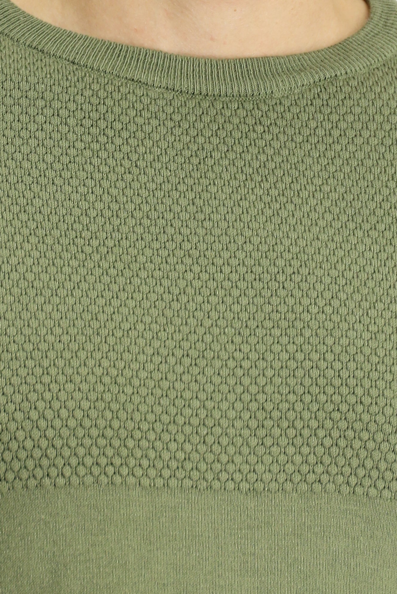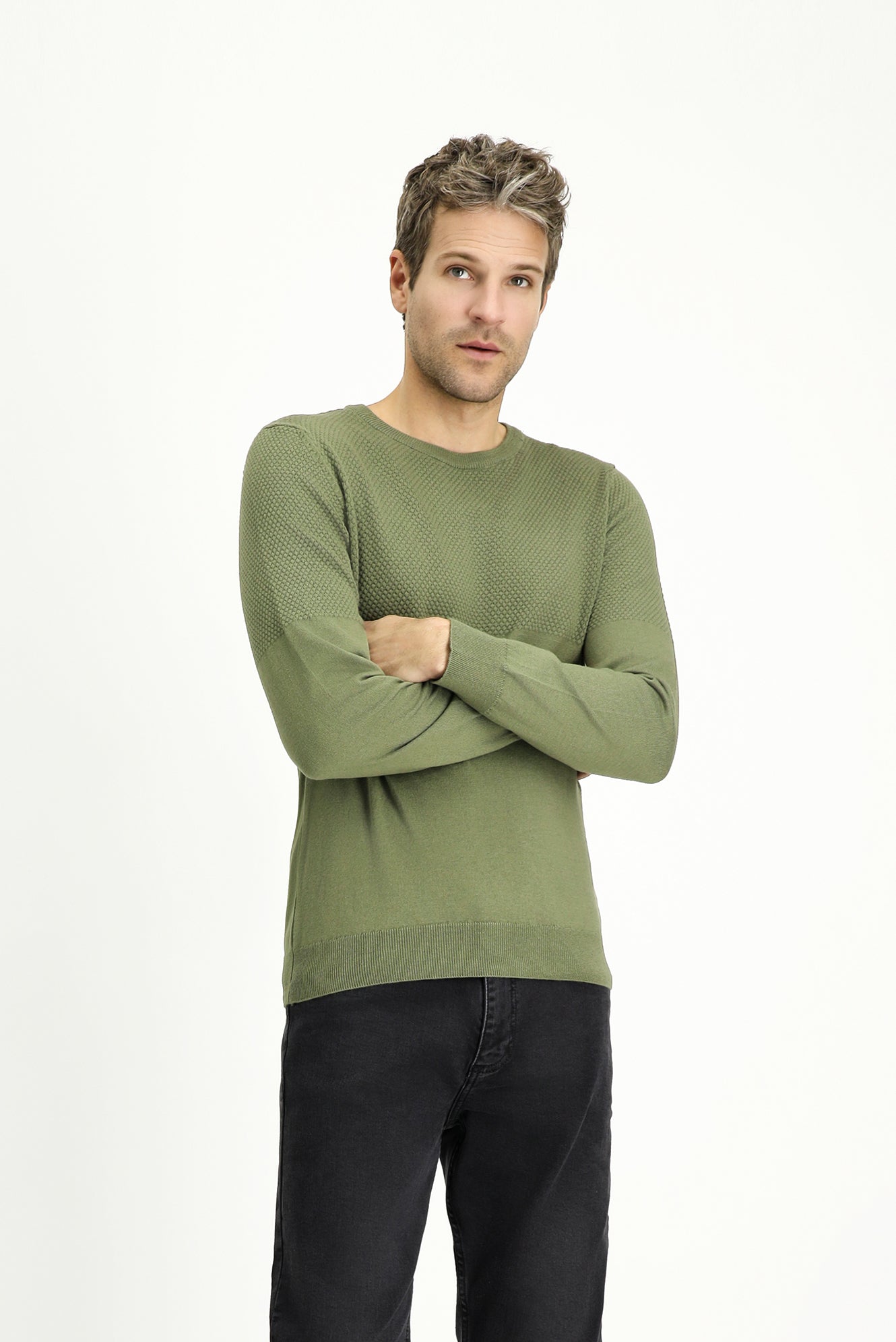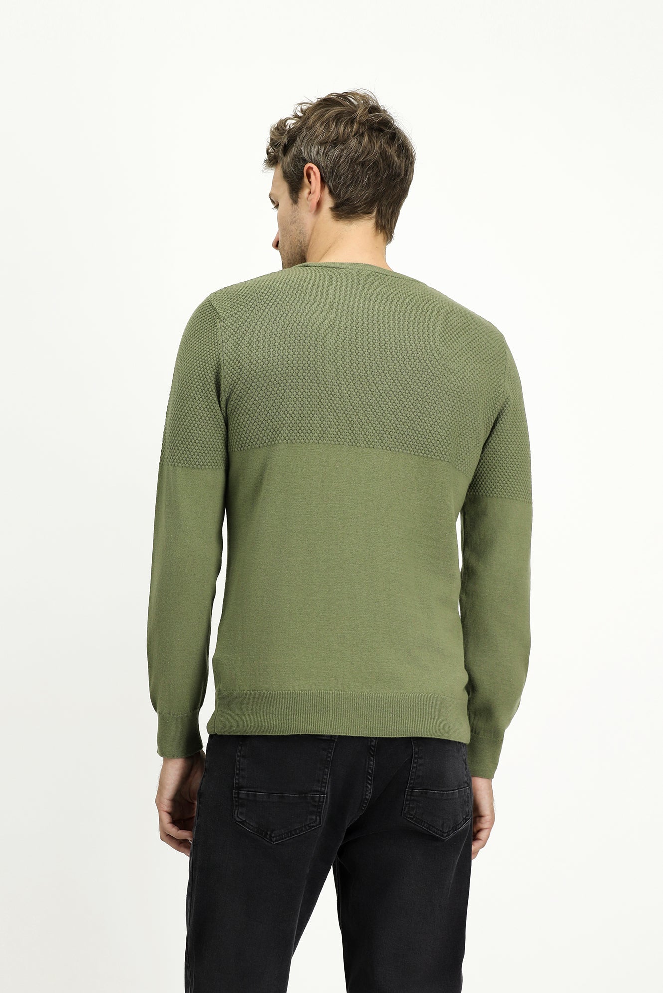 Orta Haki Bisiklet Yaka Slim Fit Dar Kesim Desenli Pamuklu Triko Kazak