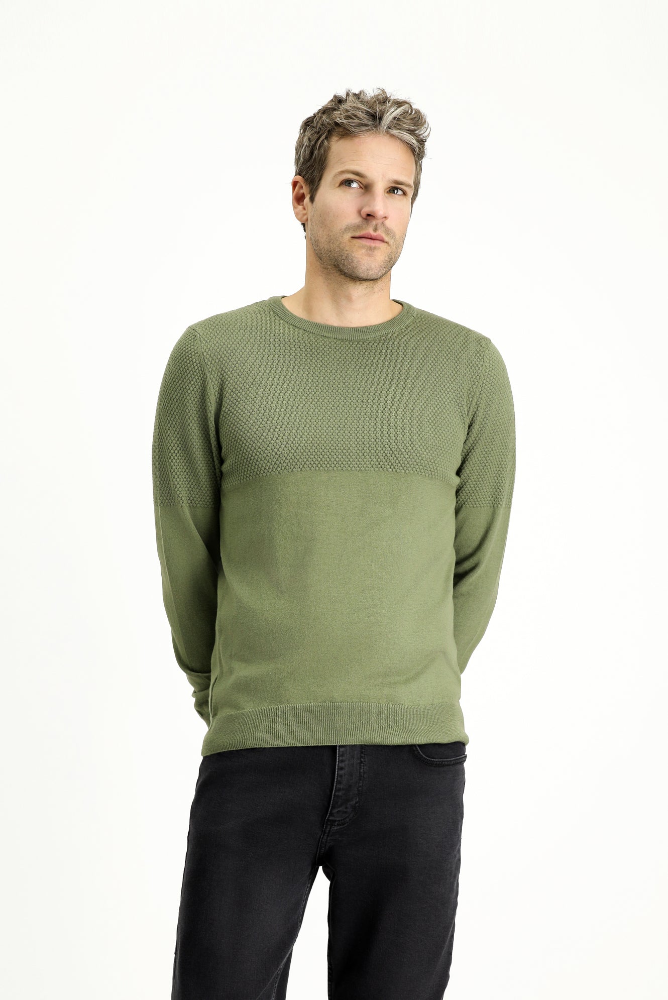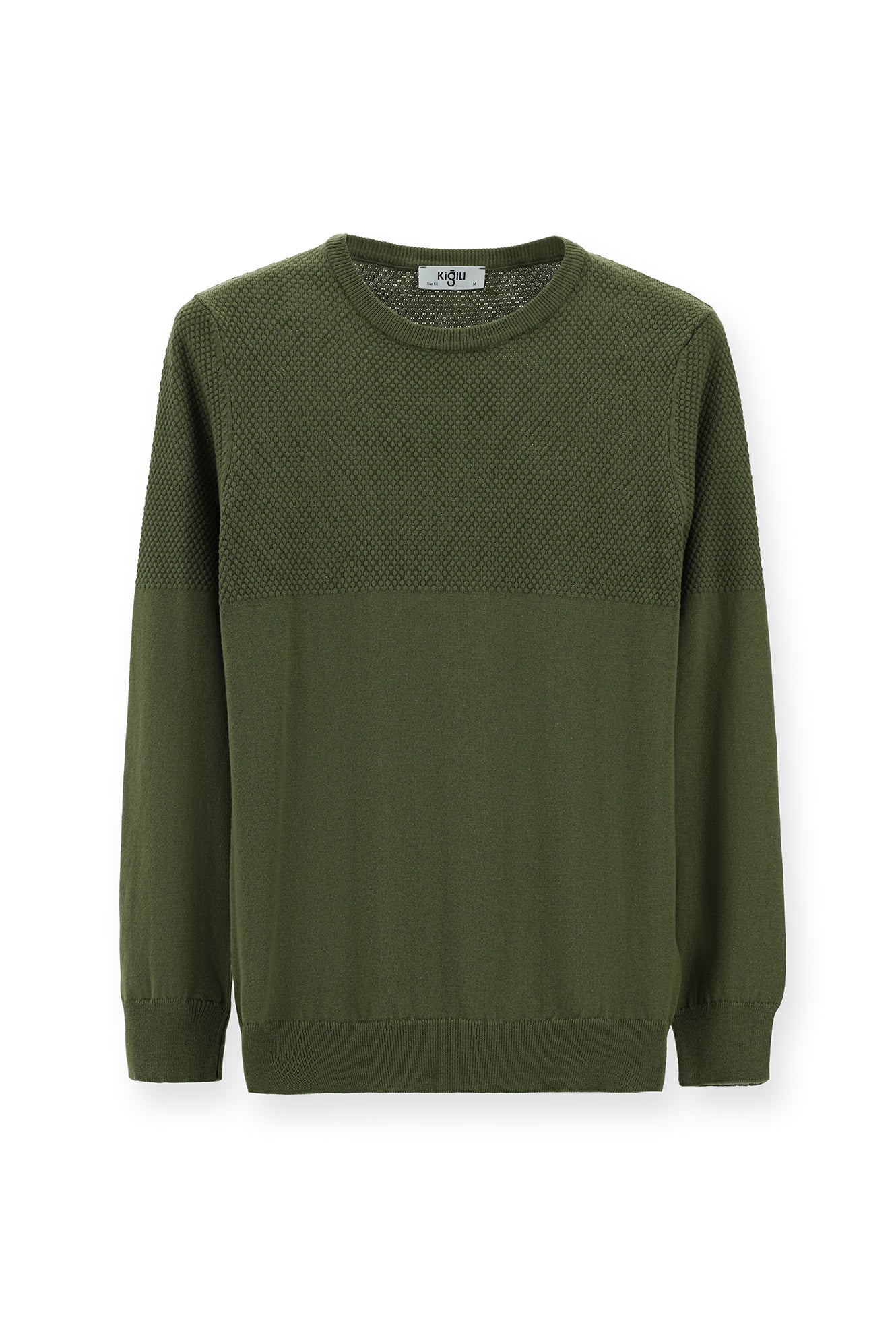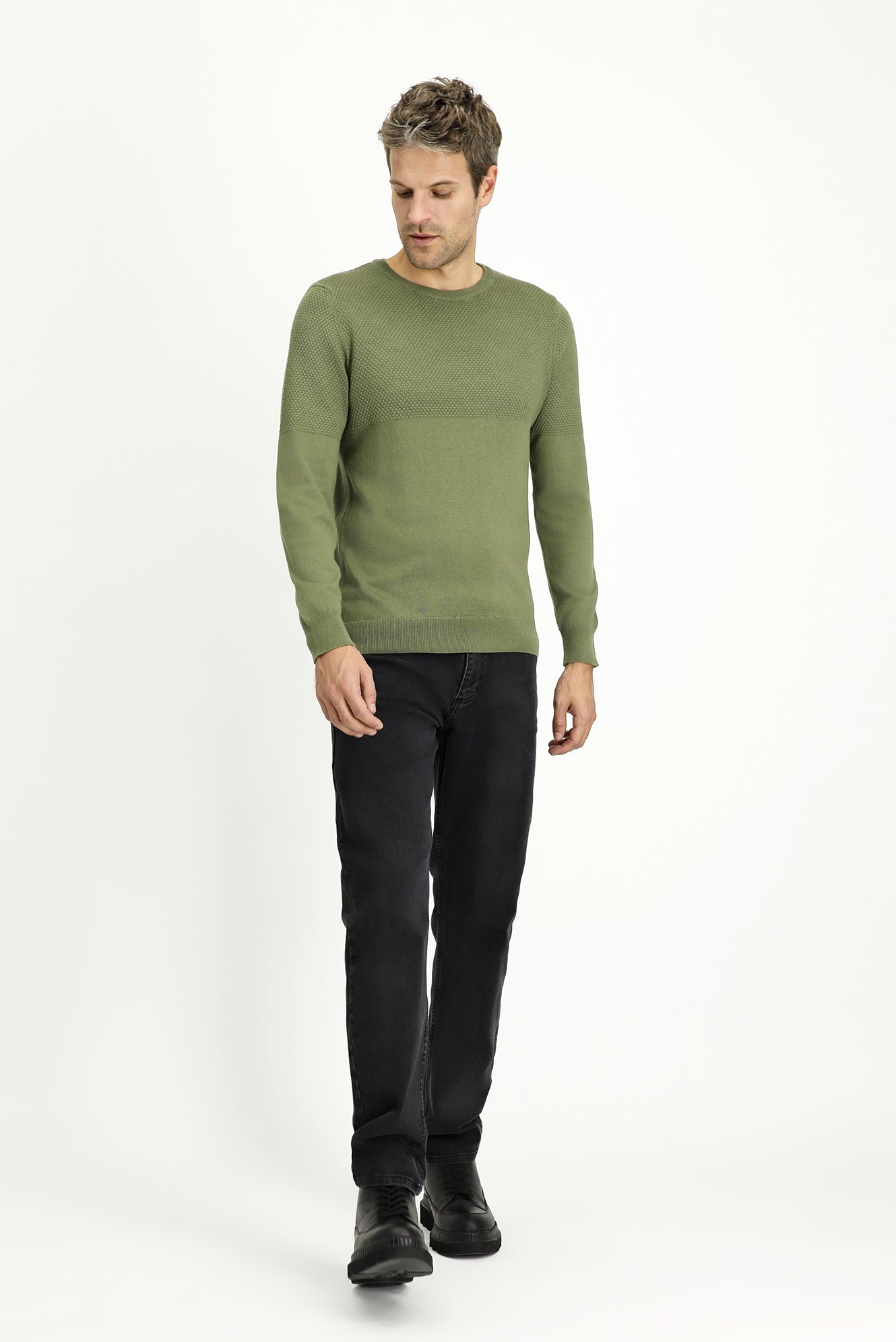 Orta Haki Bisiklet Yaka Slim Fit Dar Kesim Desenli Pamuklu Triko Kazak