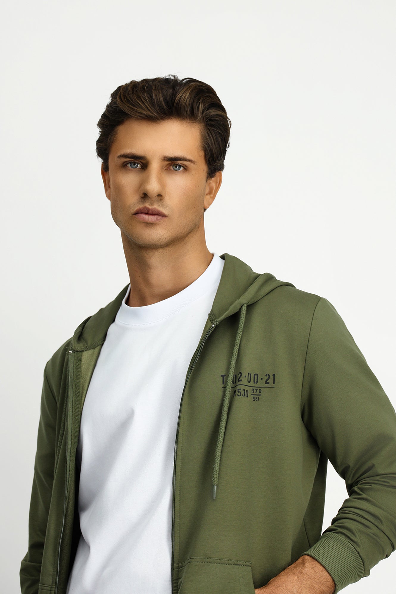 Orta Haki Kapüşonlu Regular Fit Fermuarlı Baskılı Pamuklu Sweatshirt