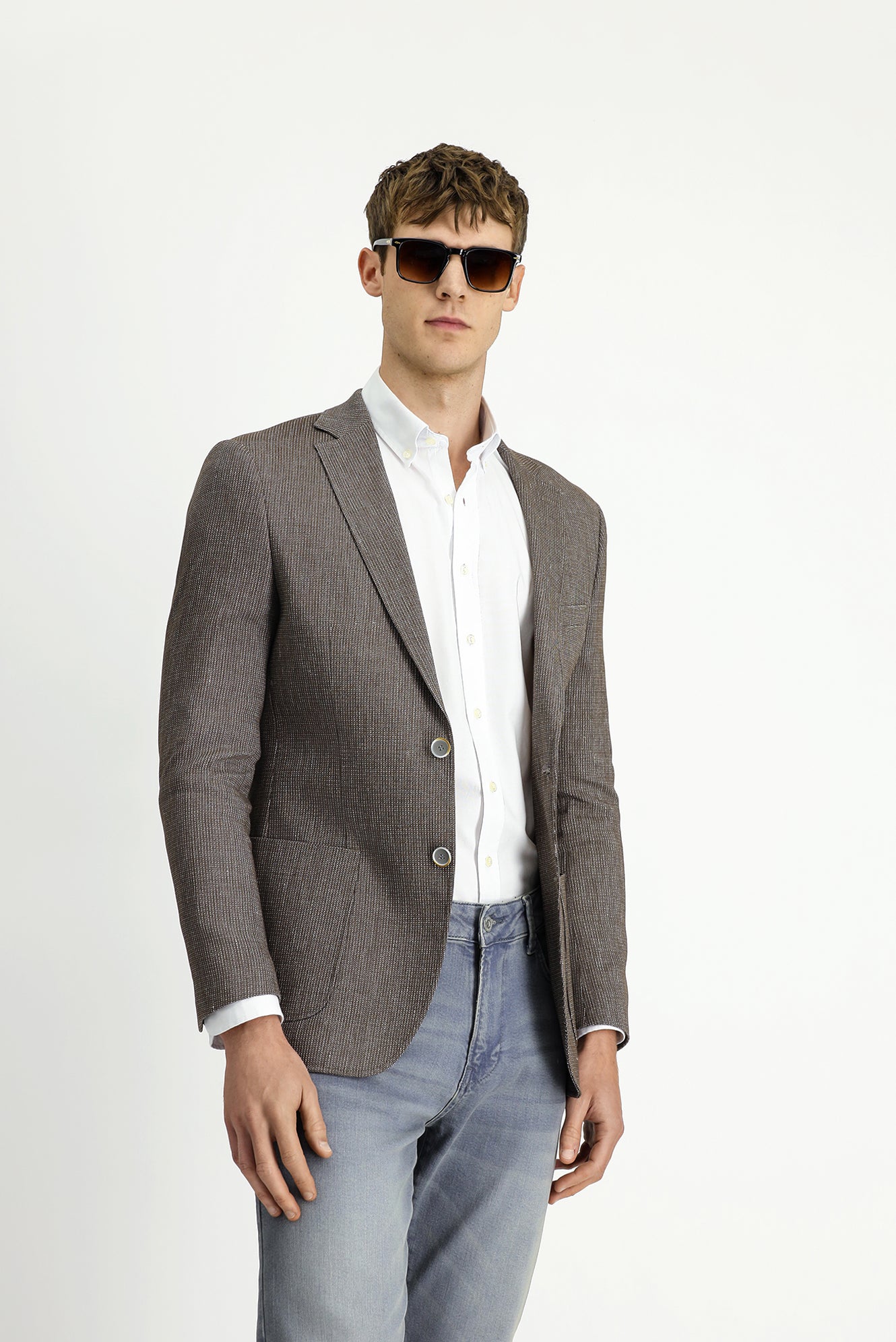 Orta Kahve Muscle Fit Keten Karışımlı Çizgili Spor Ceket