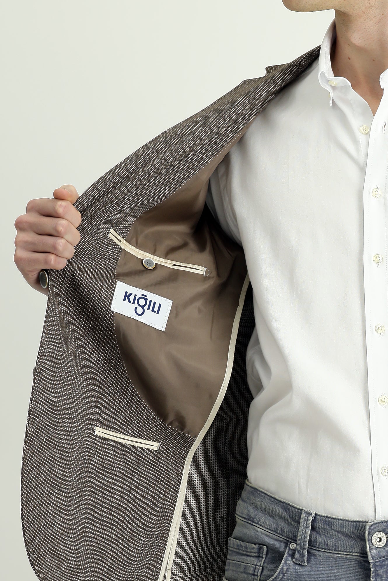 Orta Kahve Relaxed Fit Rahat Kesim Keten Karışımlı Çizgili Spor Ceket