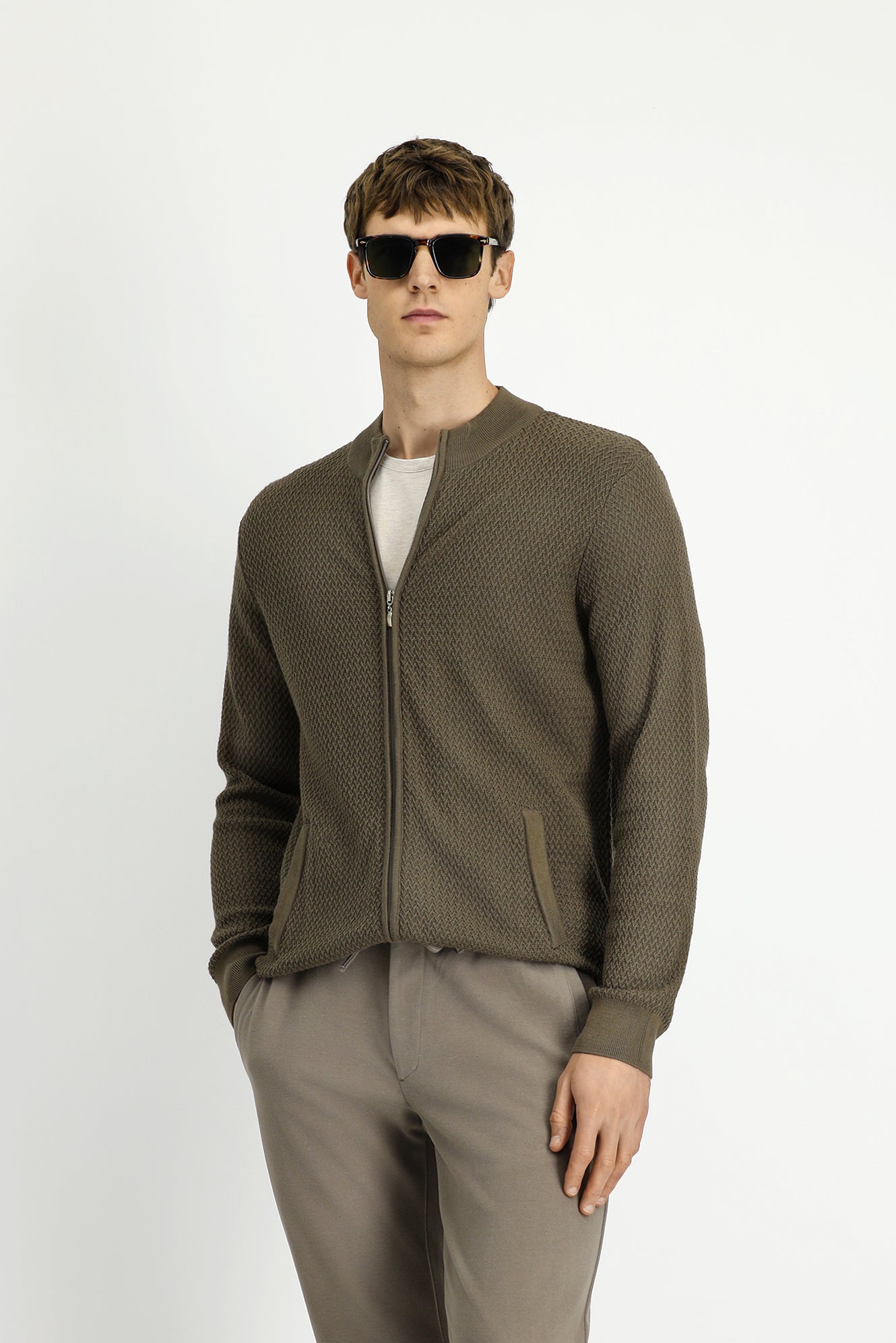 Orta Kahve Slim Fit Dar Kesim Desenli Fermuarlı Pamuklu Triko Hırka