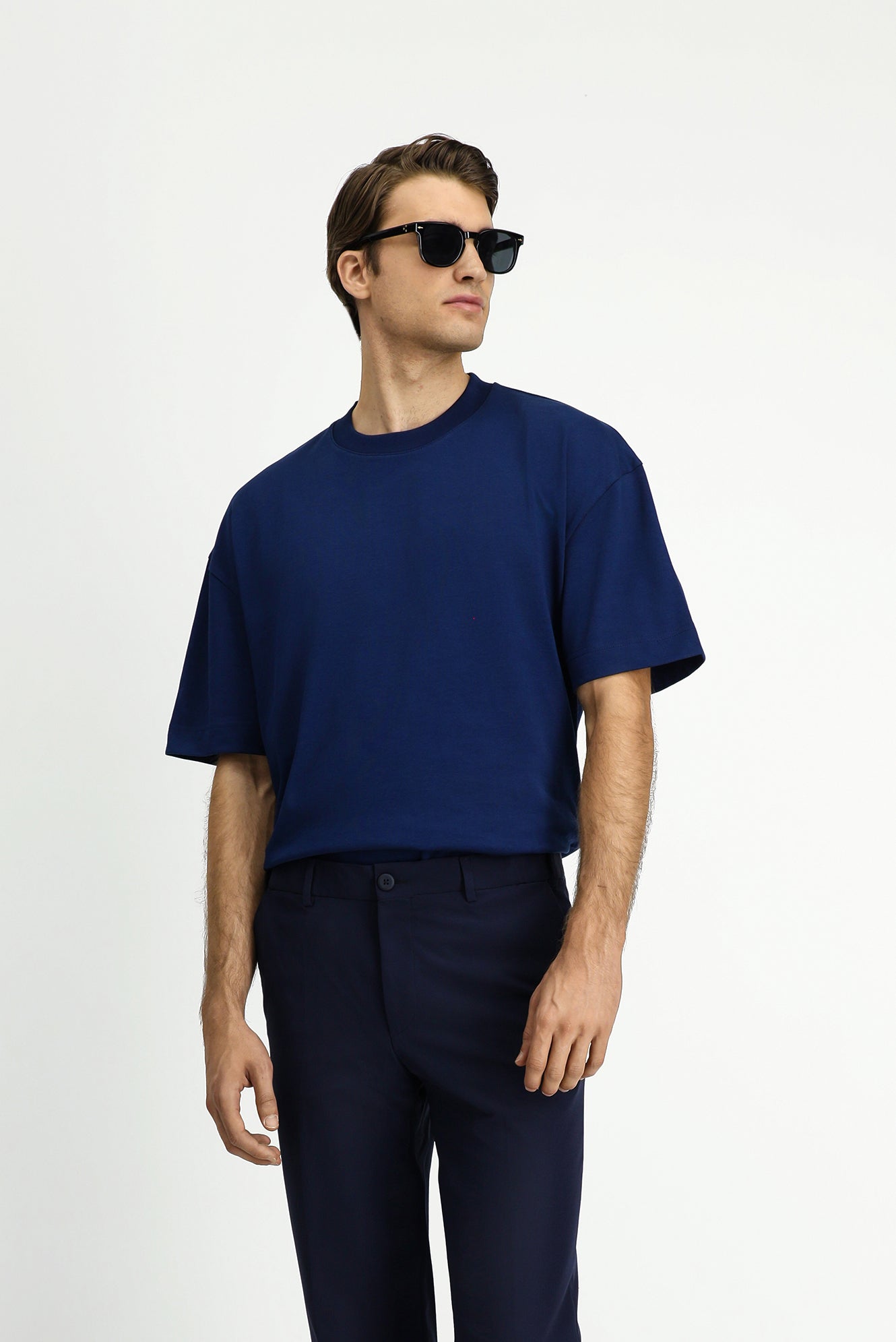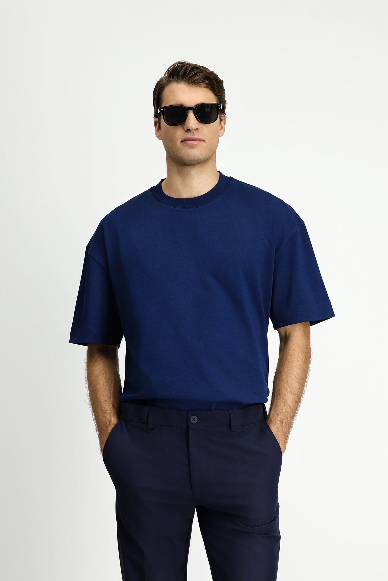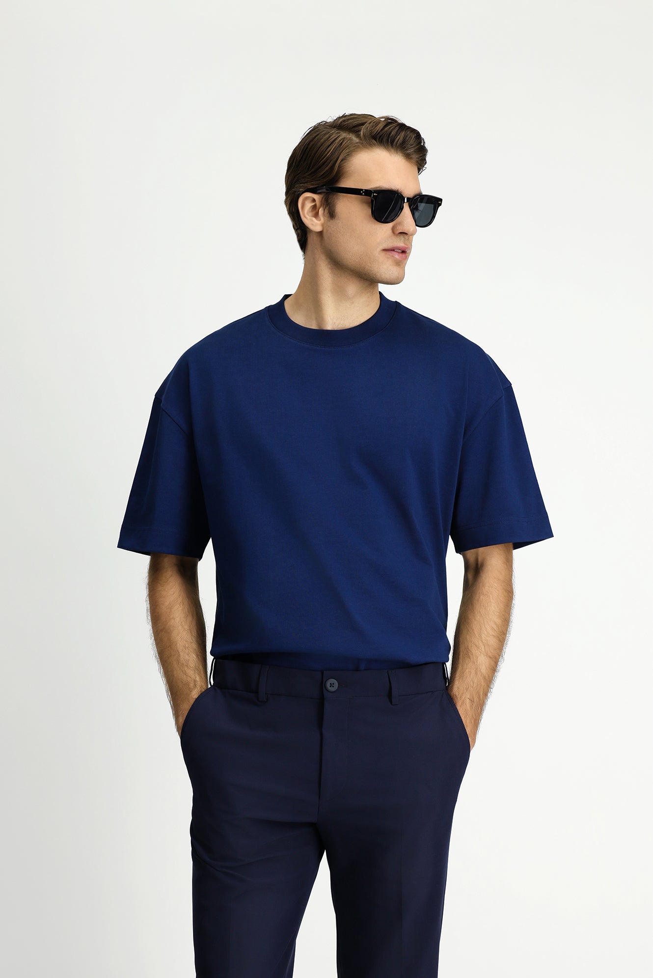 Orta Lacivert Bisiklet Yaka Oversize Ekstra Rahat Kesim Pamuk Tişört