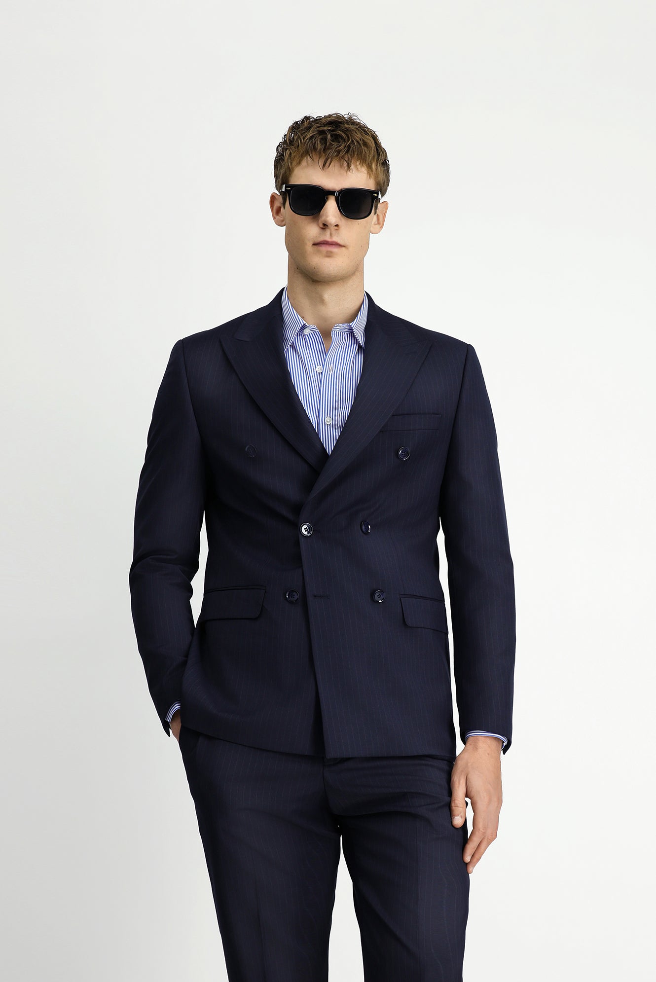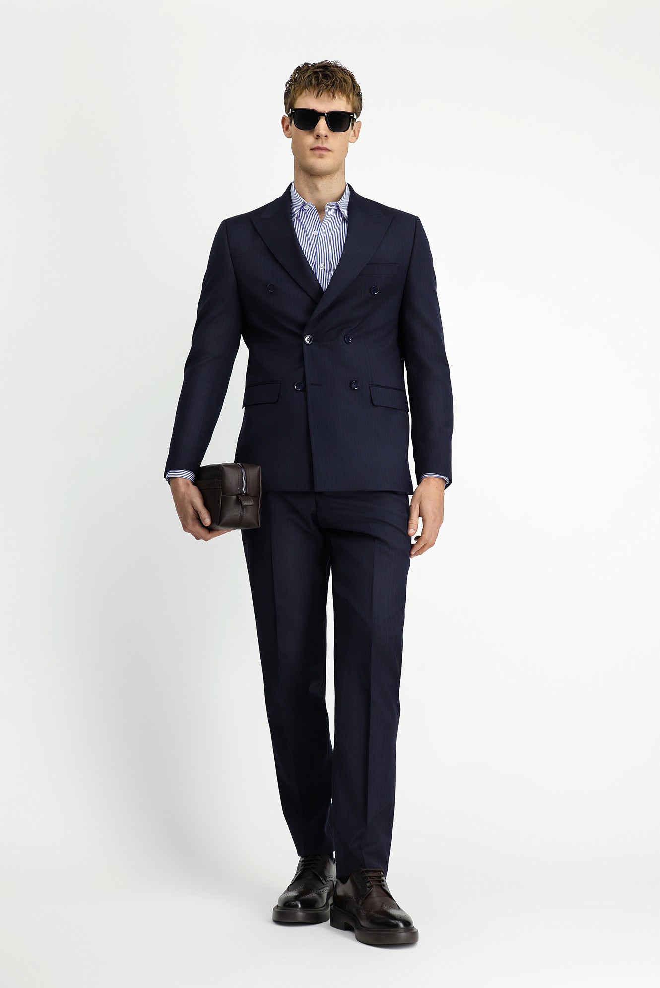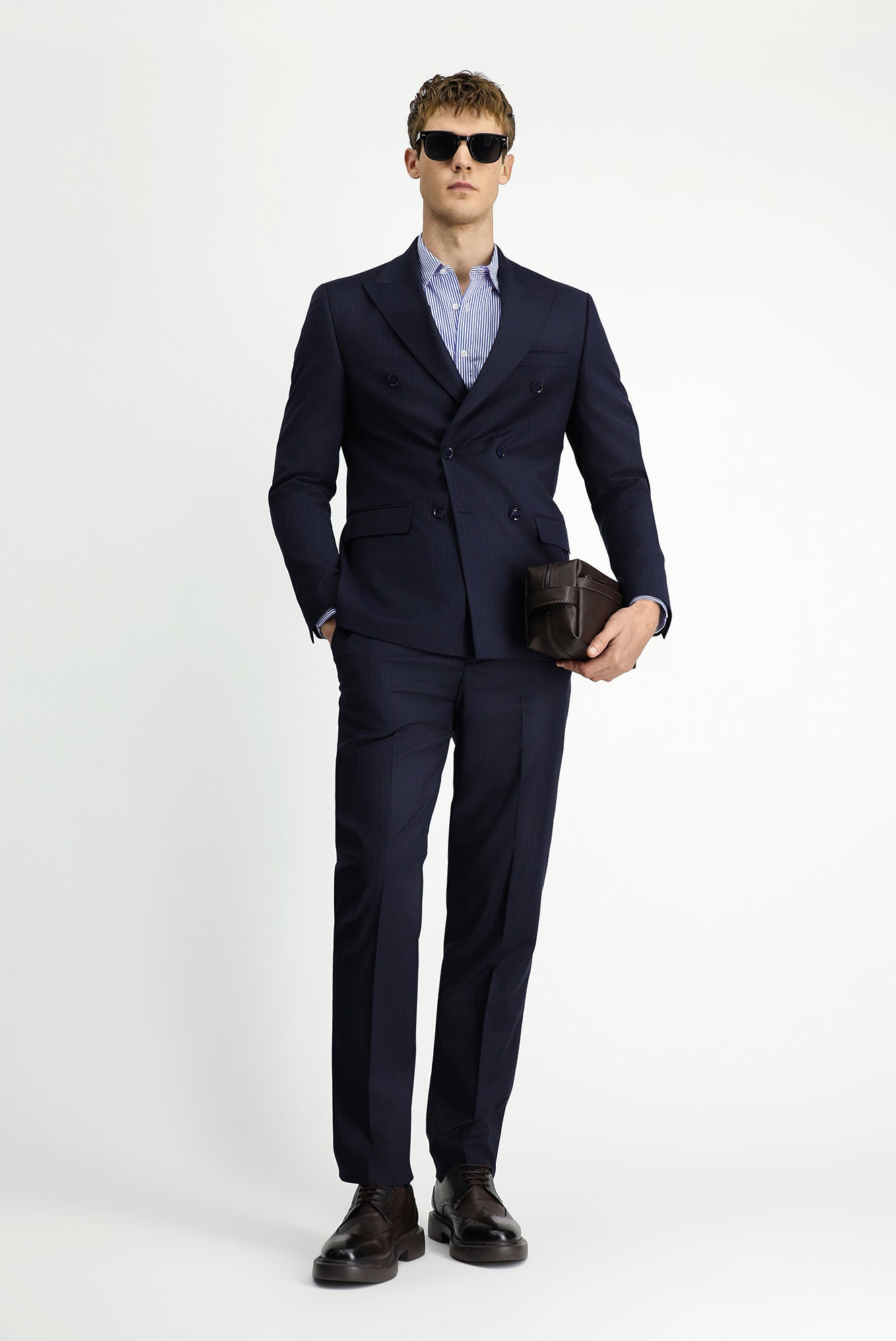 Orta Lacivert Regular Fit Yünlü Çizgili Kruvaze Takım Elbise