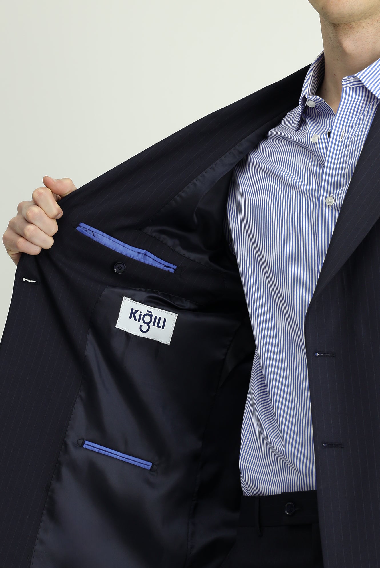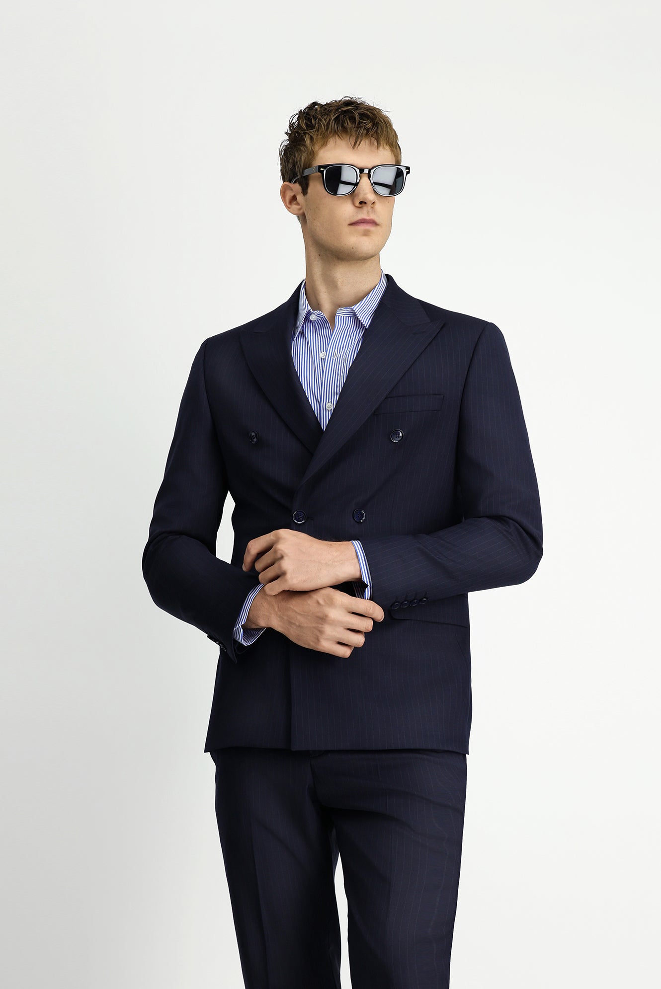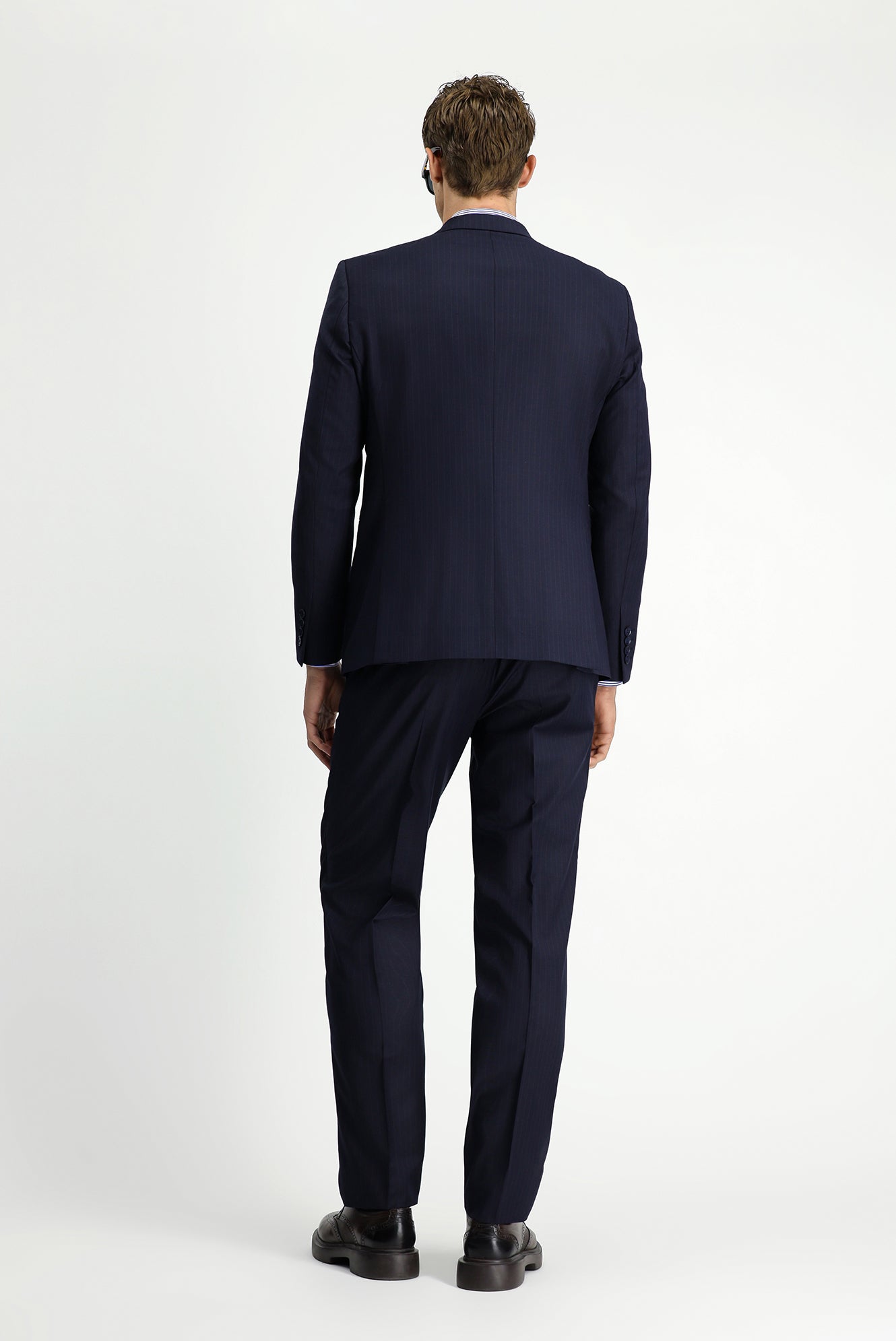 Orta Lacivert Regular Fit Yünlü Çizgili Kruvaze Takım Elbise