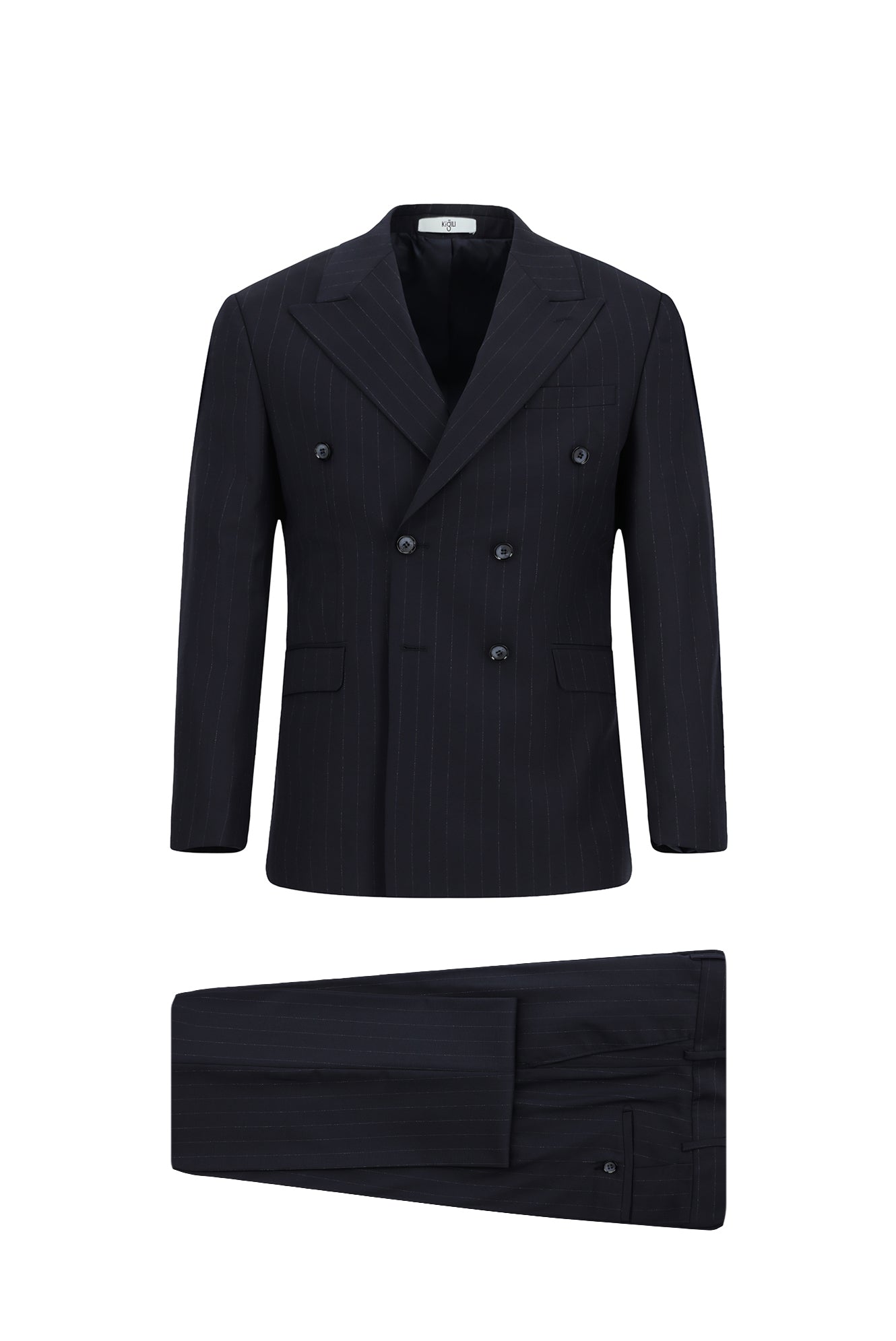 Orta Lacivert Regular Fit Çizgili Yünlü Kruvaze Takım Elbise