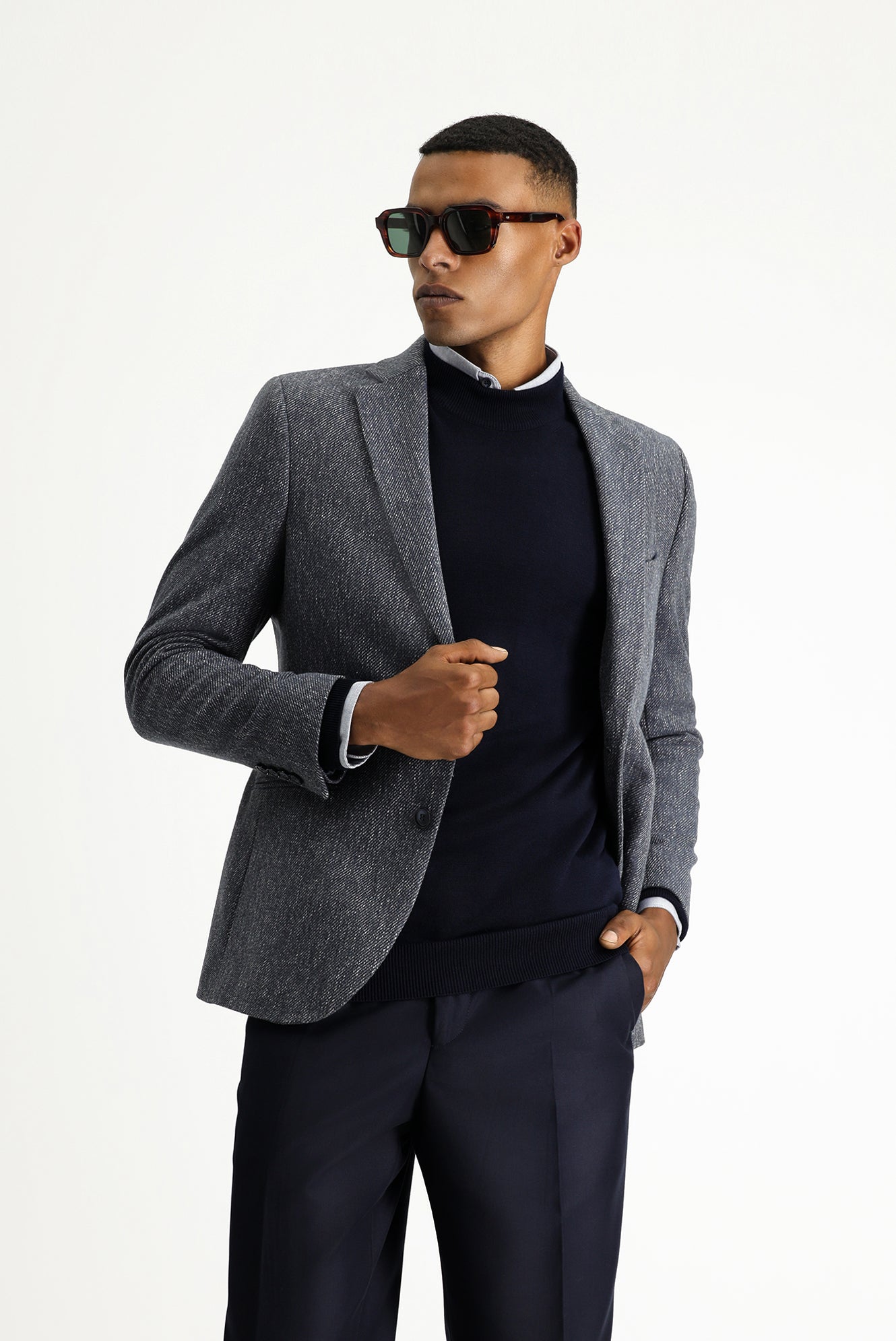 Orta Lacivert Relaxed Fit Rahat Kesim Yünlü Klasik Desenli Ceket