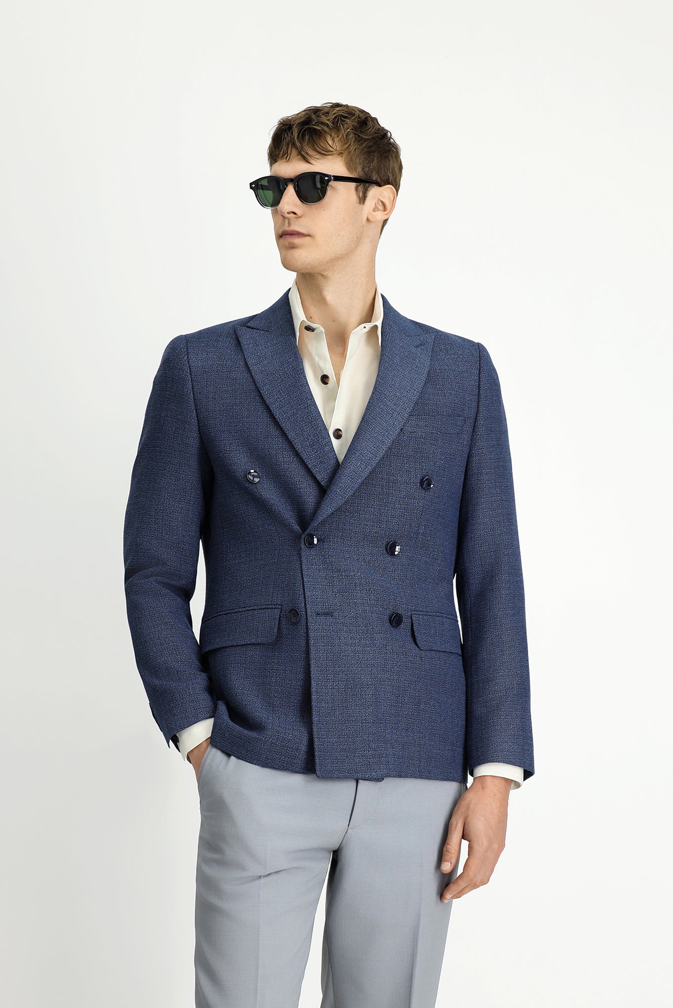 Orta Lacivert Super Slim Fit Ekstra Dar Kesim Desenli Kruvaze Ceket