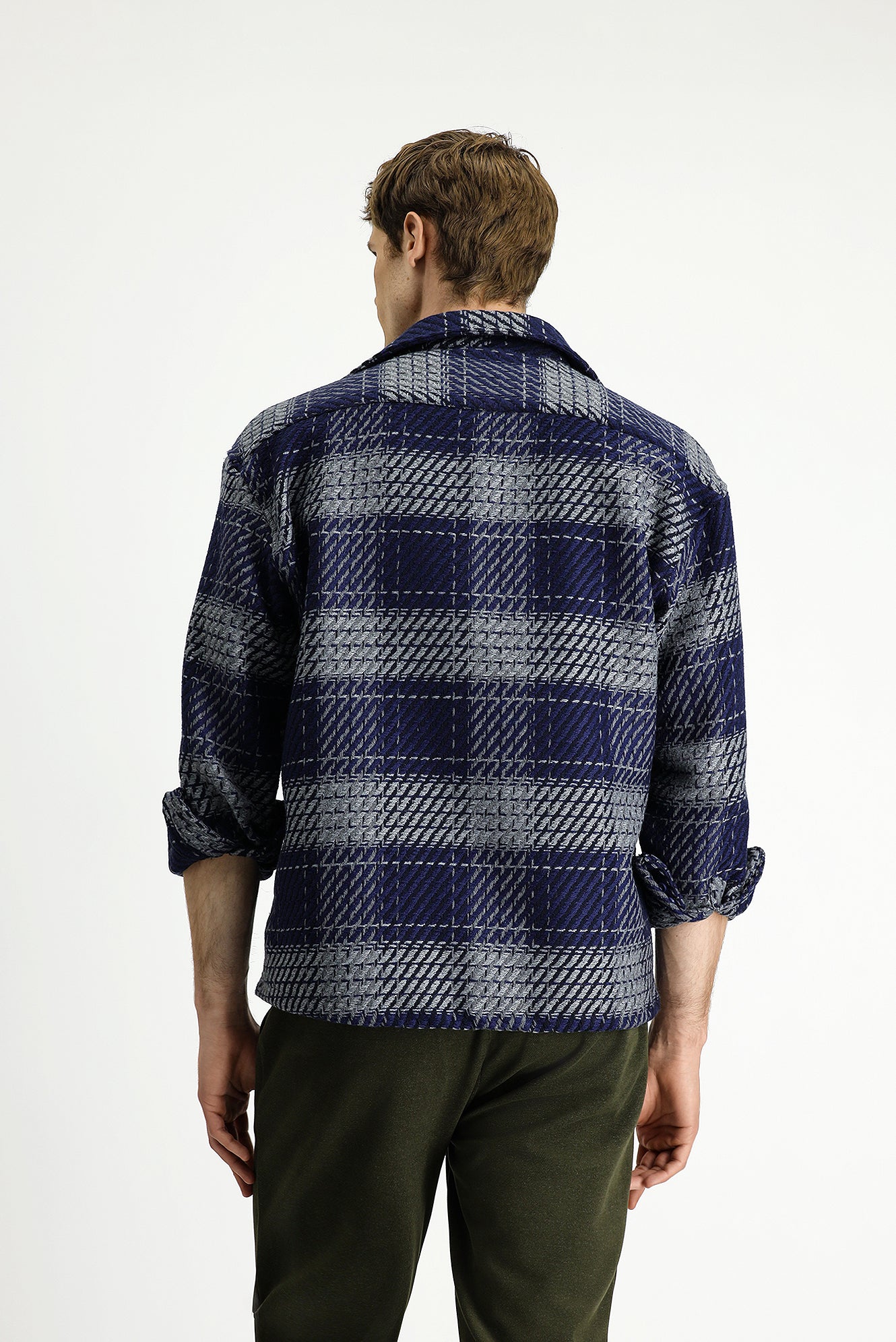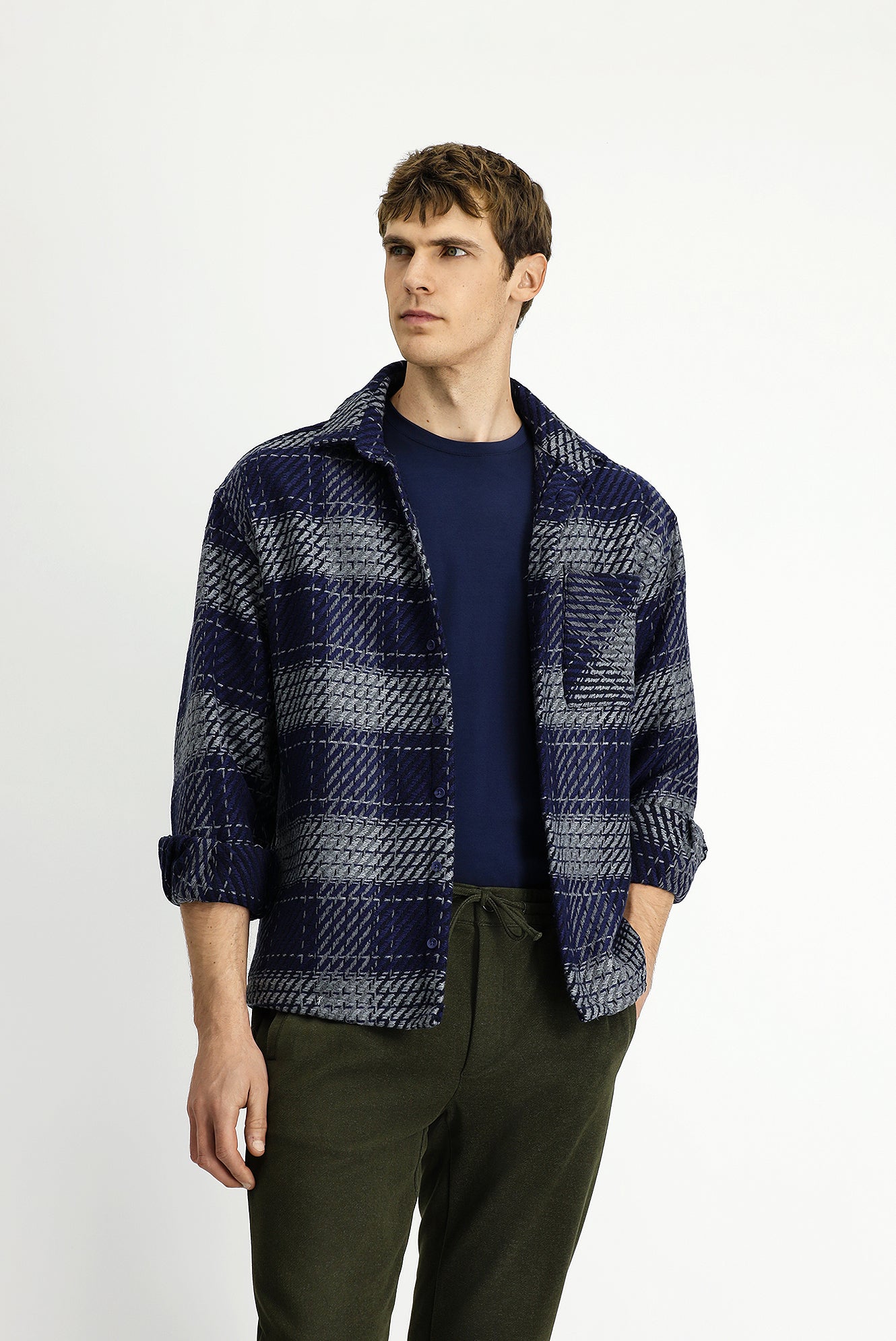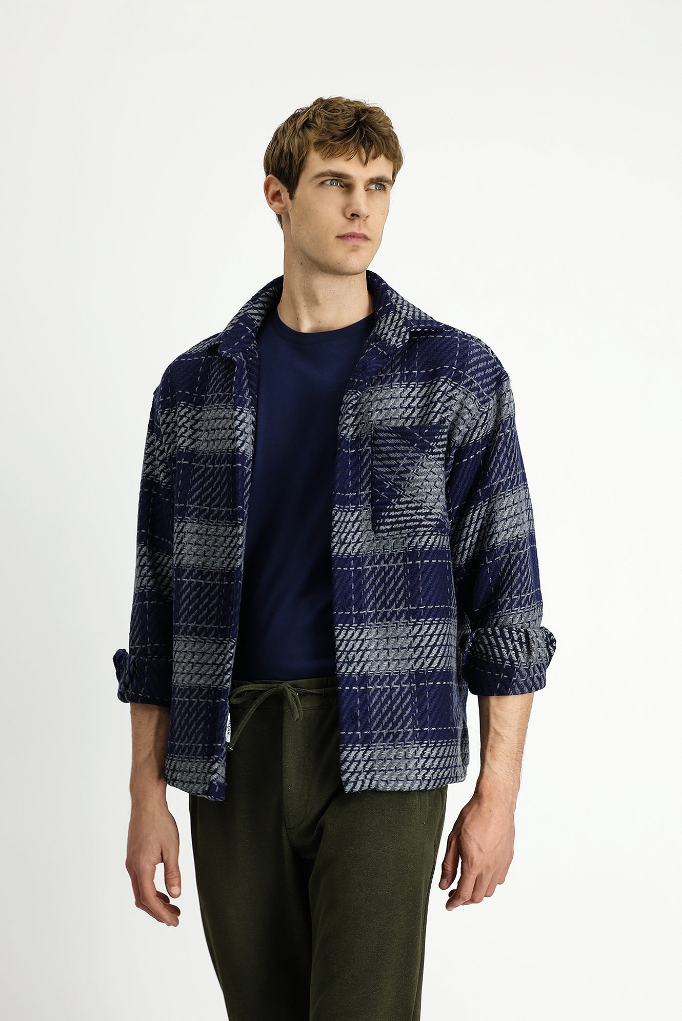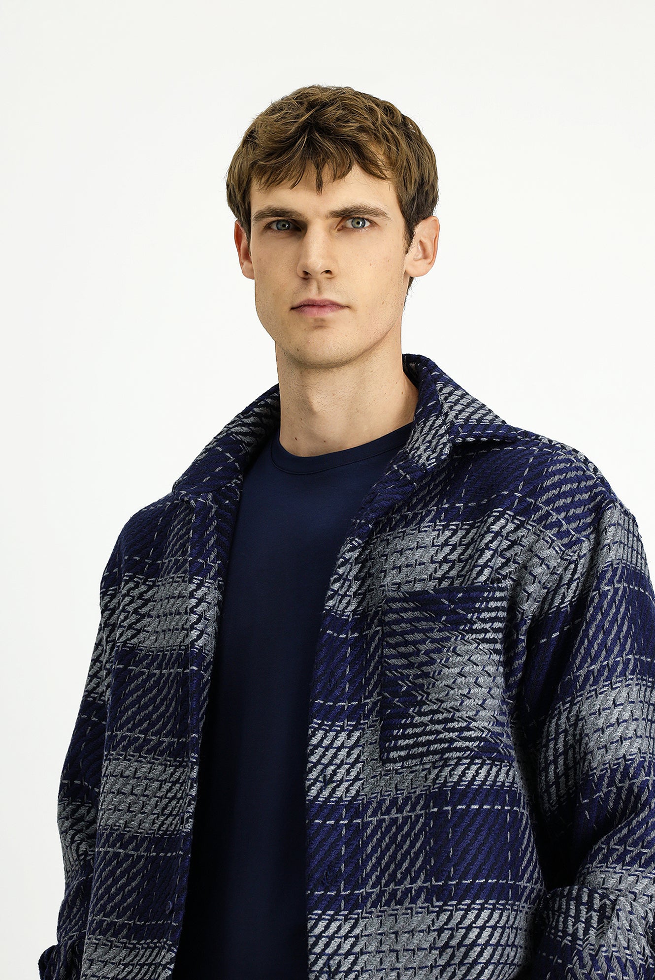 Orta Lacivert Uzun Kol Oversize Ekstra Rahat Kesim Spor Pamuklu Ekose Shacket Oduncu Gömlek / Mont