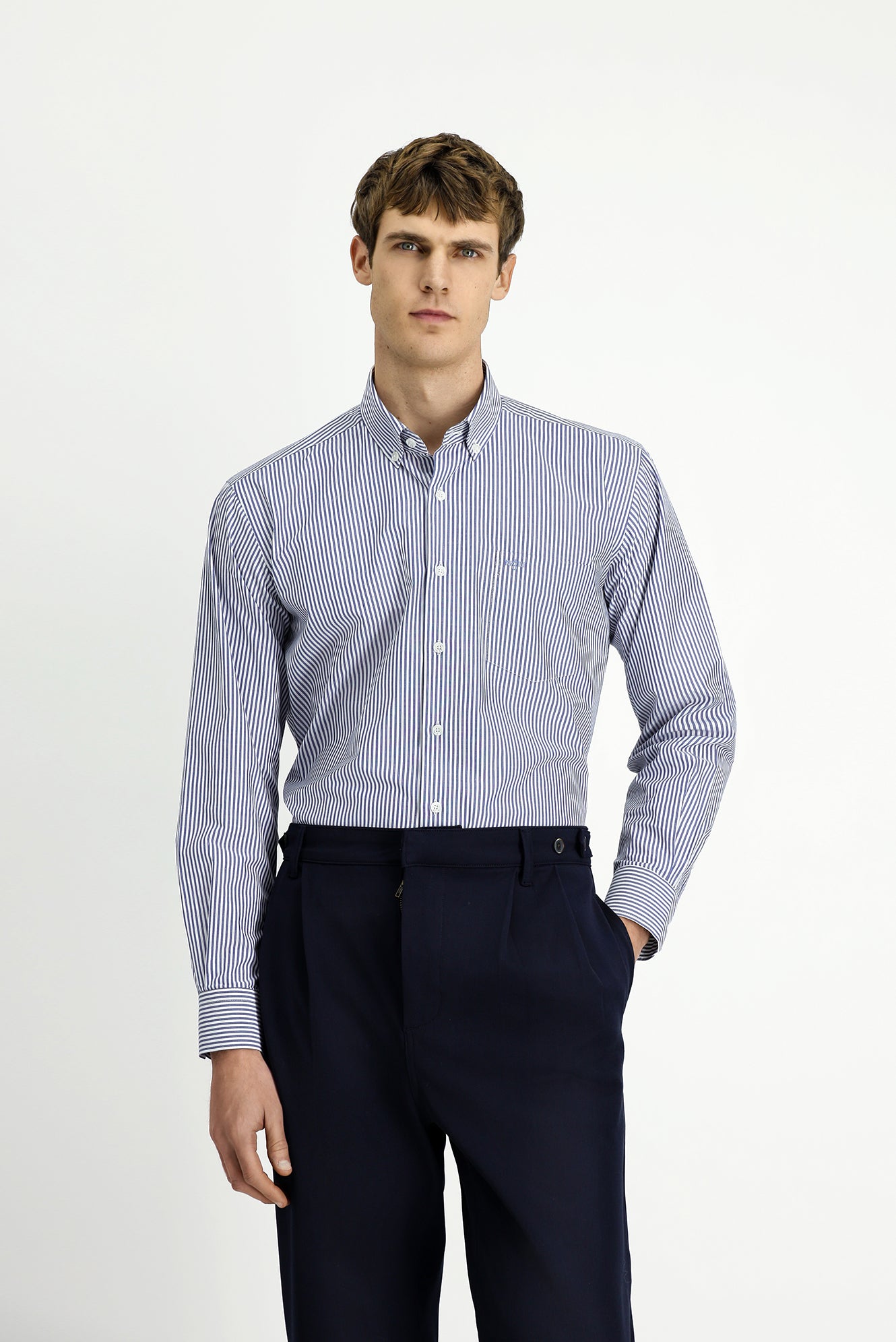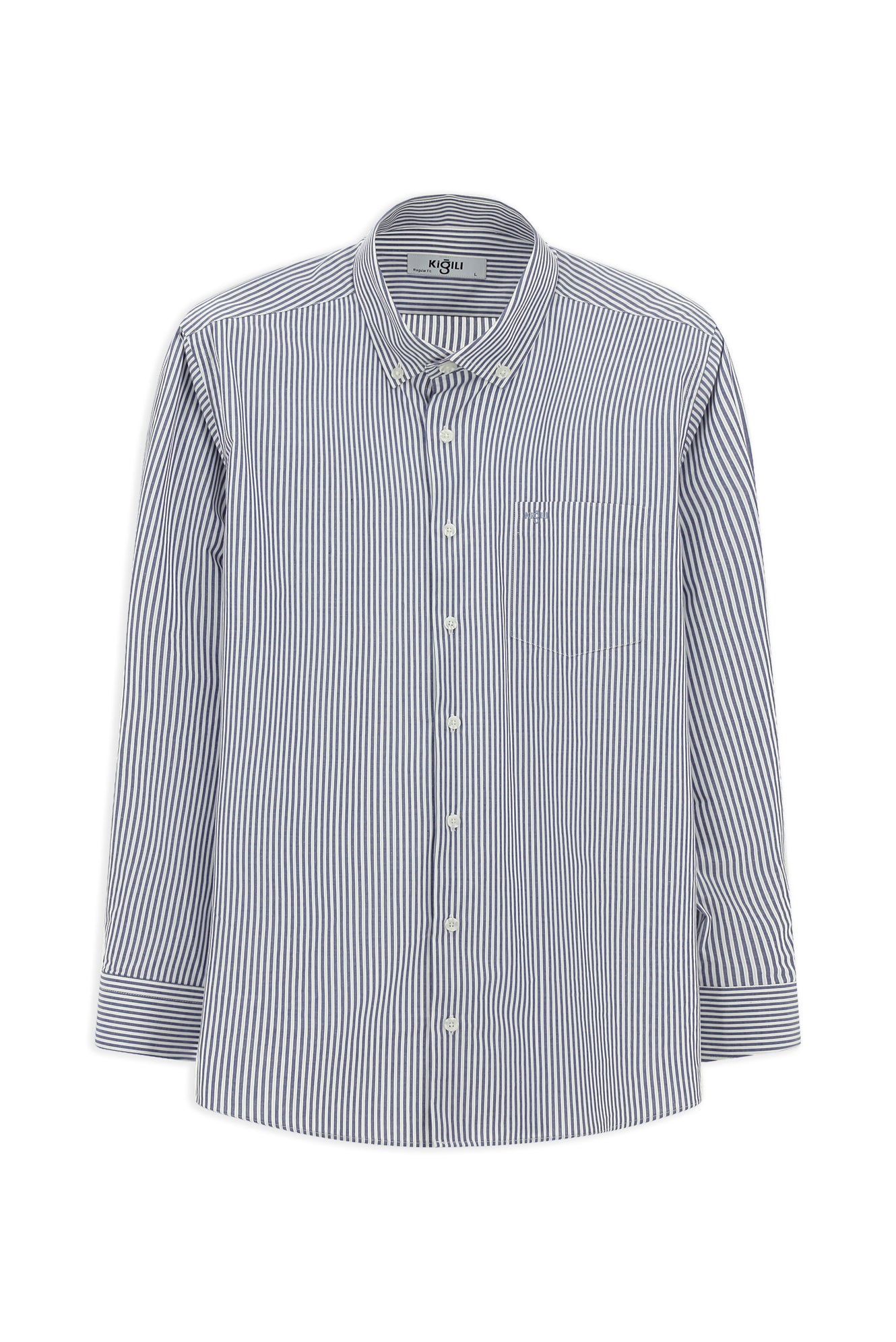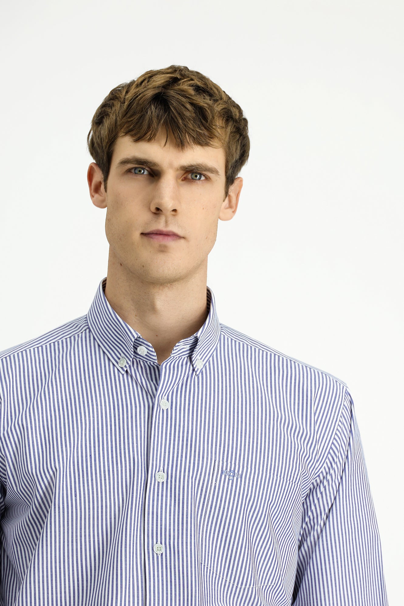 Orta Lacivert Uzun Kol Regular Fit Çizgili Düğmeli Yaka Pamuklu Kolay Ütülenebilir Gömlek