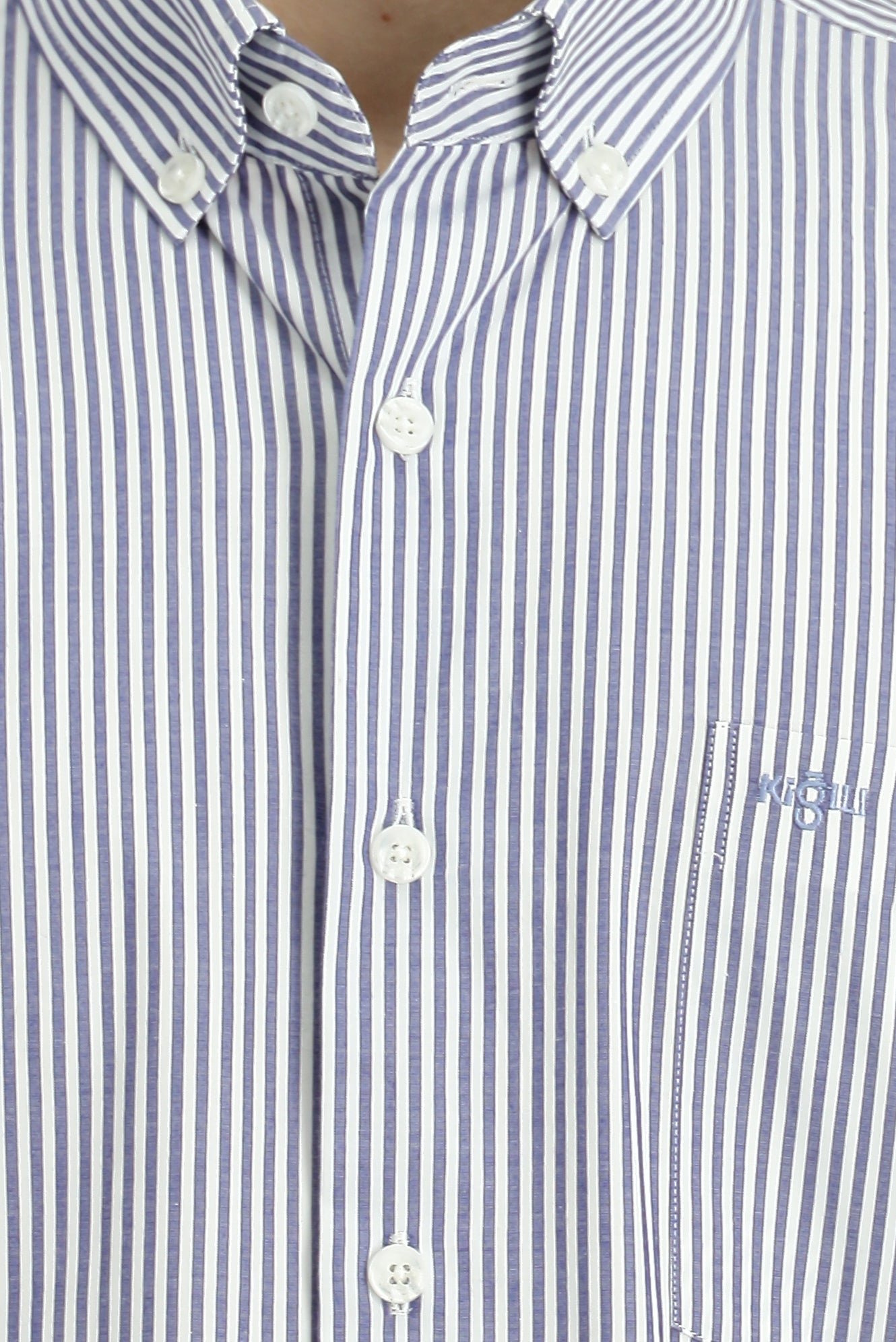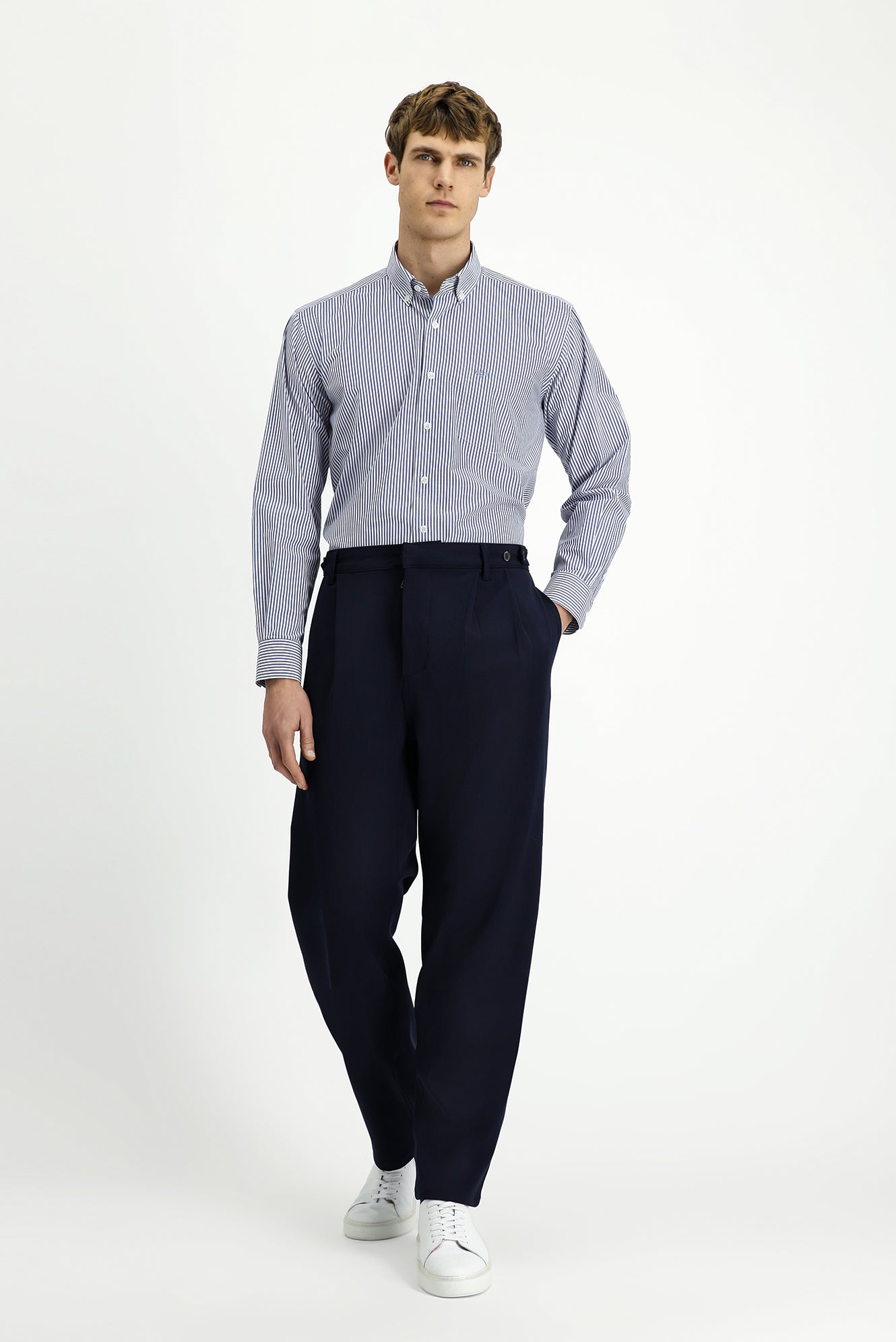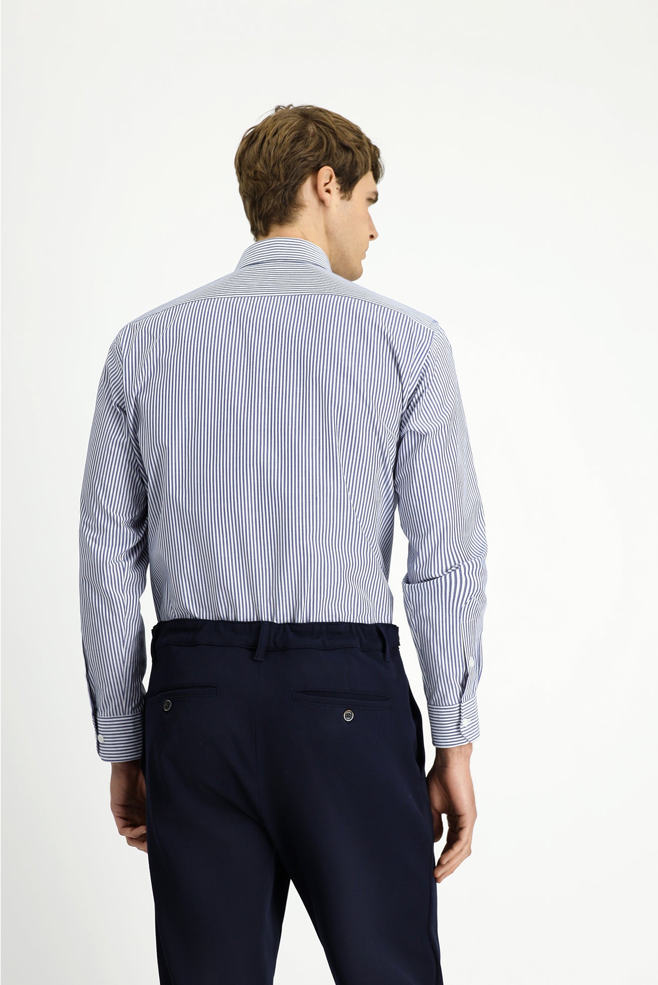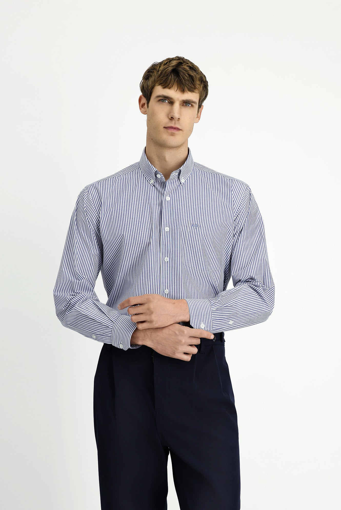 Orta Lacivert Uzun Kol Regular Fit Çizgili Düğmeli Yaka Pamuklu Kolay Ütülenebilir Gömlek